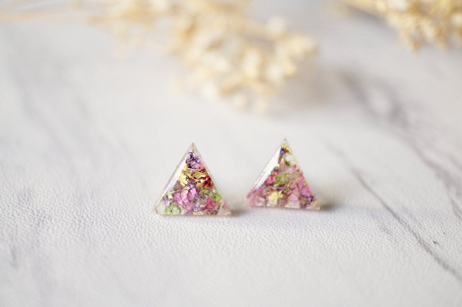 Real Dried Flowers and Resin Triangle Stud Earrings in Pink Yellow Purple Green