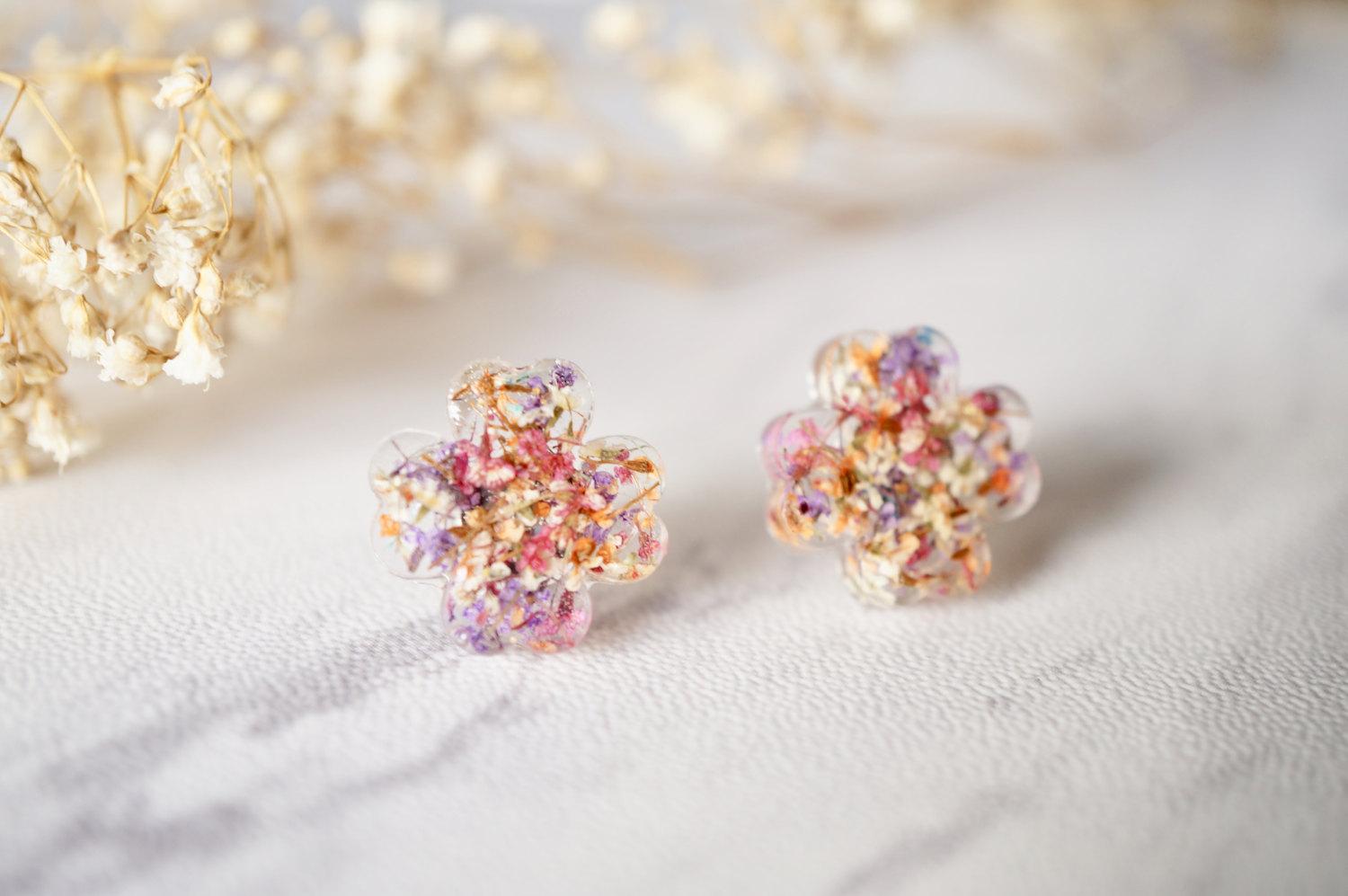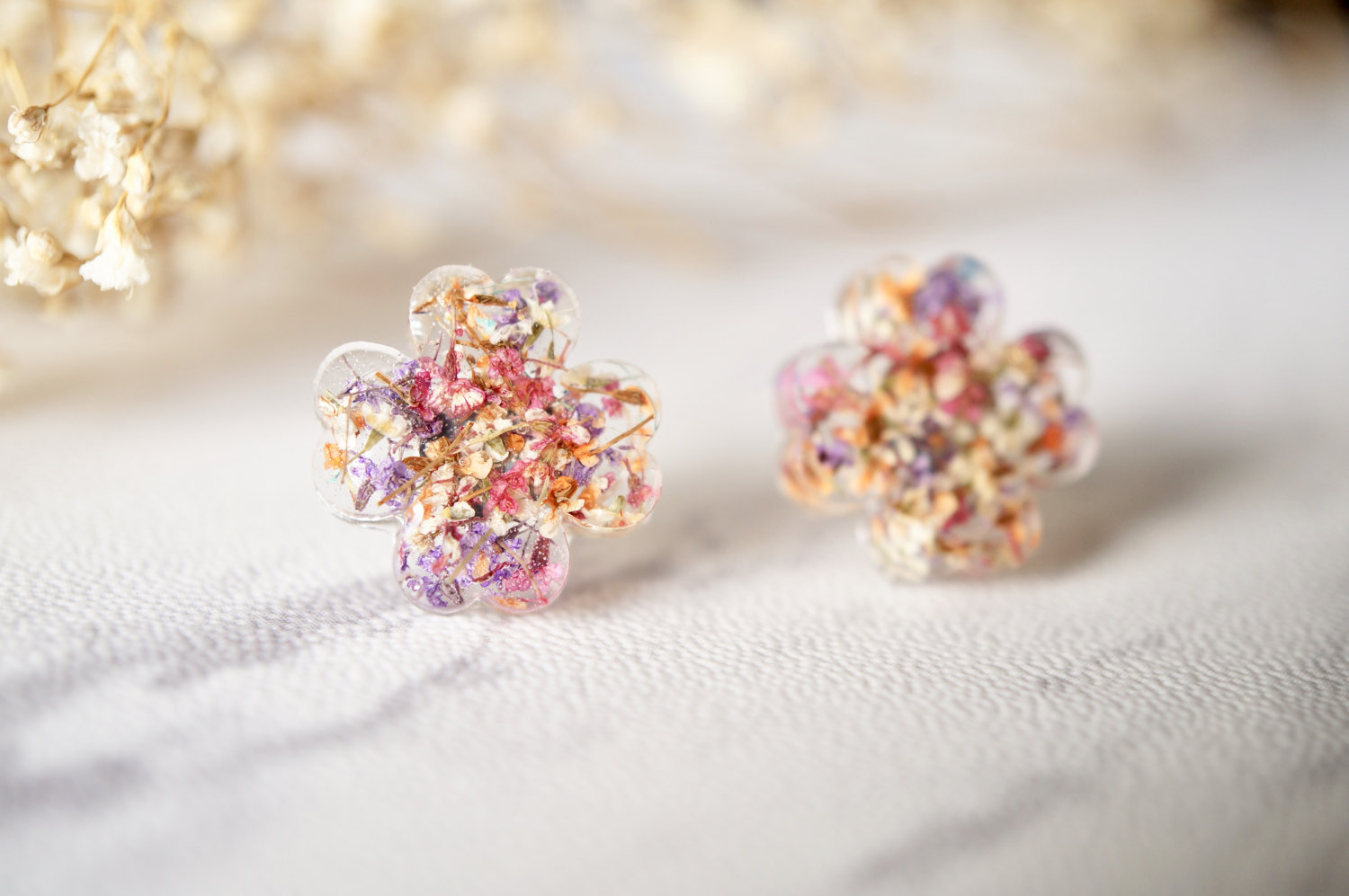 Real Dried Flowers and Resin Clover Stud Earrings in Pink Purple White Orange