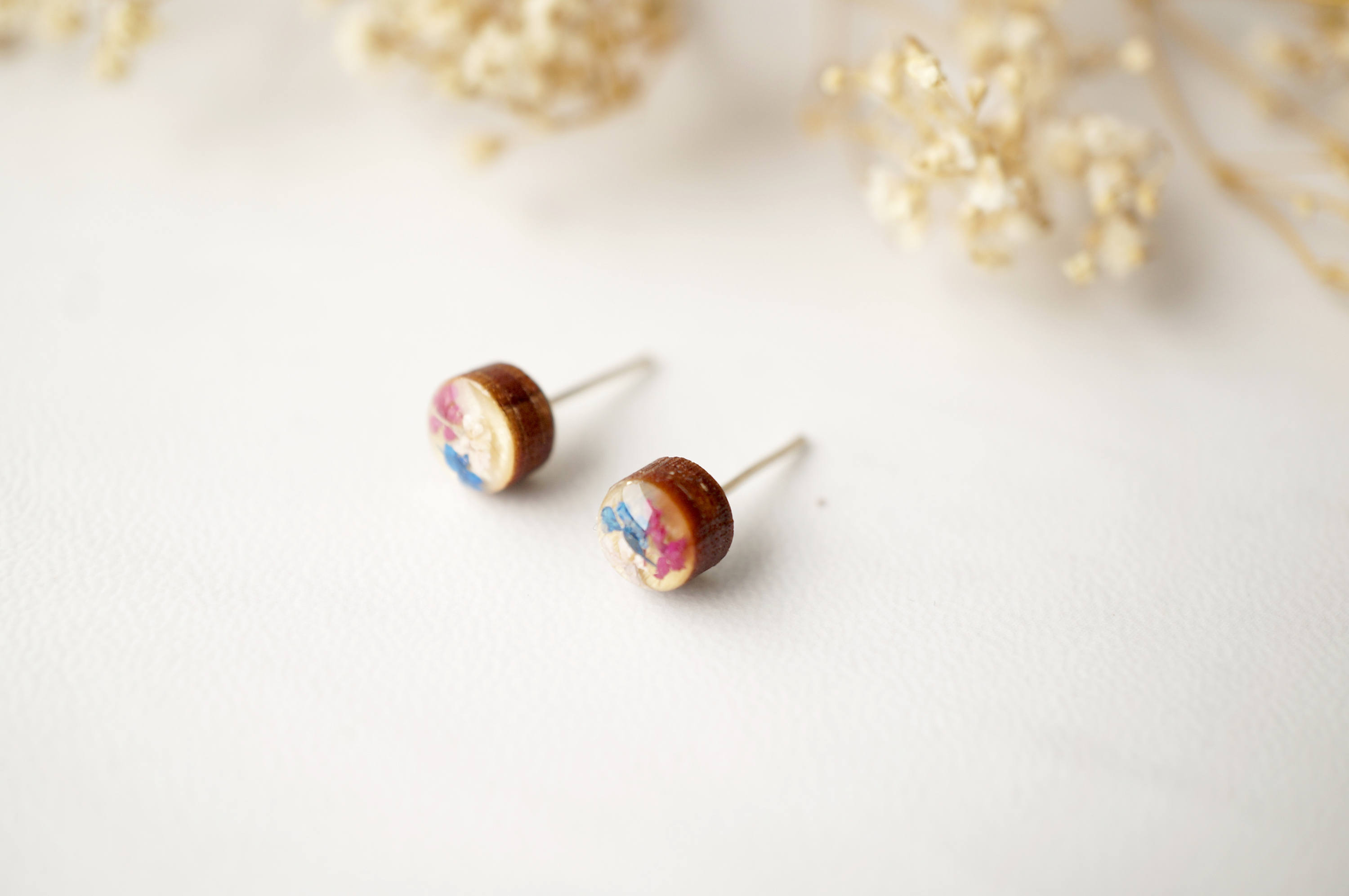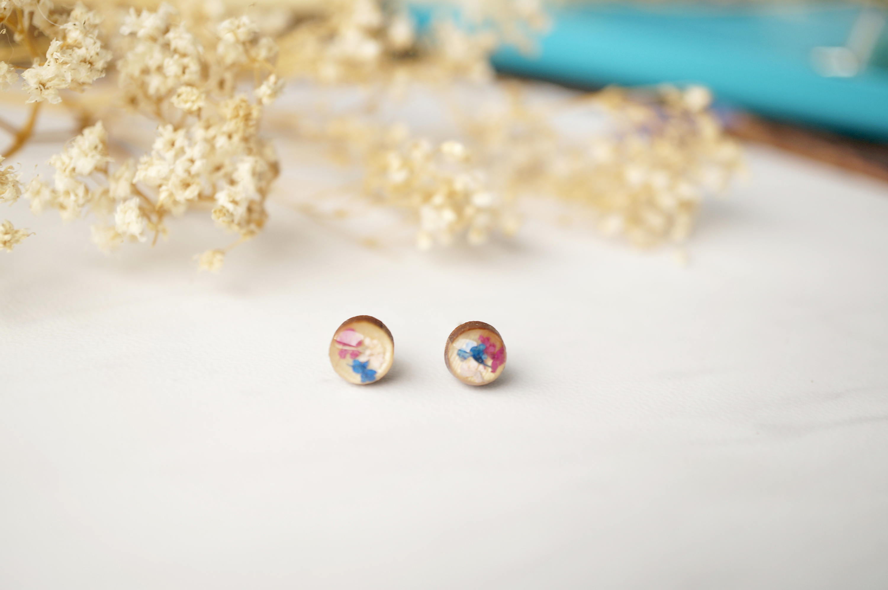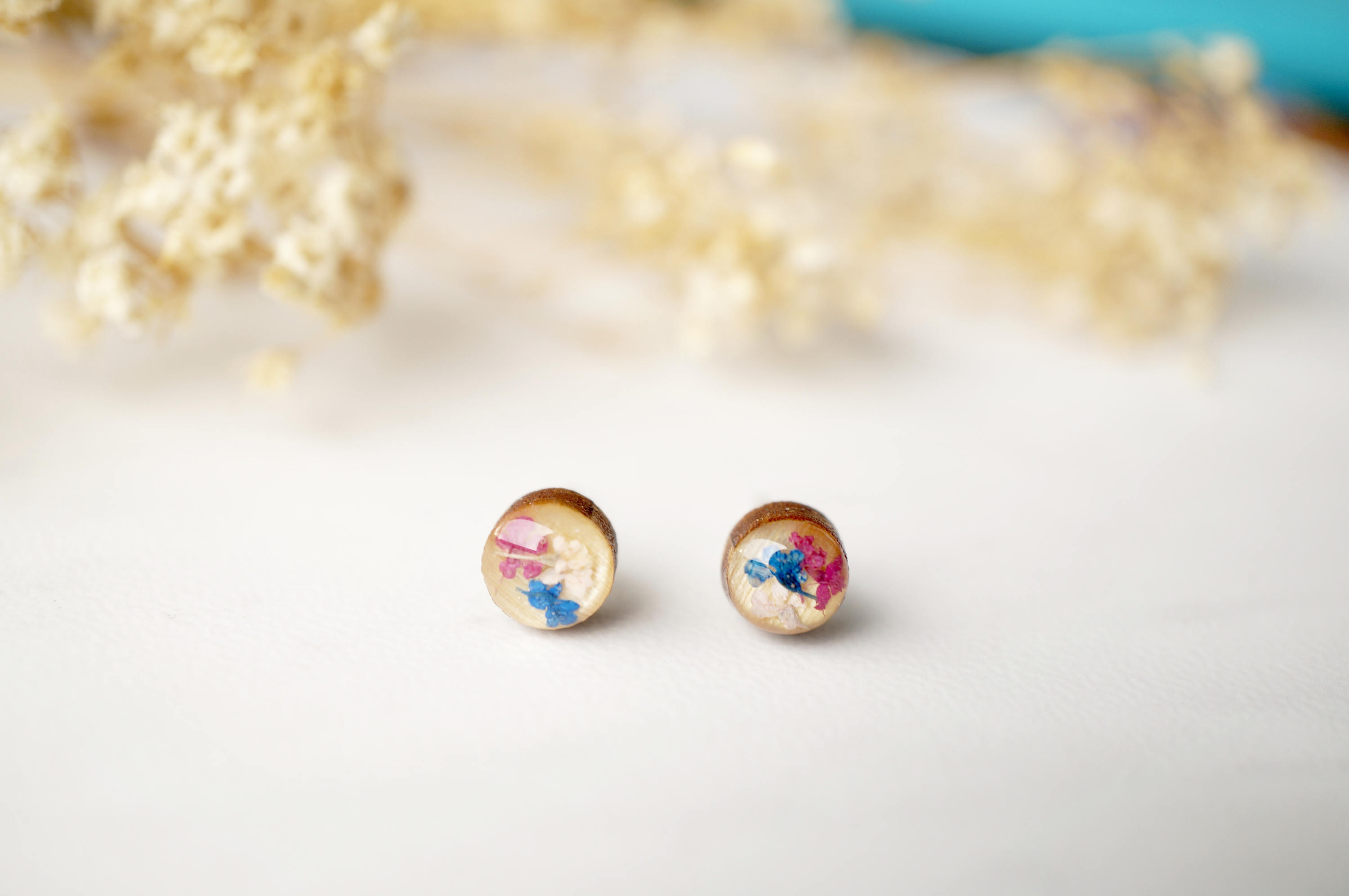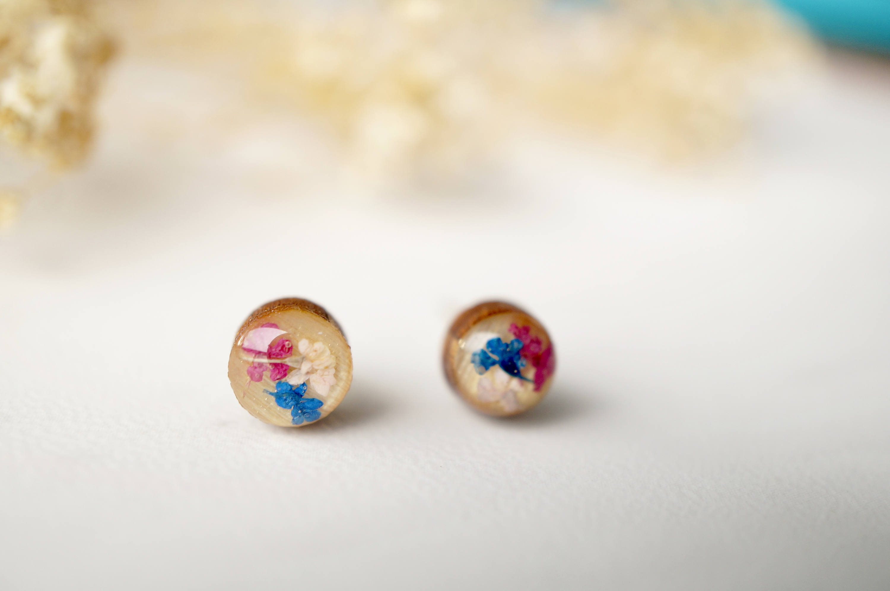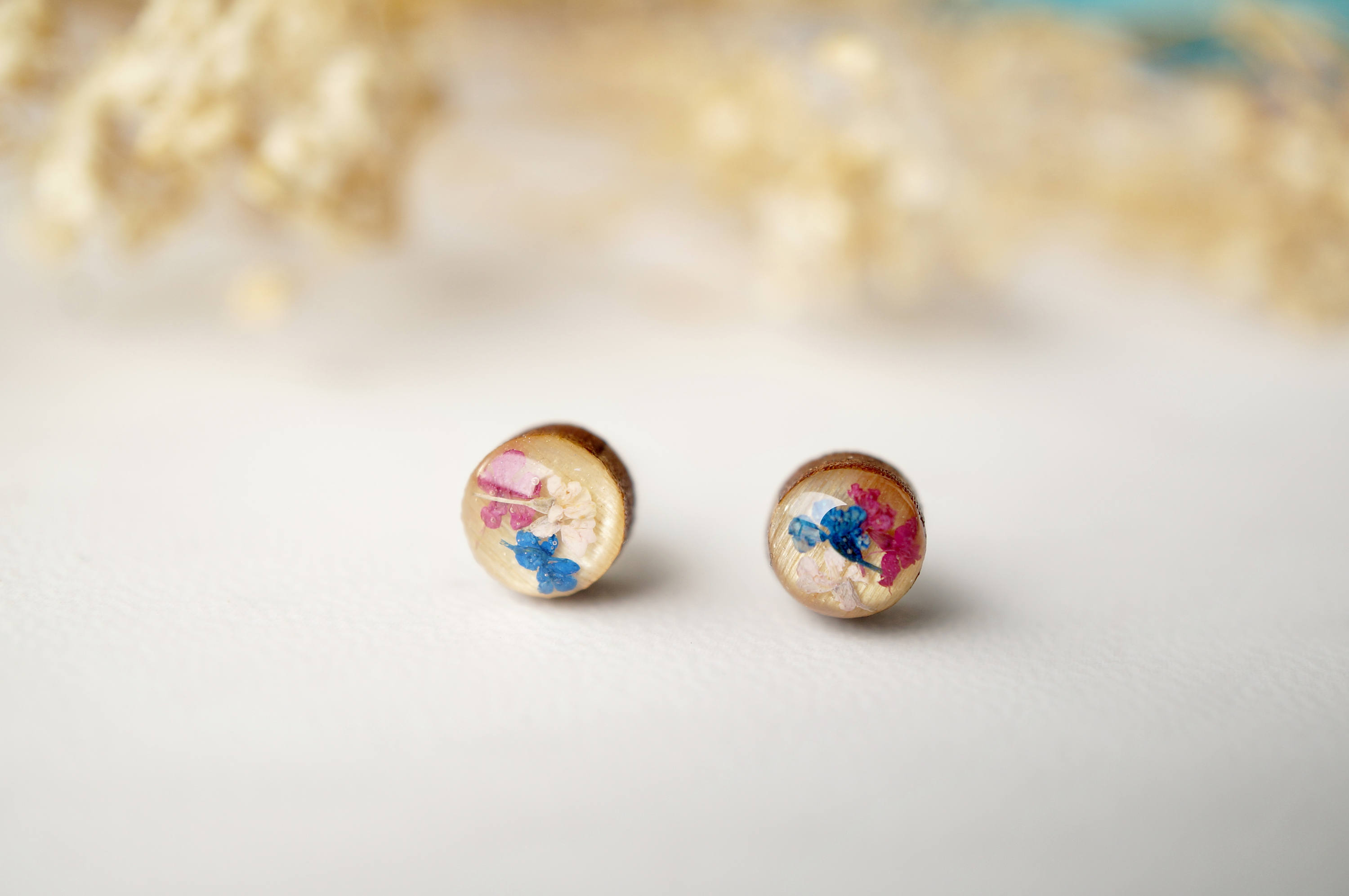 Real Dried Flowers and Resin on Wood Stud Earrings in Pink and Blue