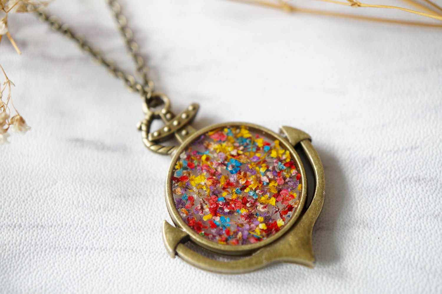 This necklace is handmade with real pressed flowers encased in resin. Surrounded by a beautiful metal bronze frame, this necklace is like wearing a piece of nature. Each piece is one of a kind. Sometimes we will use the same color combination, but no two are exactly alike!