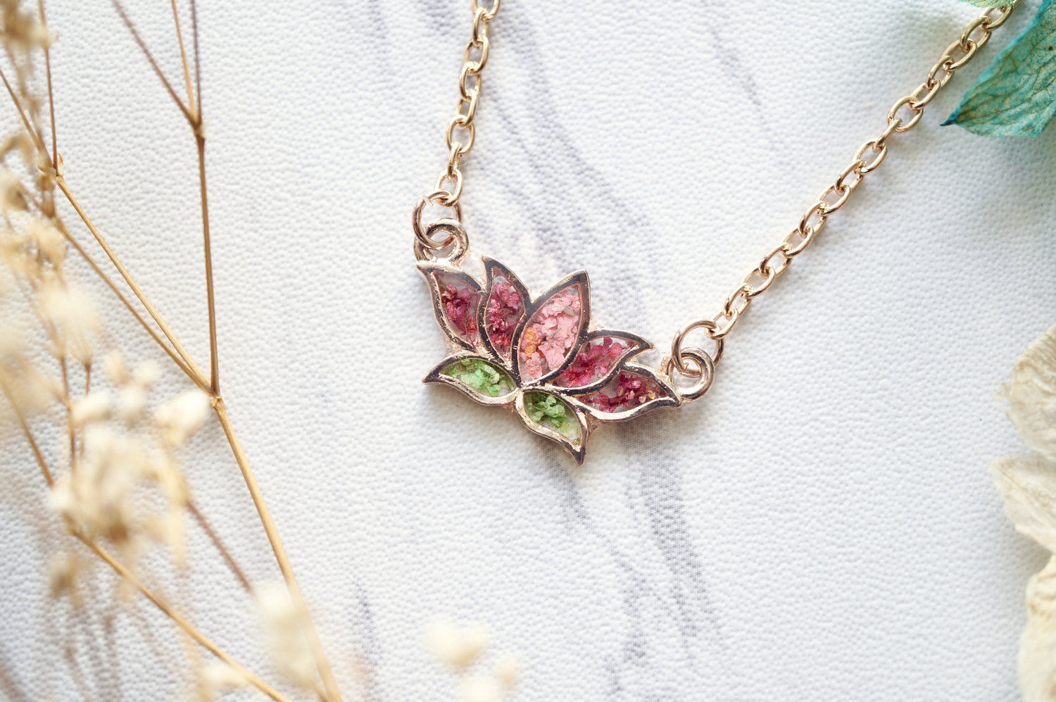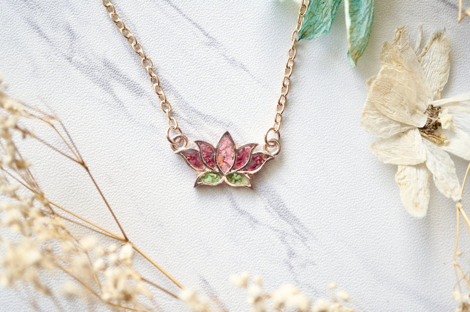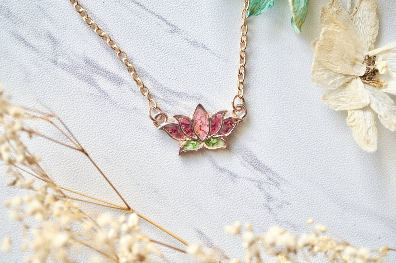 Real Pressed Flowers and Resin Necklace Rose Gold Lotus Flower in Pink and Green
