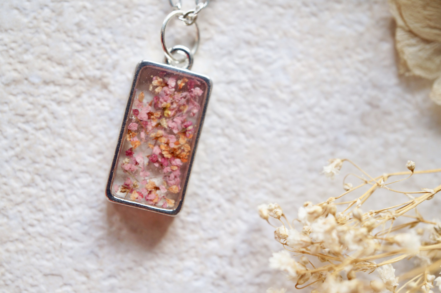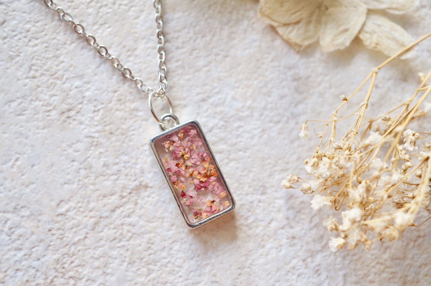 Real Dried Flowers in Resin Necklace in Pinks and Oranges