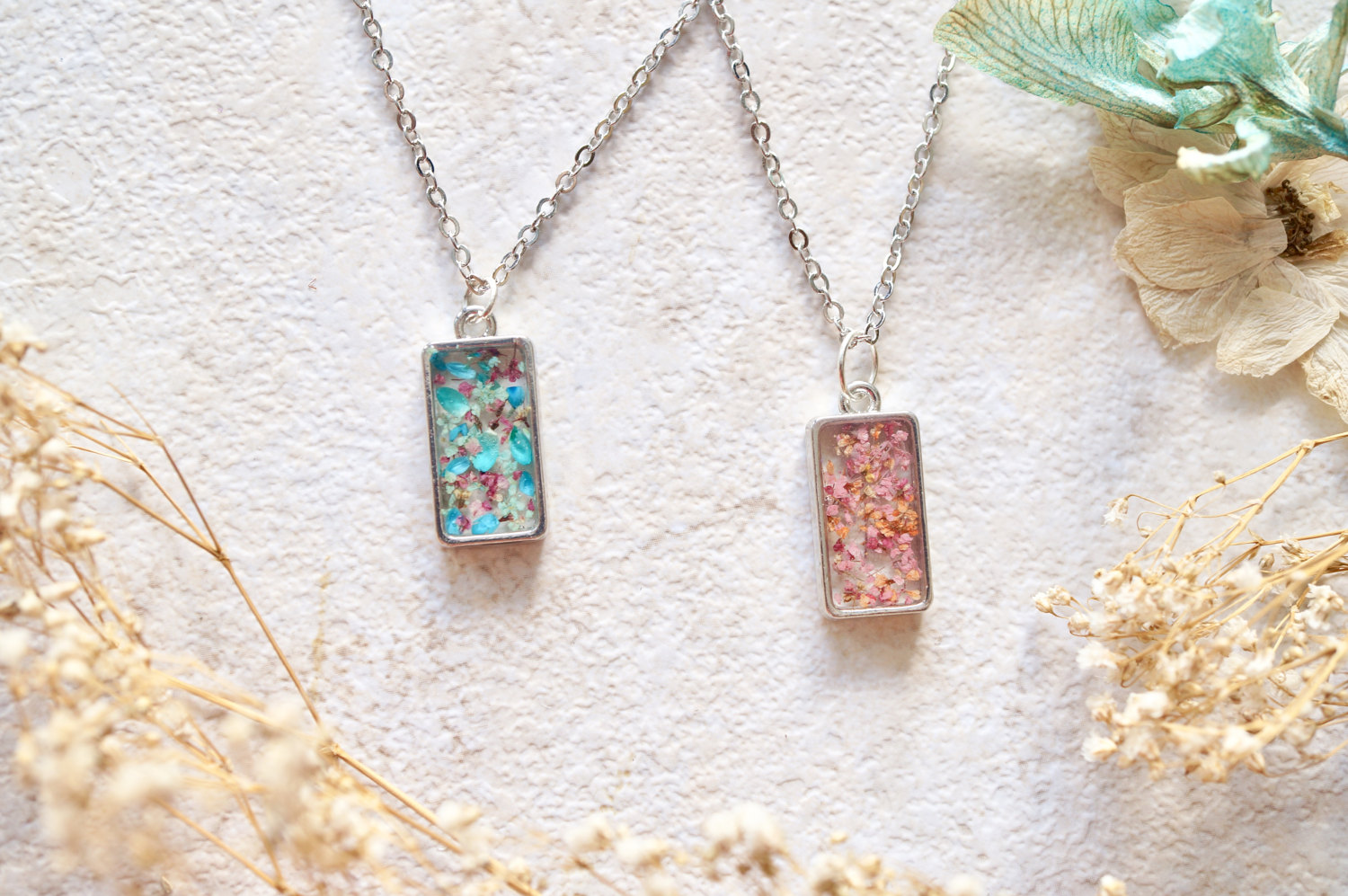 This necklace is handmade with real pressed flowers encased in resin. Surrounded by a beautiful silver frame, this necklace is like wearing a piece of nature. Each piece is one of a kind. Sometimes we will use the same color combination, but no two are exactly alike!