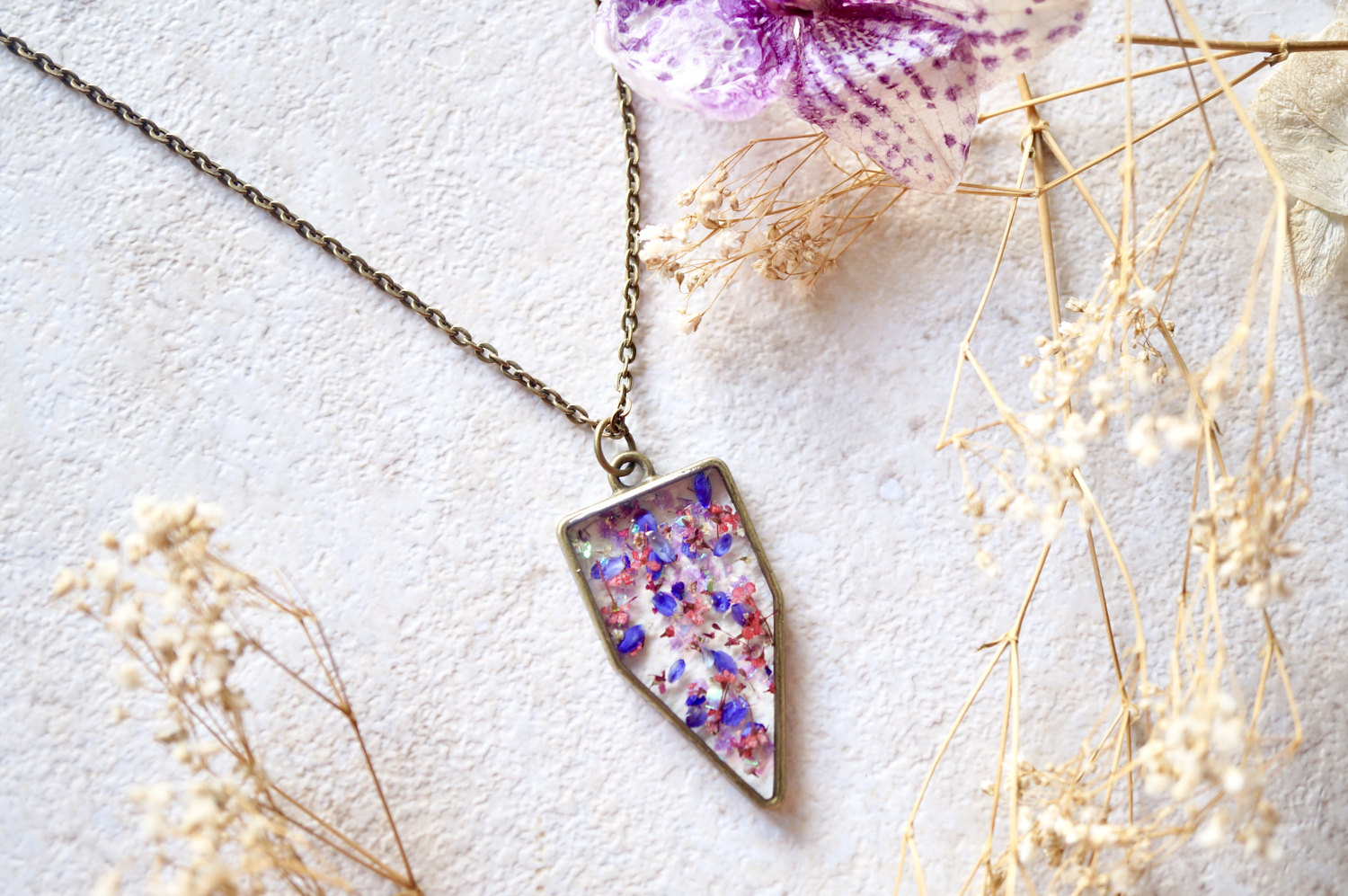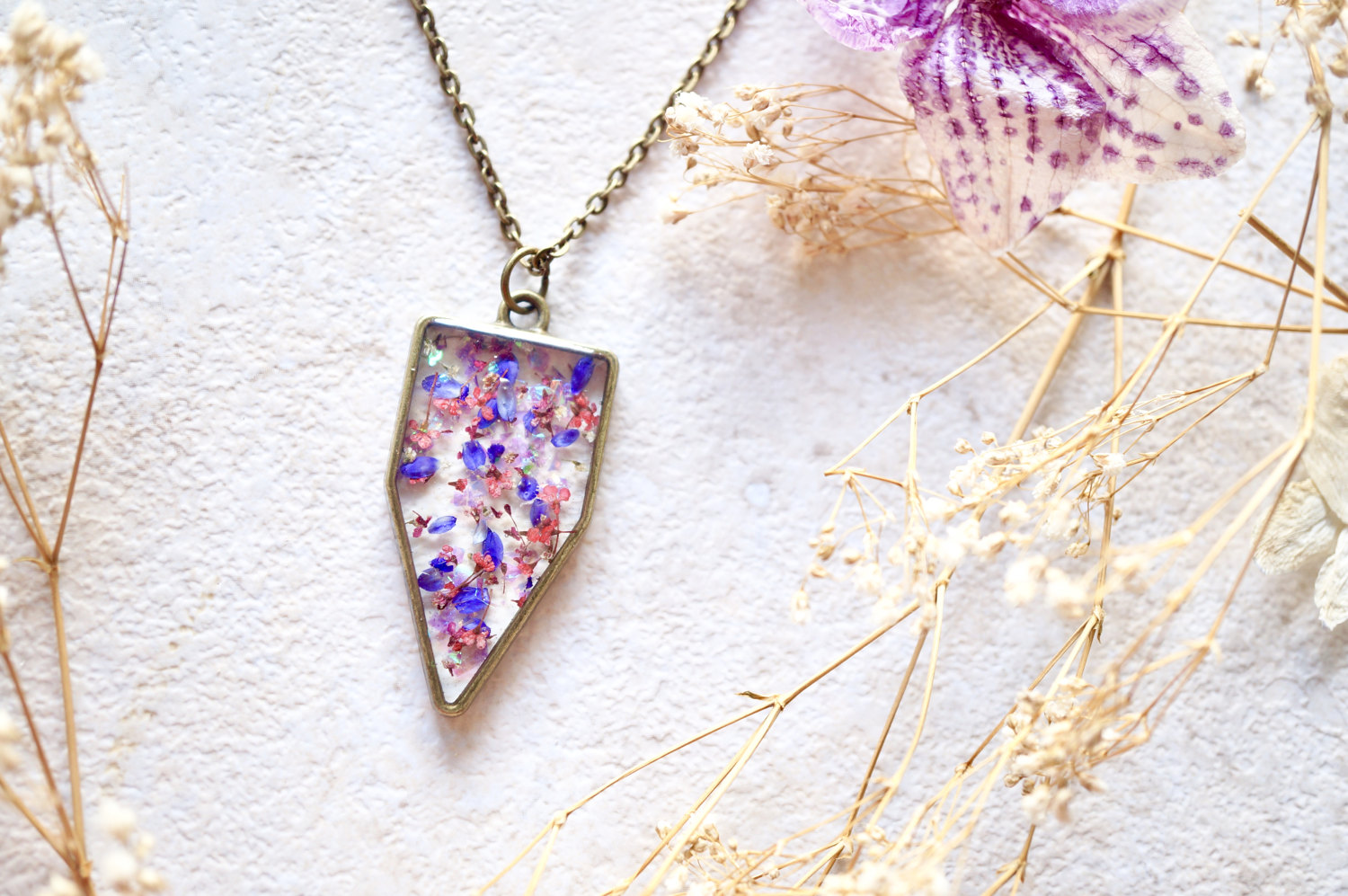 Real Dried Flowers and Resin Necklace, Arrowhead in Purple and Pink Mix