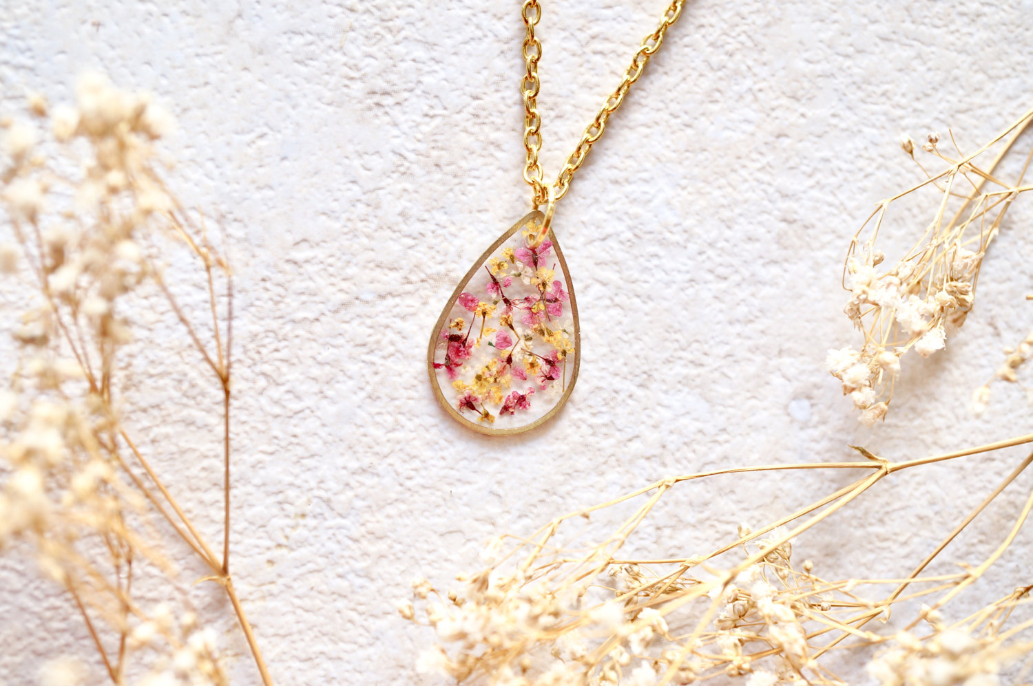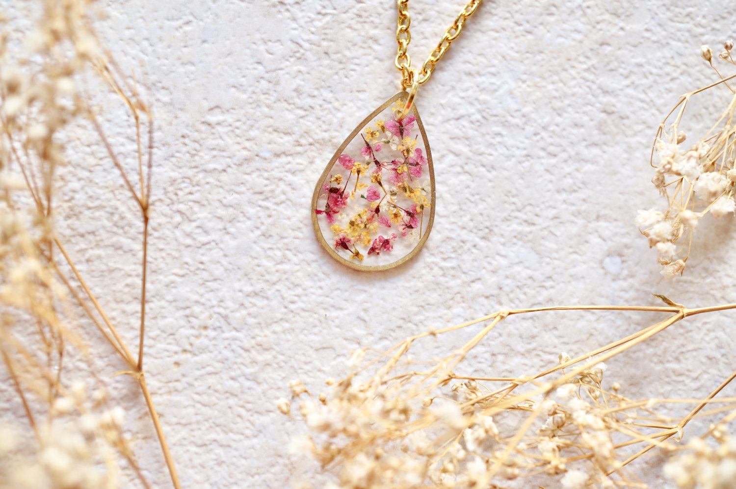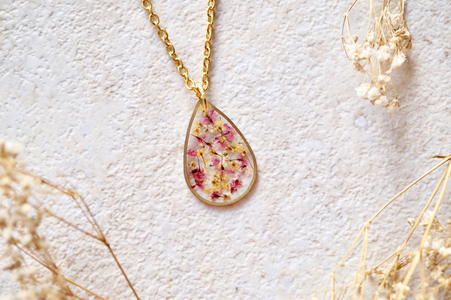 Real Dried Flowers and Resin Necklace, Gold Teardrop in Pink and Yellow Mix