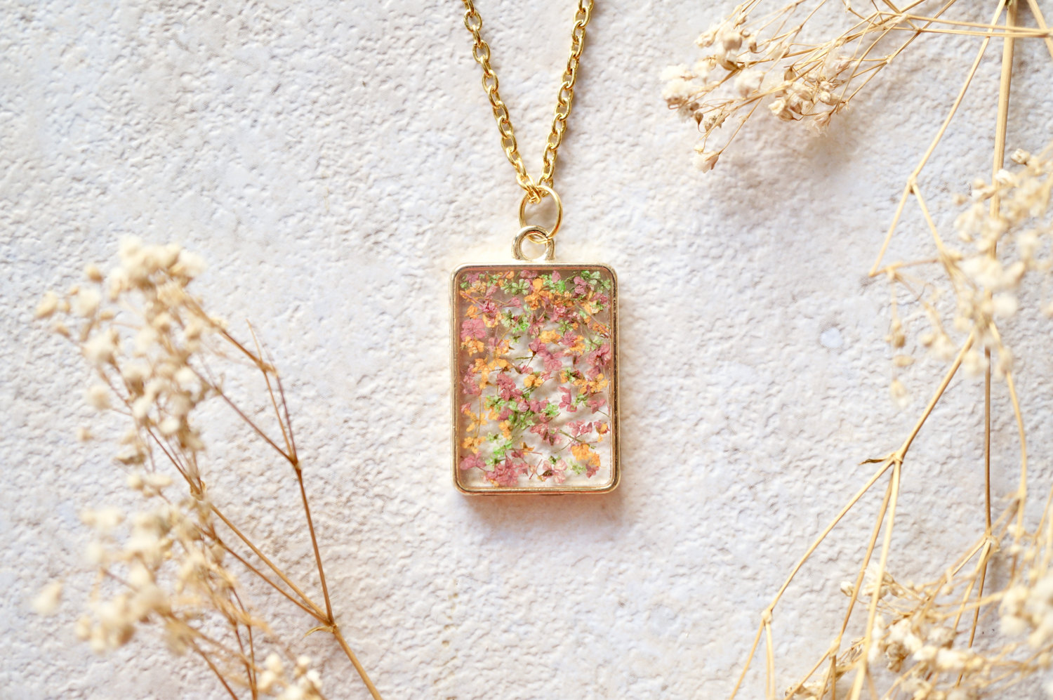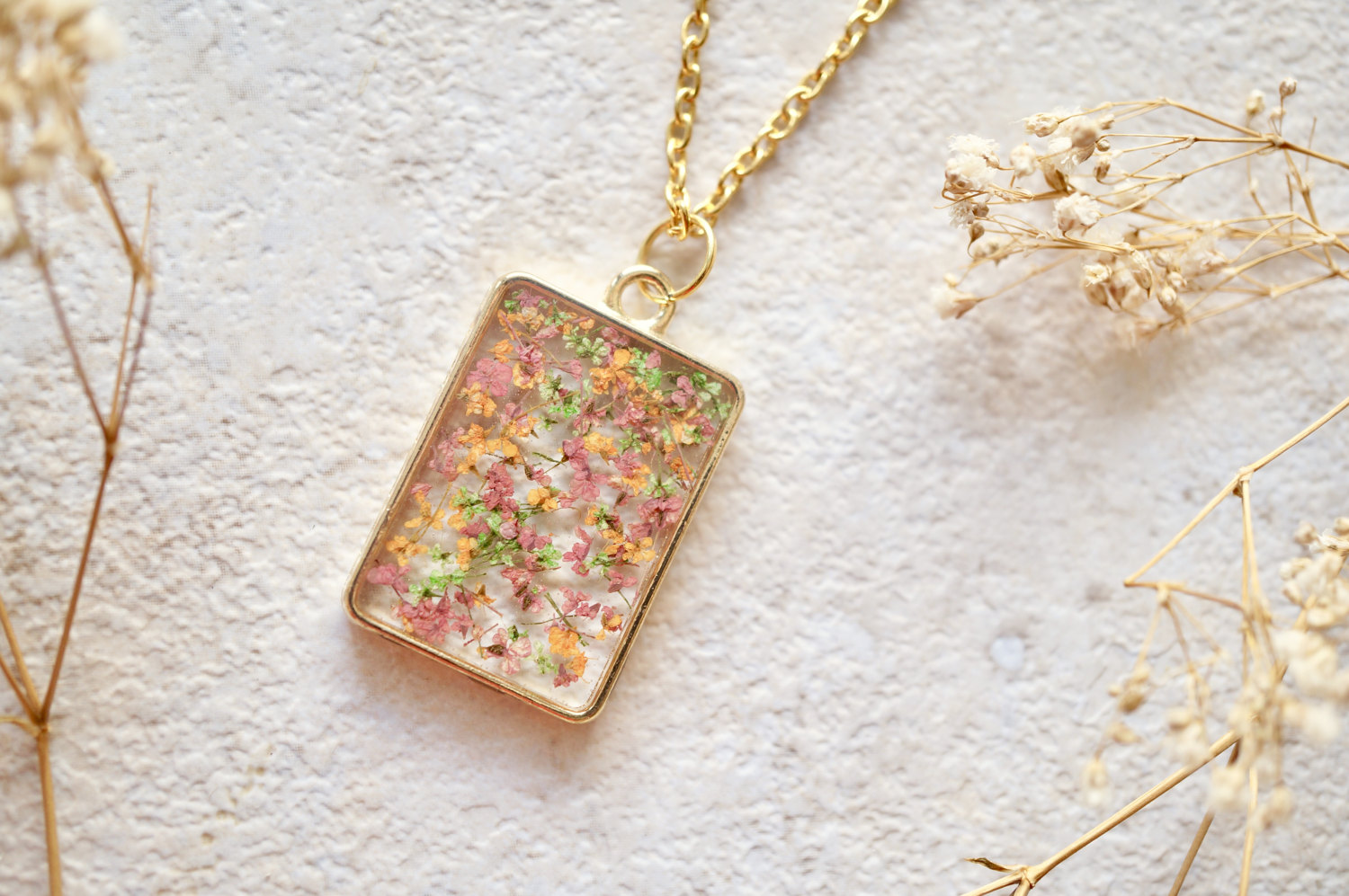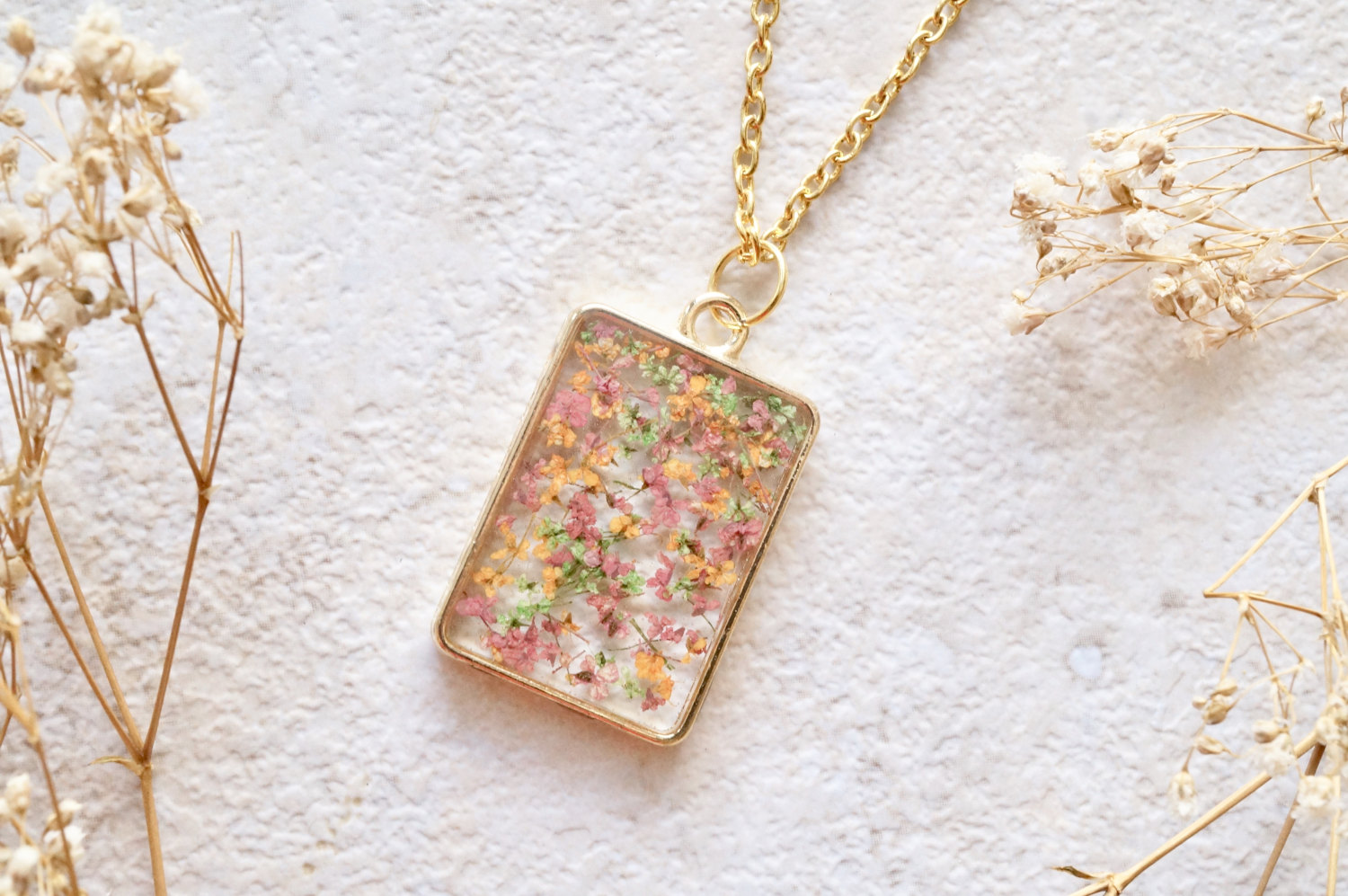 Real Dried Flowers in Resin Necklace, Gold Rectangle in Pink Green Orange Mix