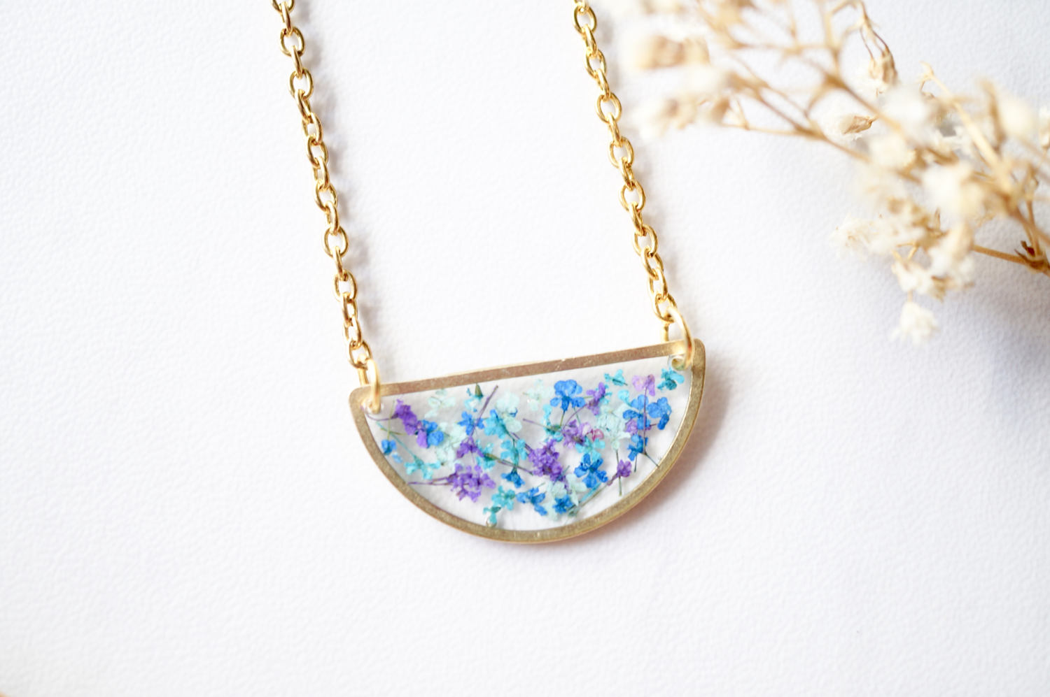 Real Dried Flowers in Resin Necklace, Half Circle in Purple, Mint, Blue, Teal