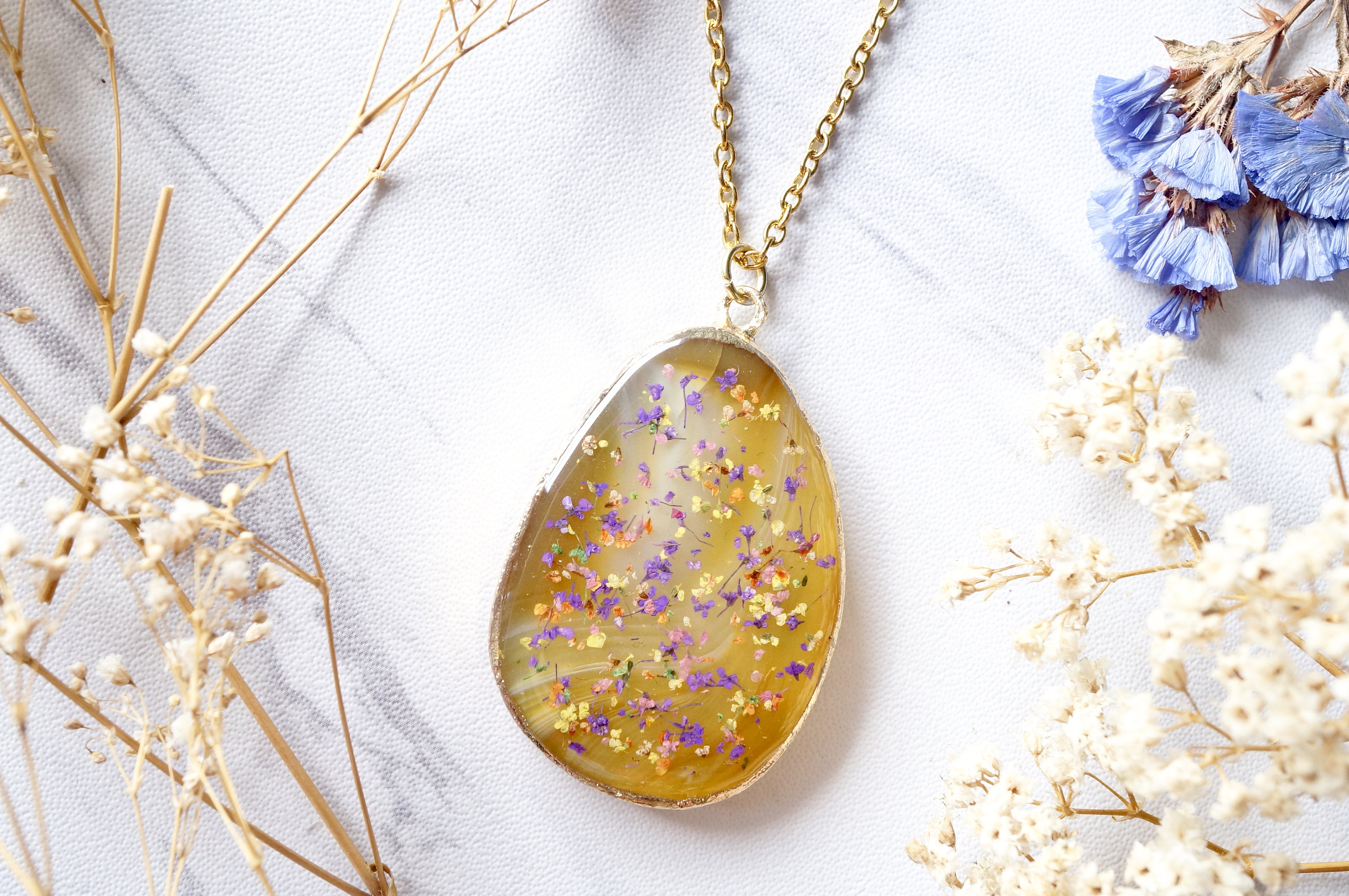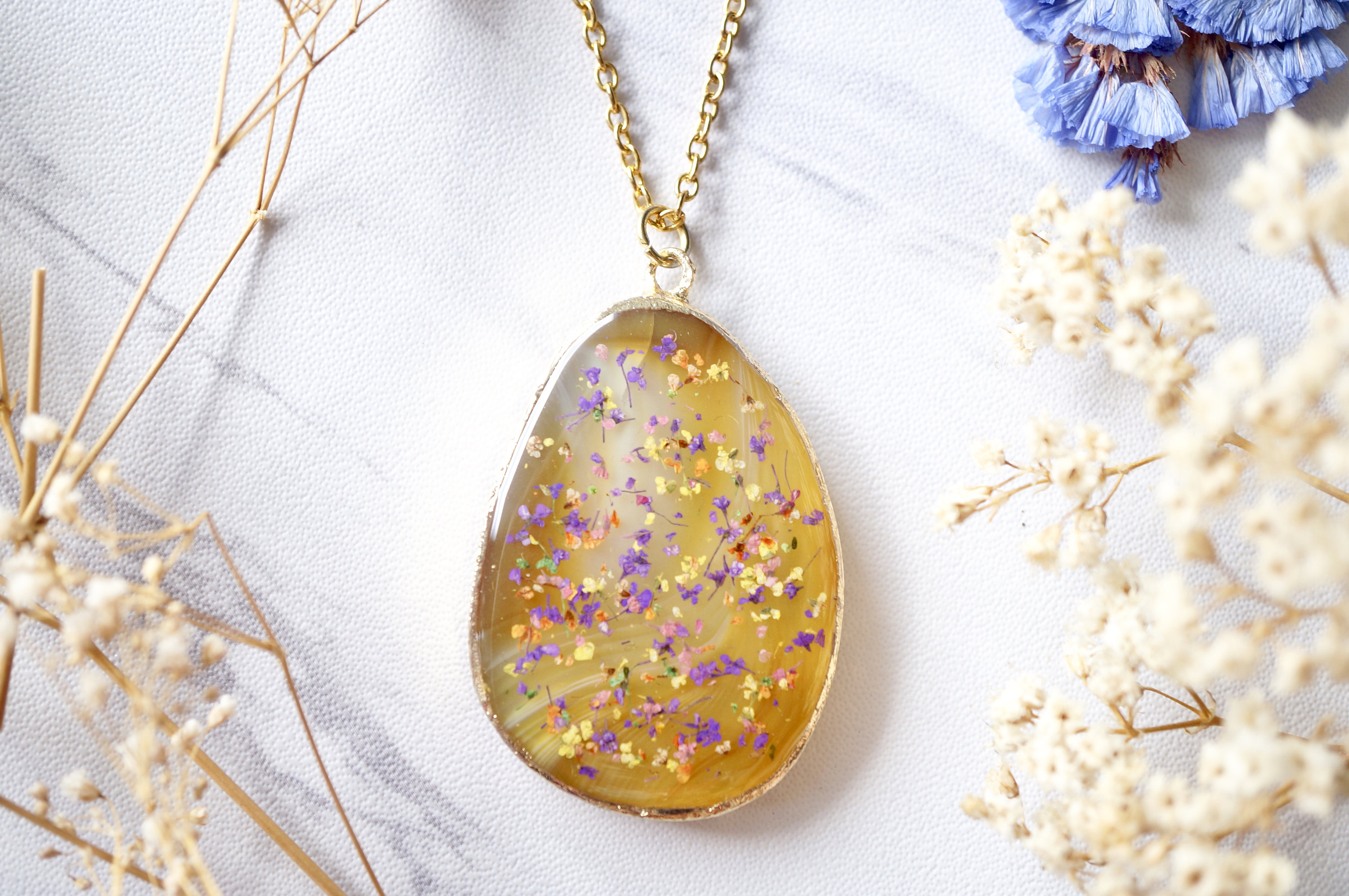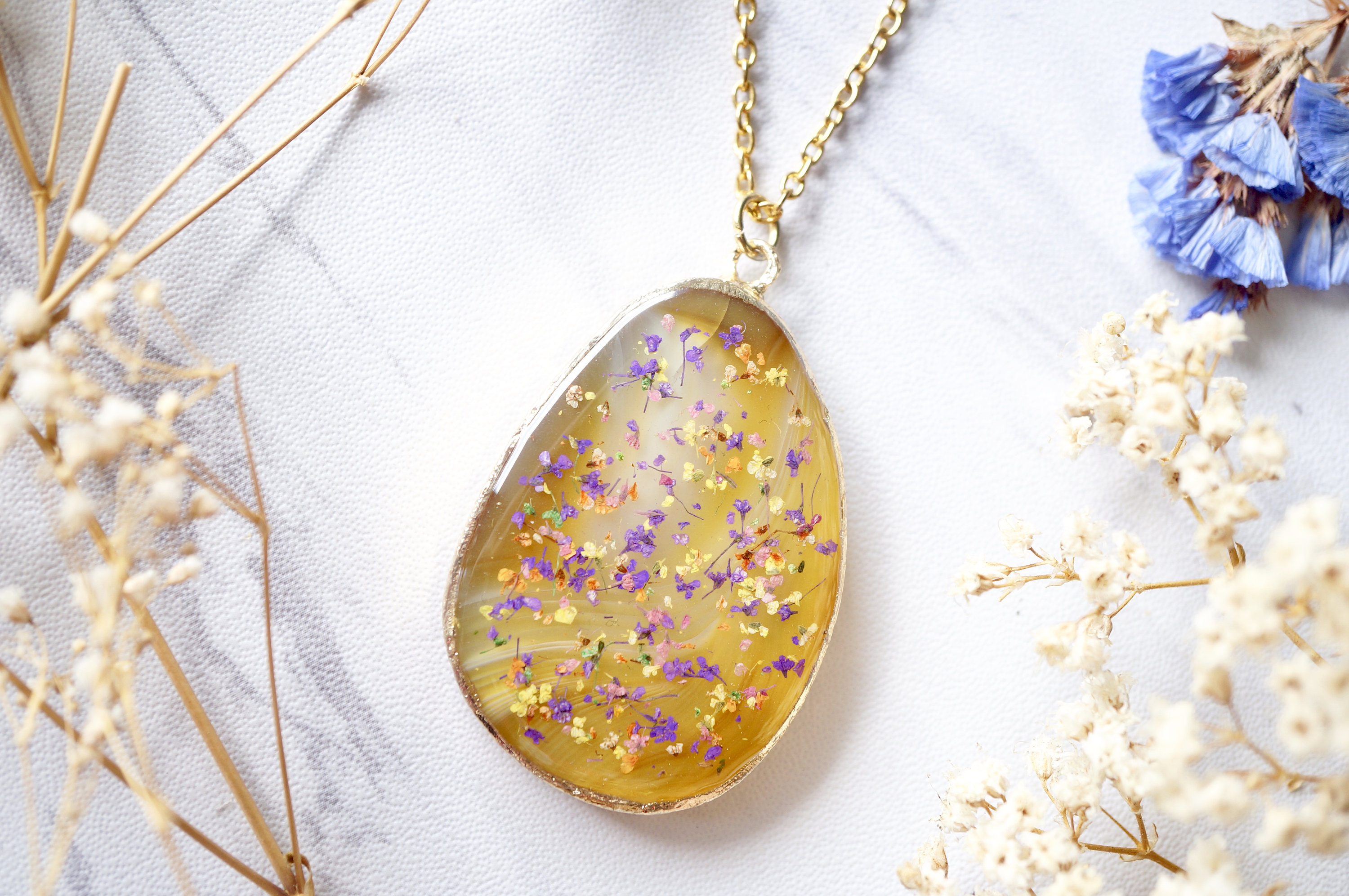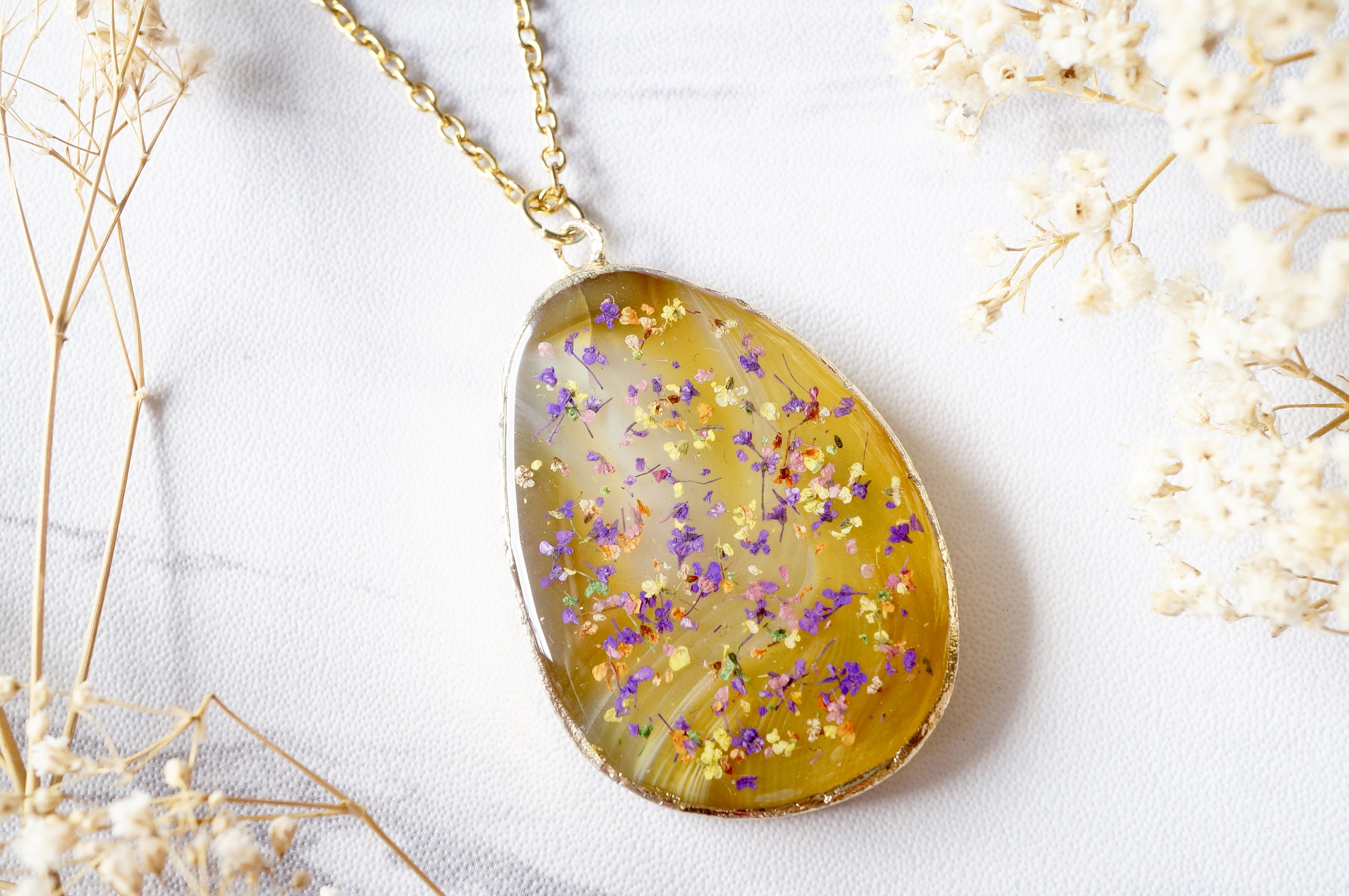 Real Dried Flowers and Resin Necklace, Yellow Geode in Purple Yellow Mix
