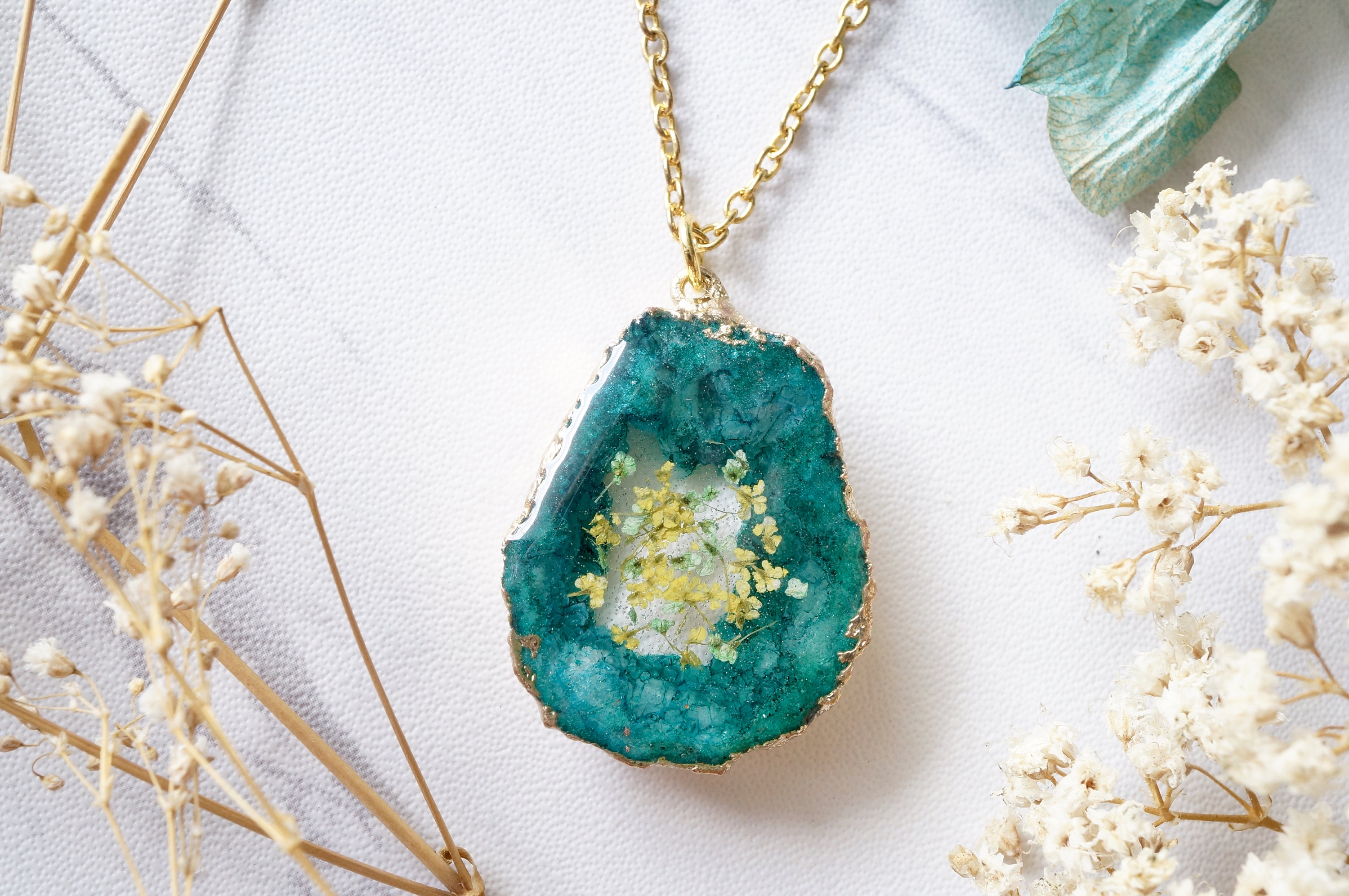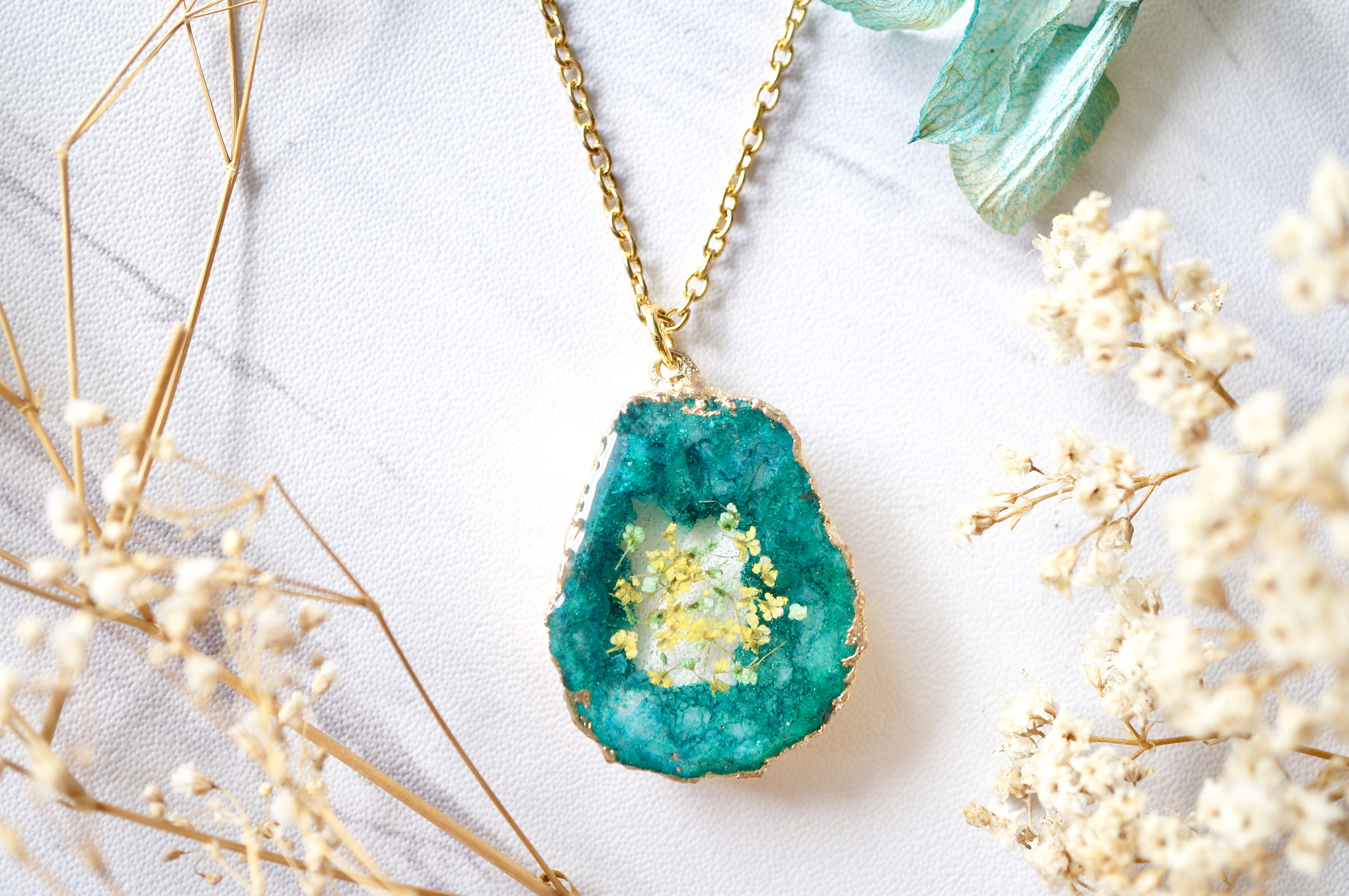 Real Dried Flowers and Resin Necklace, Emerald Green Druzy Geode in Yellow and Green