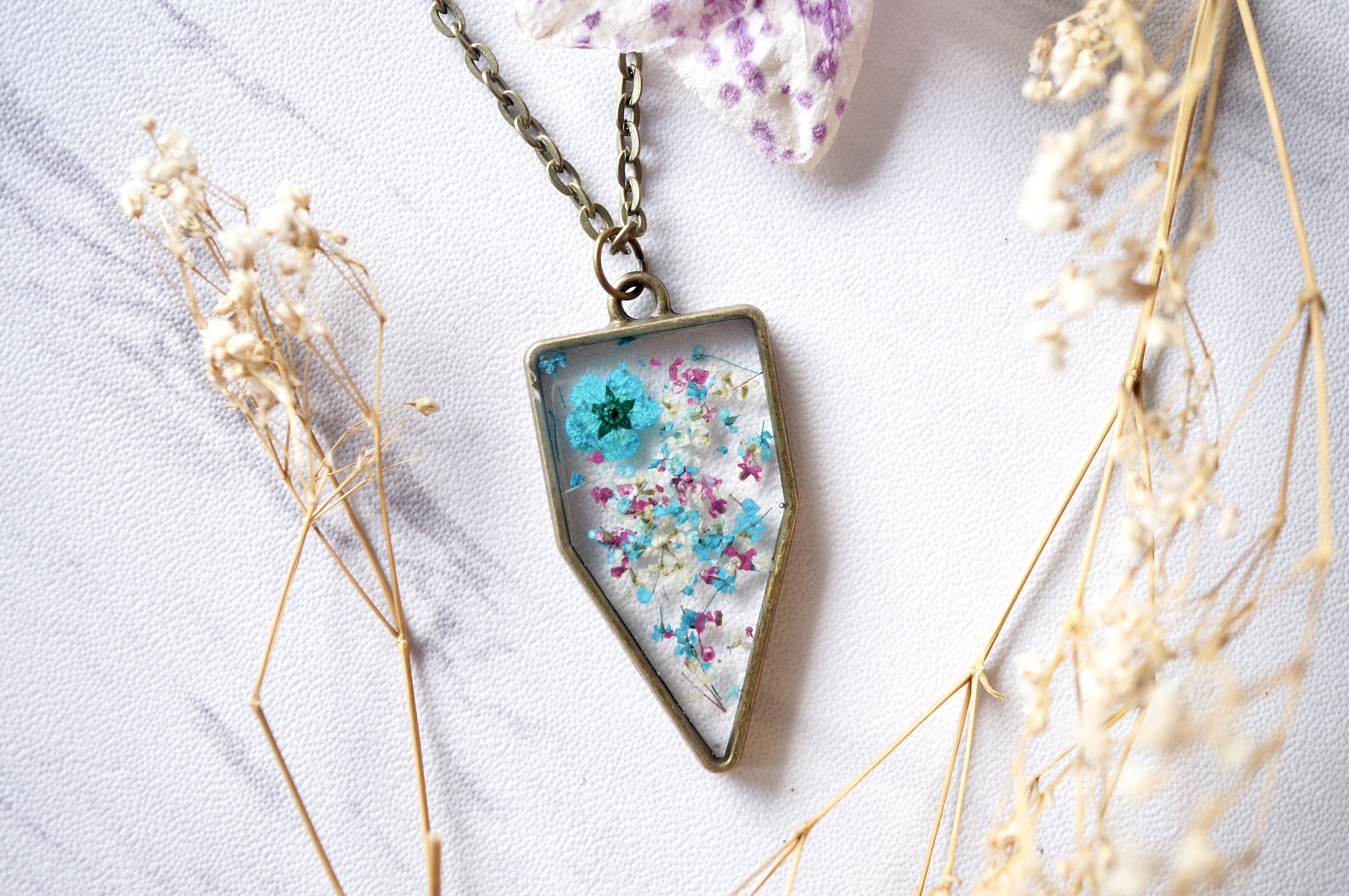 Real Dried Flowers in Resin Necklace, Arrowhead in Teal Magenta White