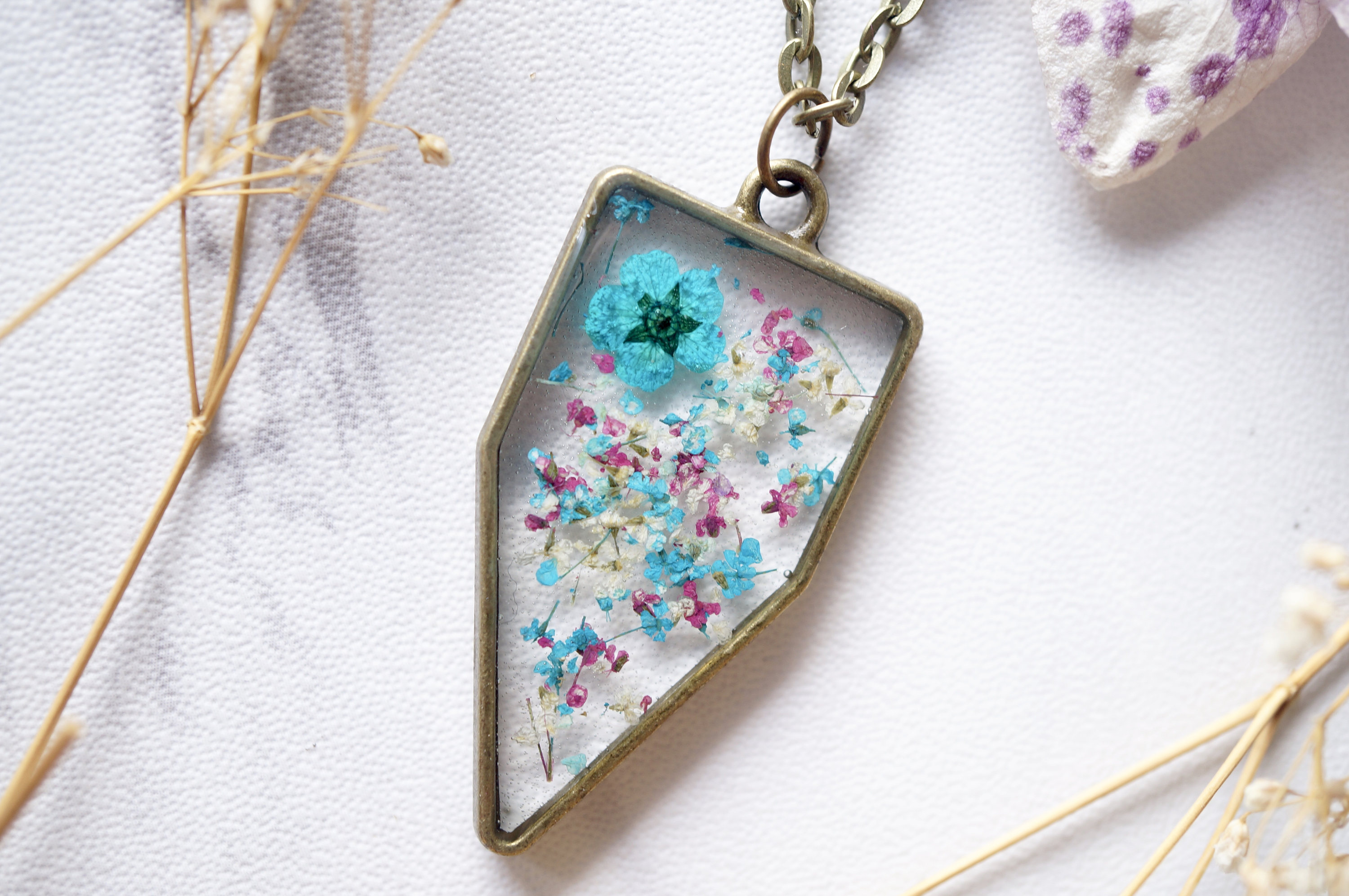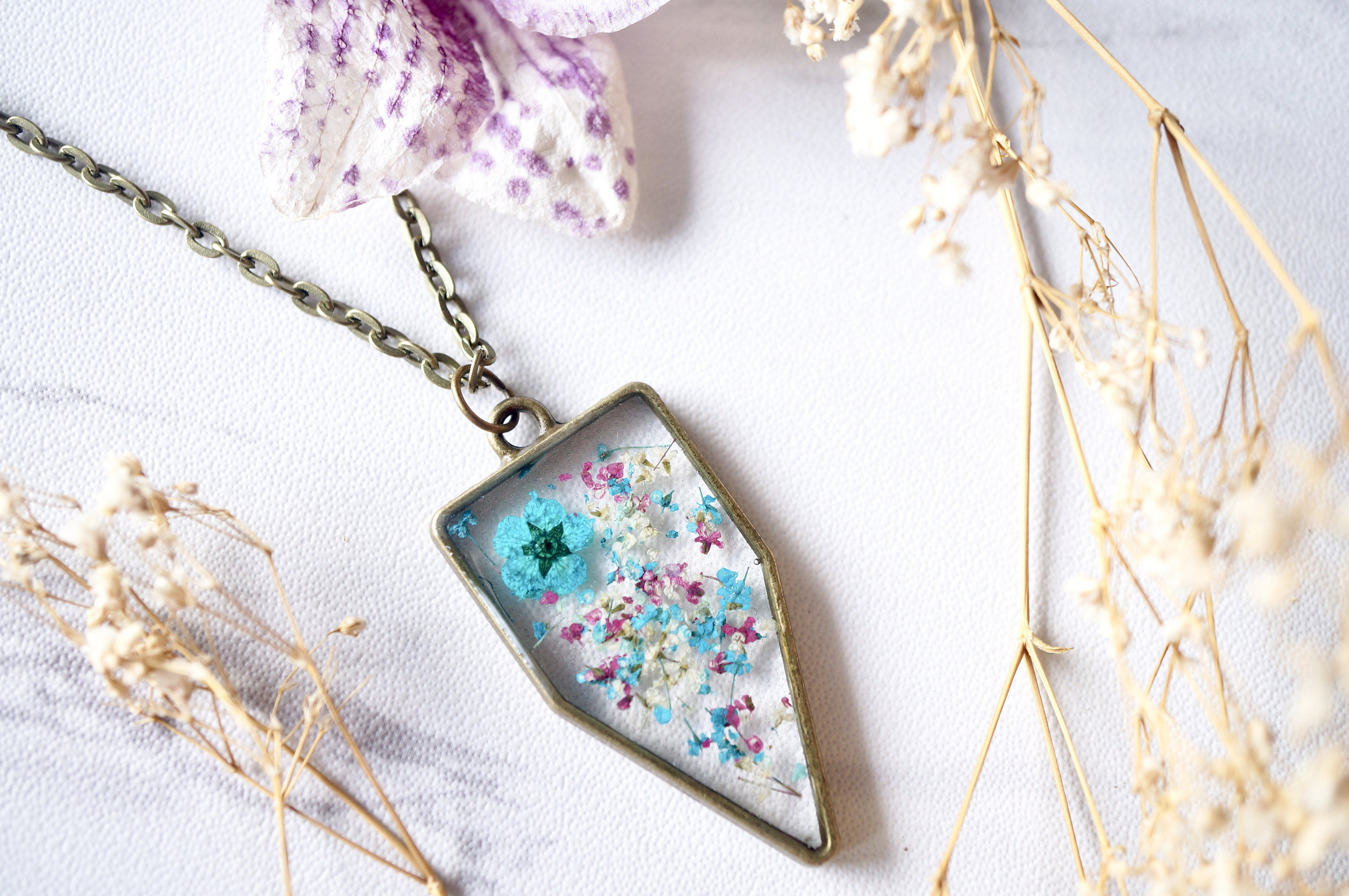 This necklace is handmade with real pressed flowers encased in resin. Surrounded by a beautiful metal bronze frame, this necklace is like wearing a piece of nature. Each piece is one of a kind. Sometimes we will use the same color combination, but no two are exactly alike!