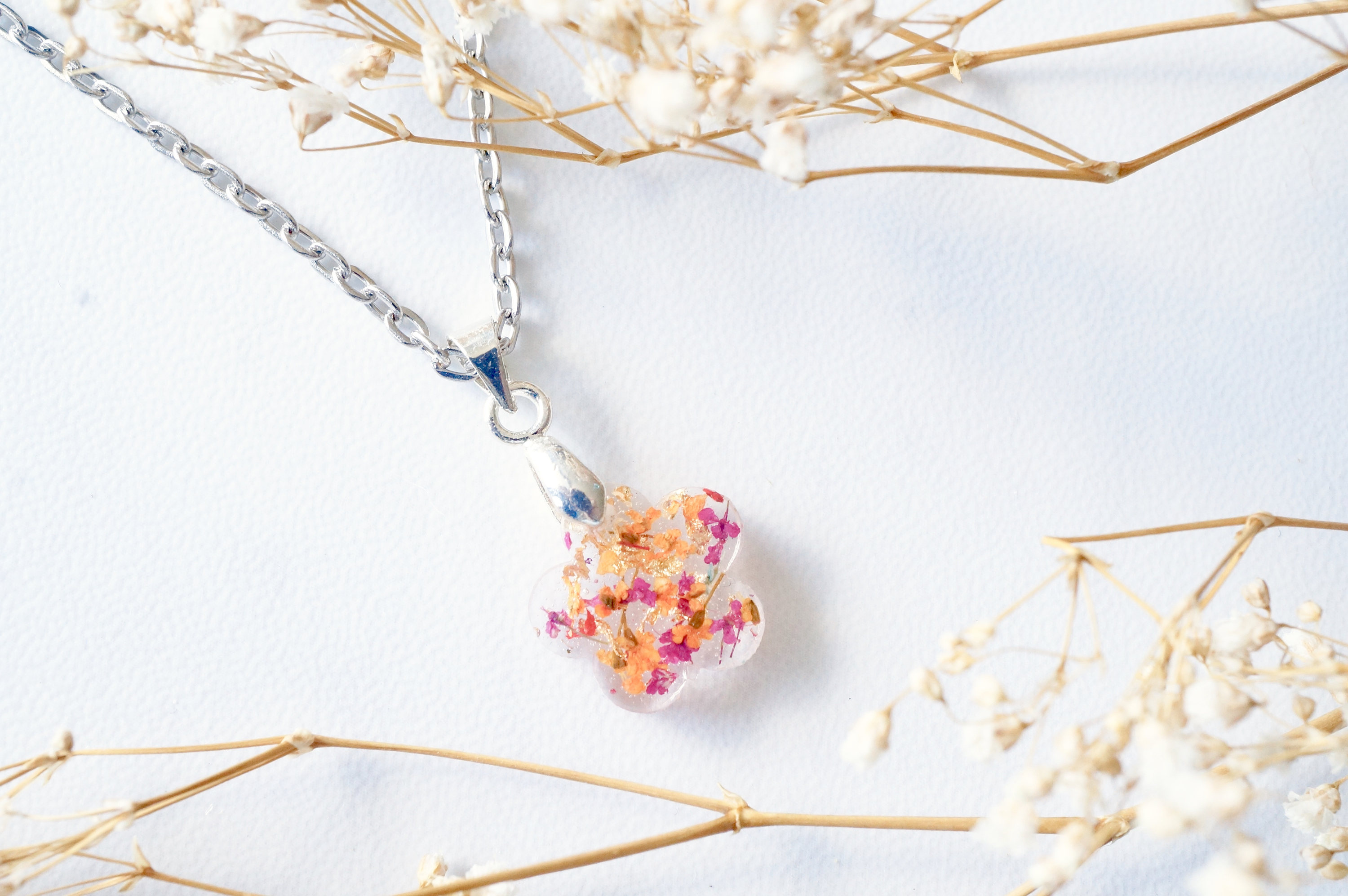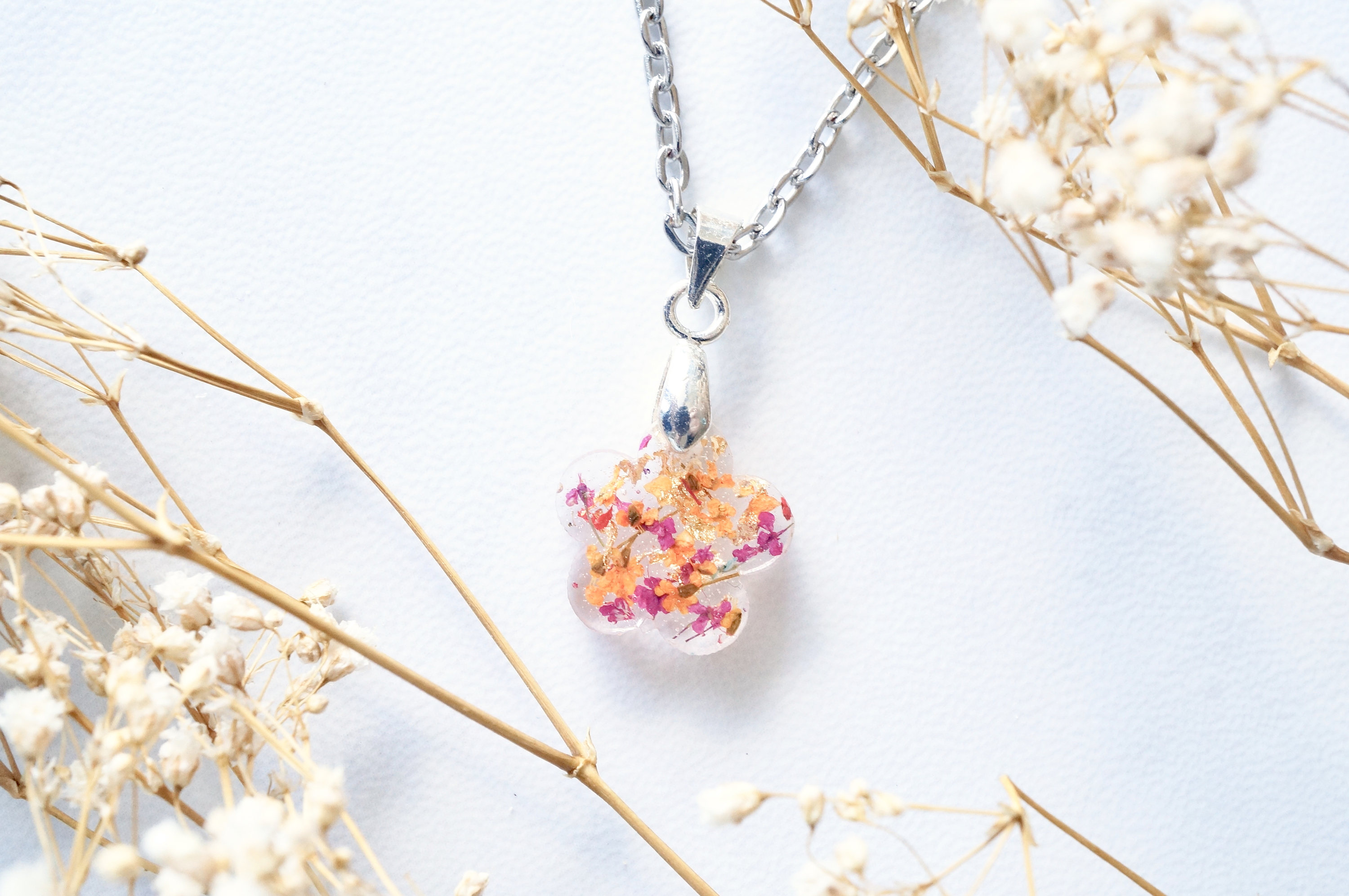 This necklace is handmade with real pressed flowers encased in resin. Surrounded by a beautiful frame-less flower, this necklace is like wearing a piece of nature. Each piece is one of a kind. Sometimes we will use the same color combination, but no two are exactly alike!