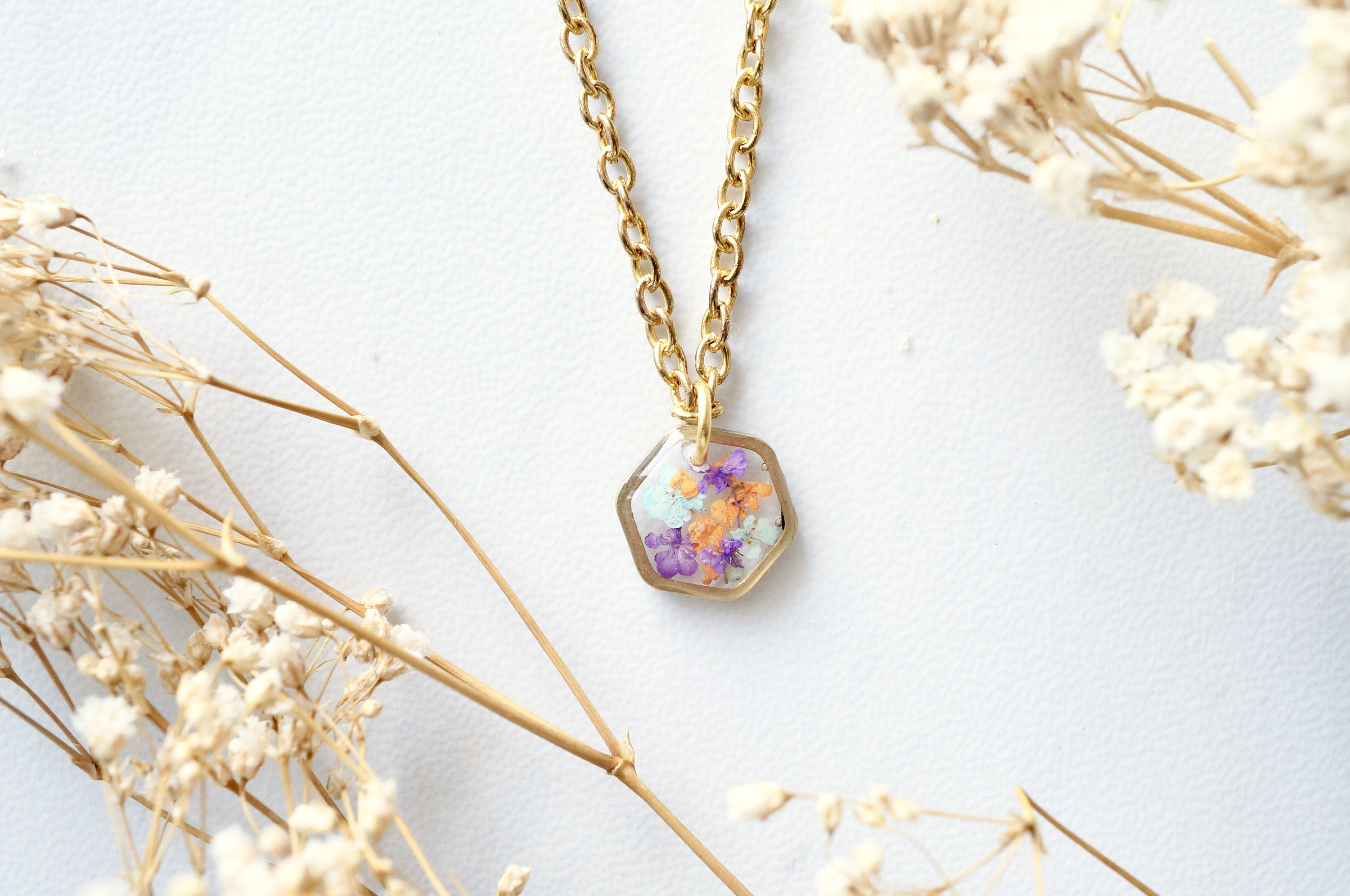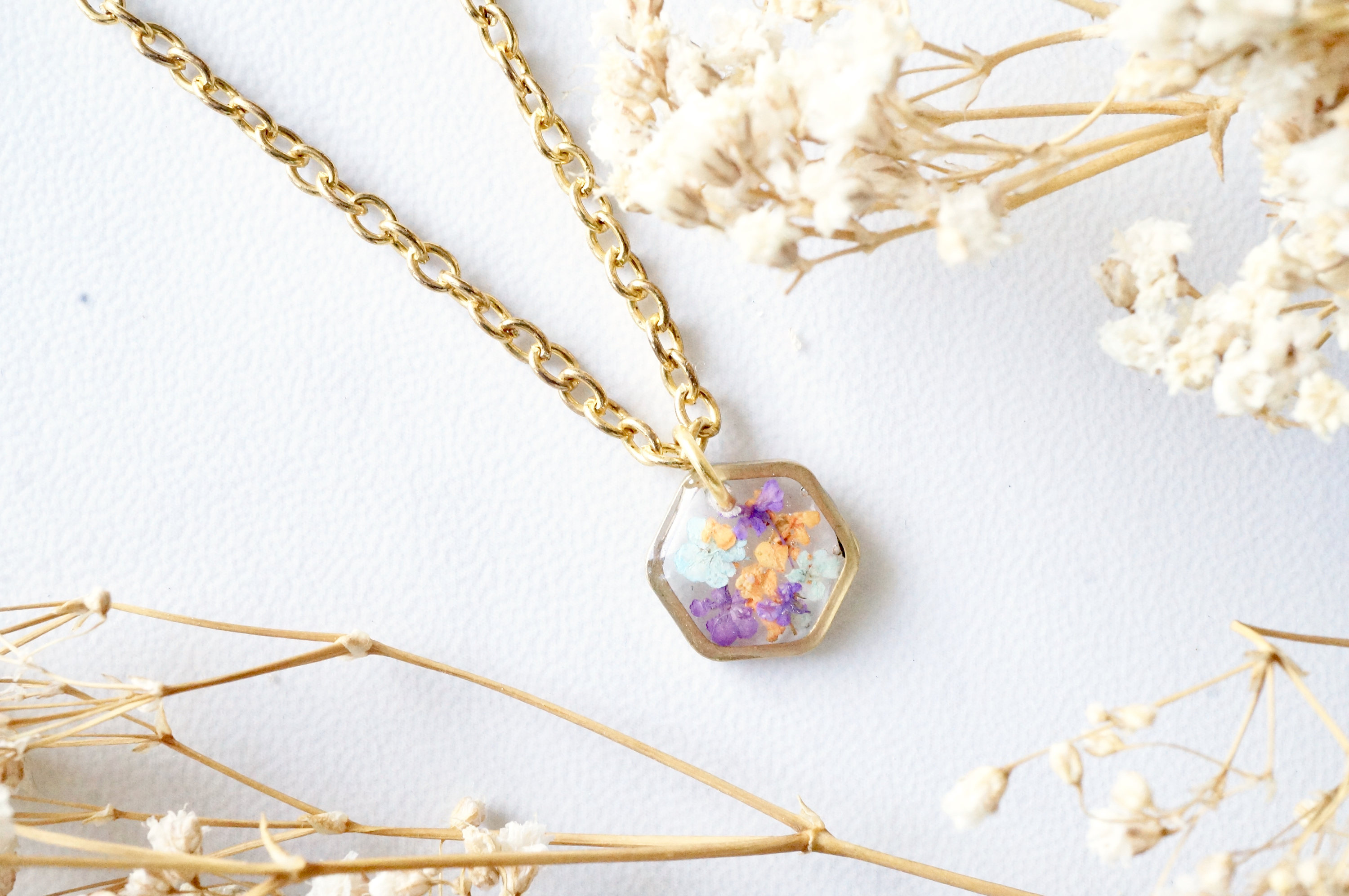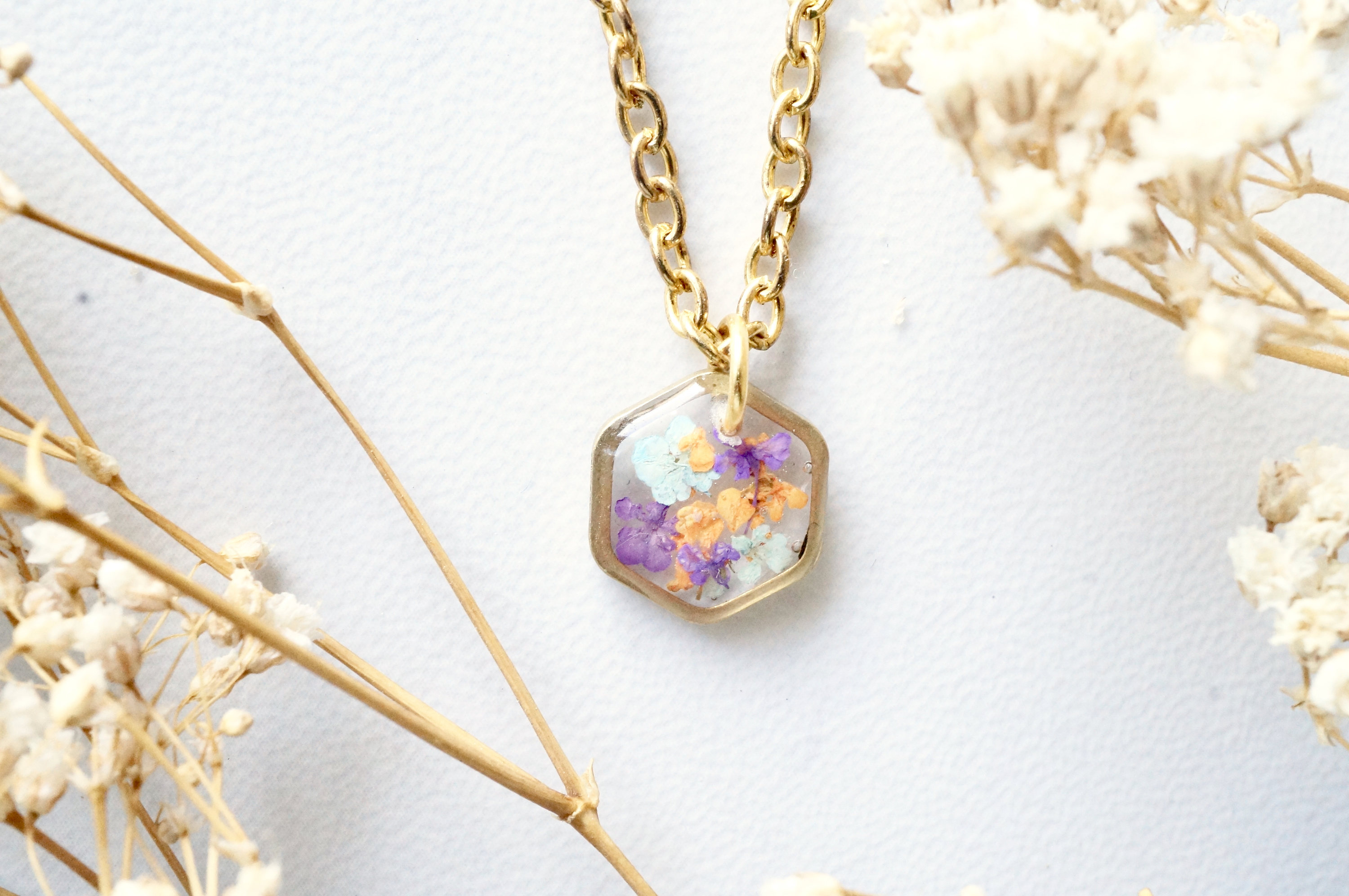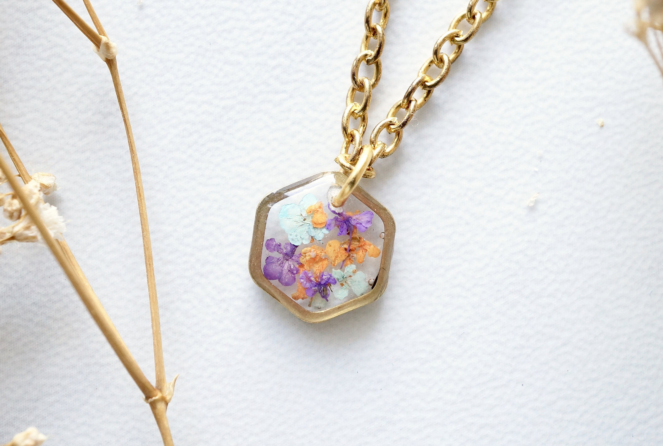 Real Dried Flowers in Resin Necklace, Small Gold Hexagon in Purples Oranges and Mint