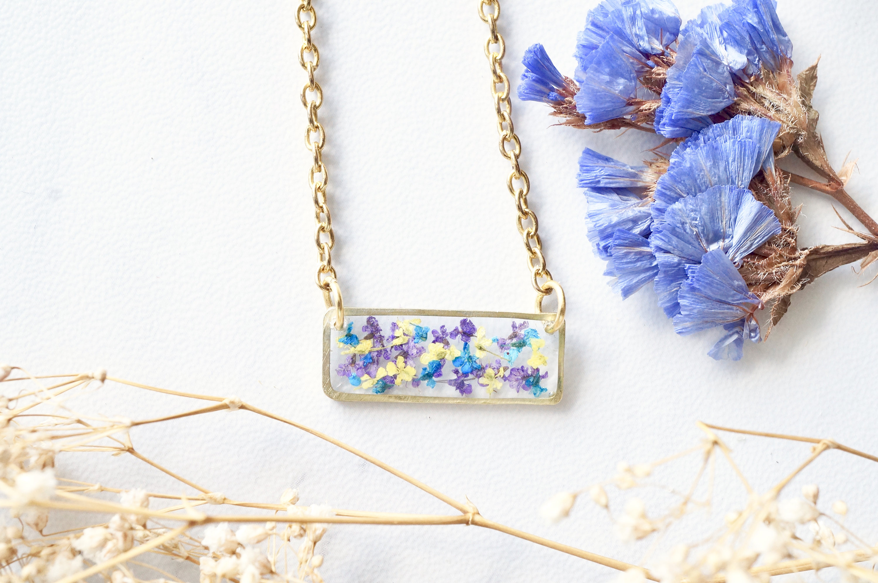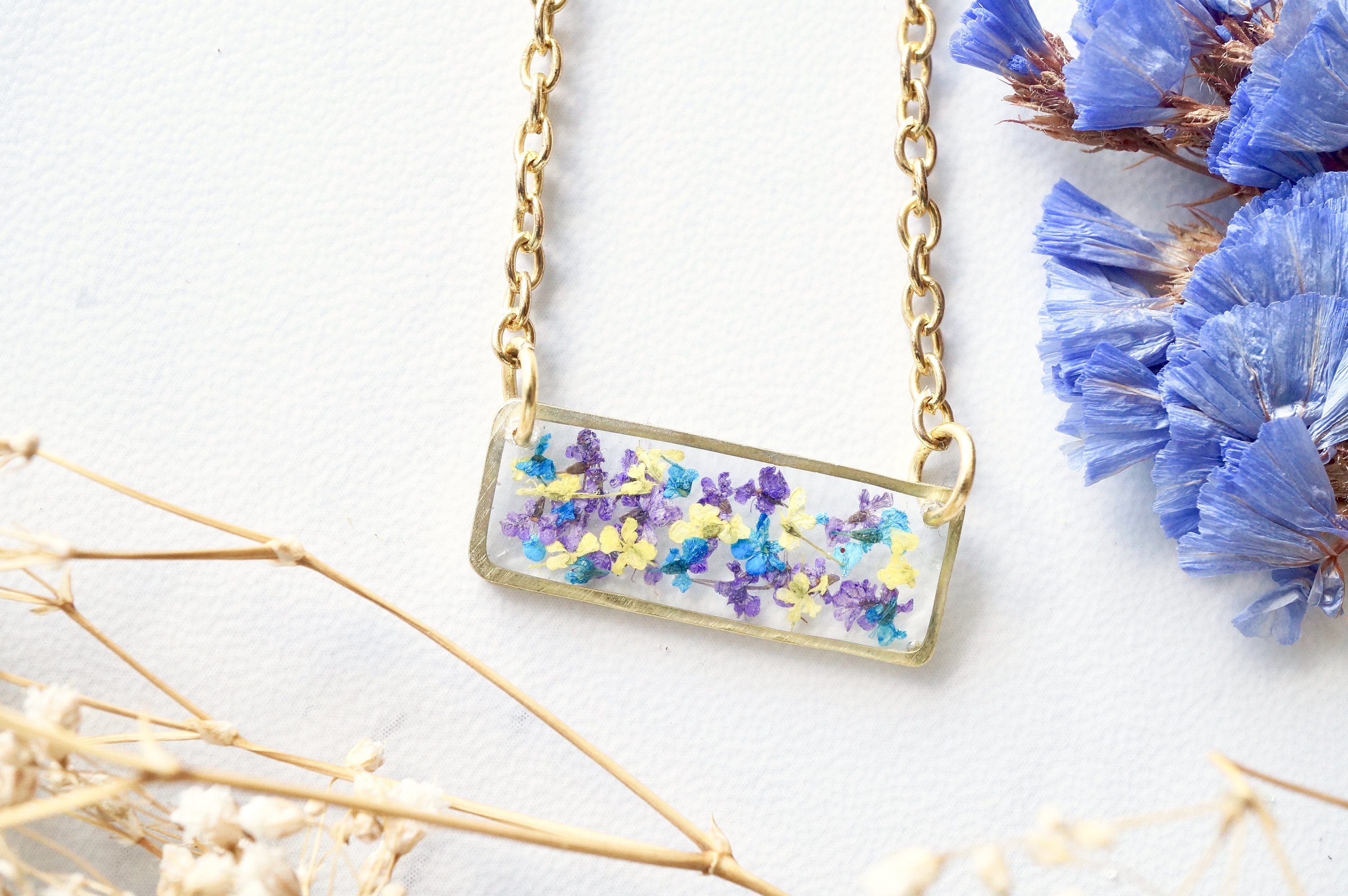 Real Dried Flowers and Resin Necklace, Gold Bar in Purple Yellow Blue
