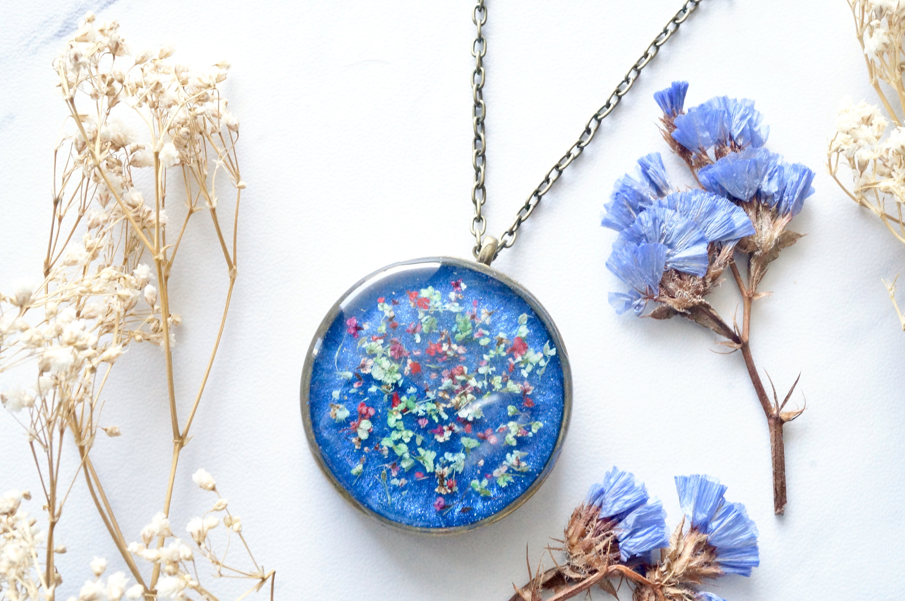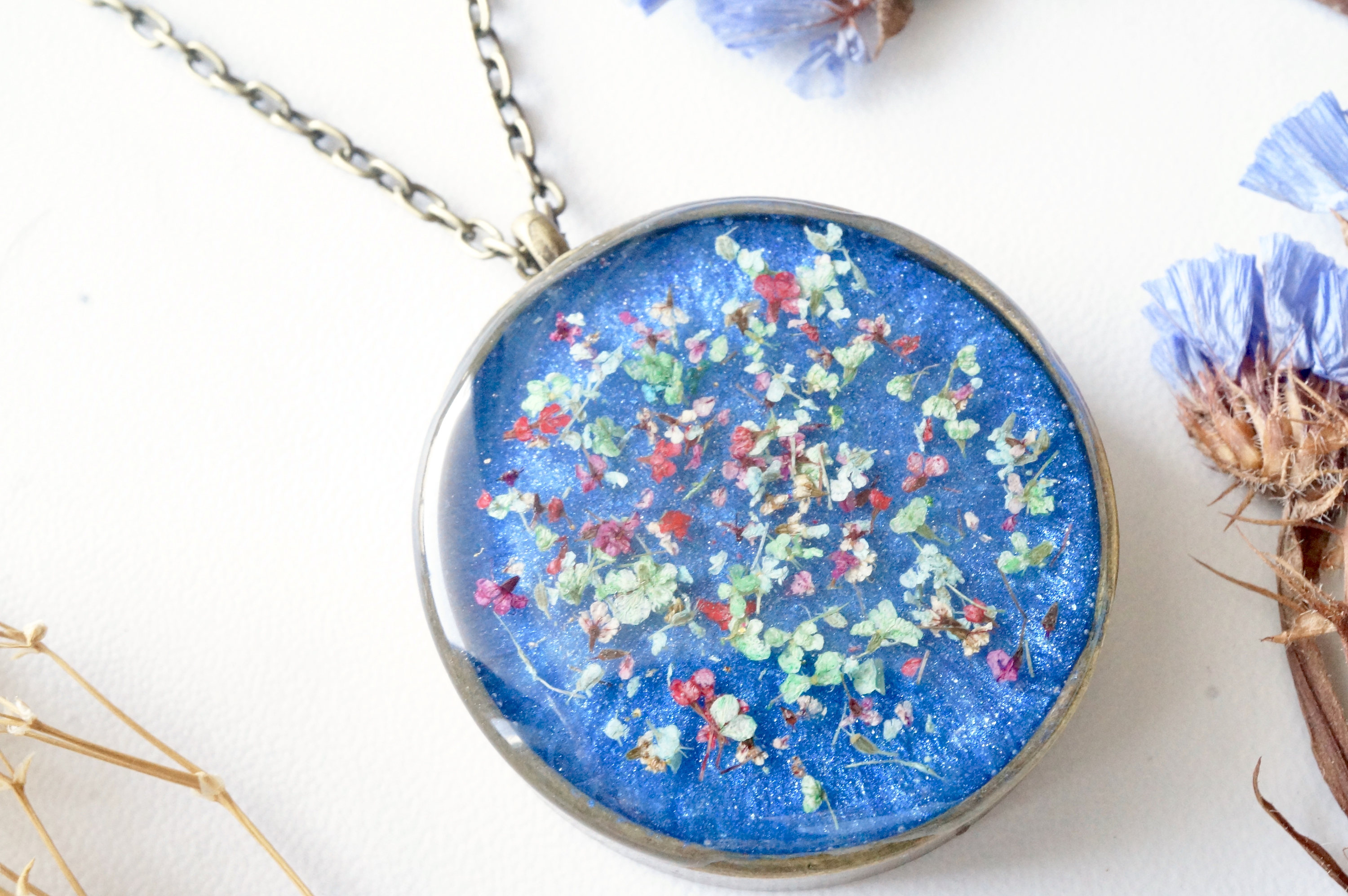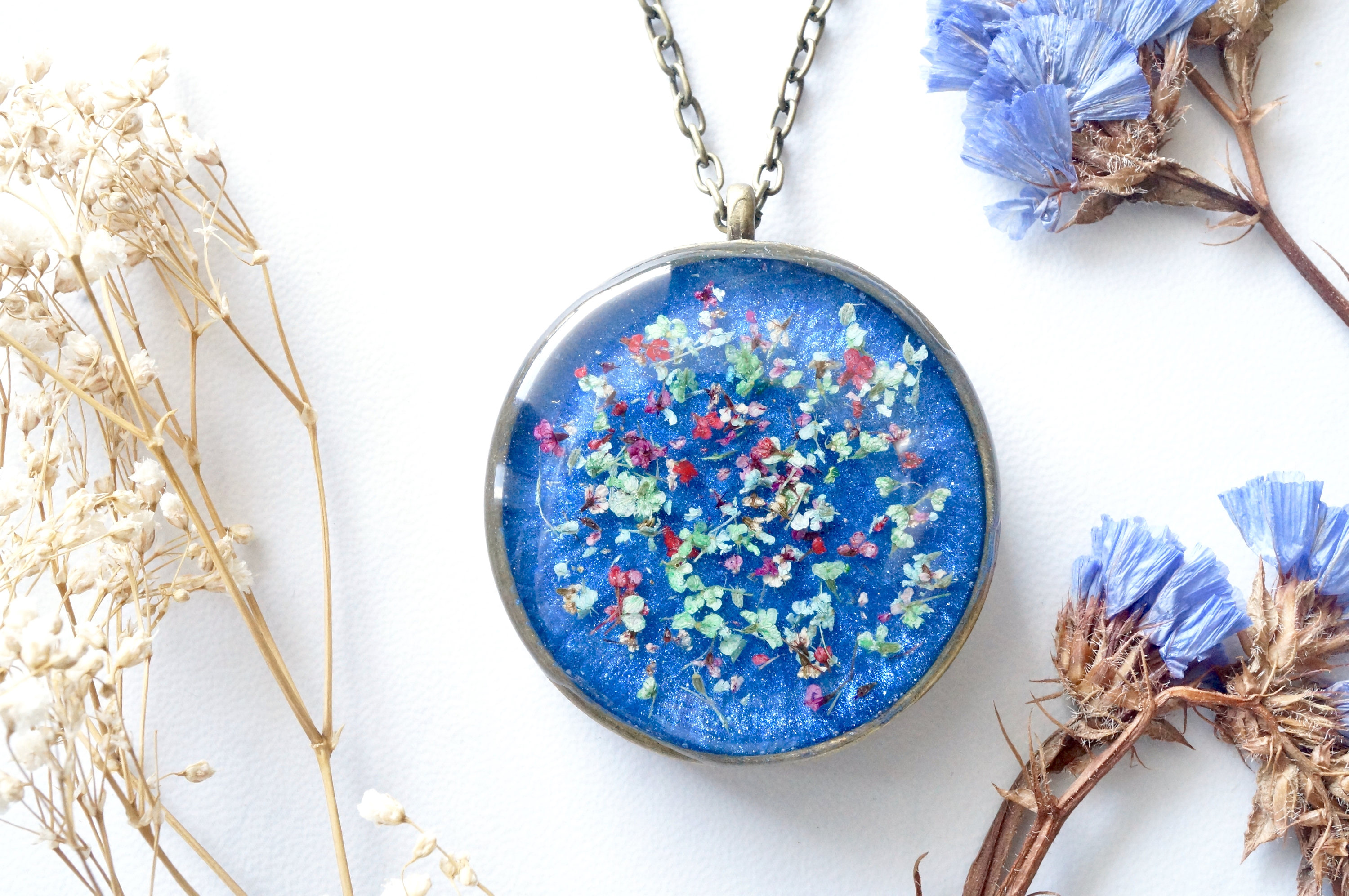 This necklace is handmade with real pressed flowers encased in resin. Surrounded by a beautiful thick silver frame, this necklace is like wearing a piece of nature. Each piece is one of a kind. Sometimes we will use the same color combination, but no two are exactly alike!