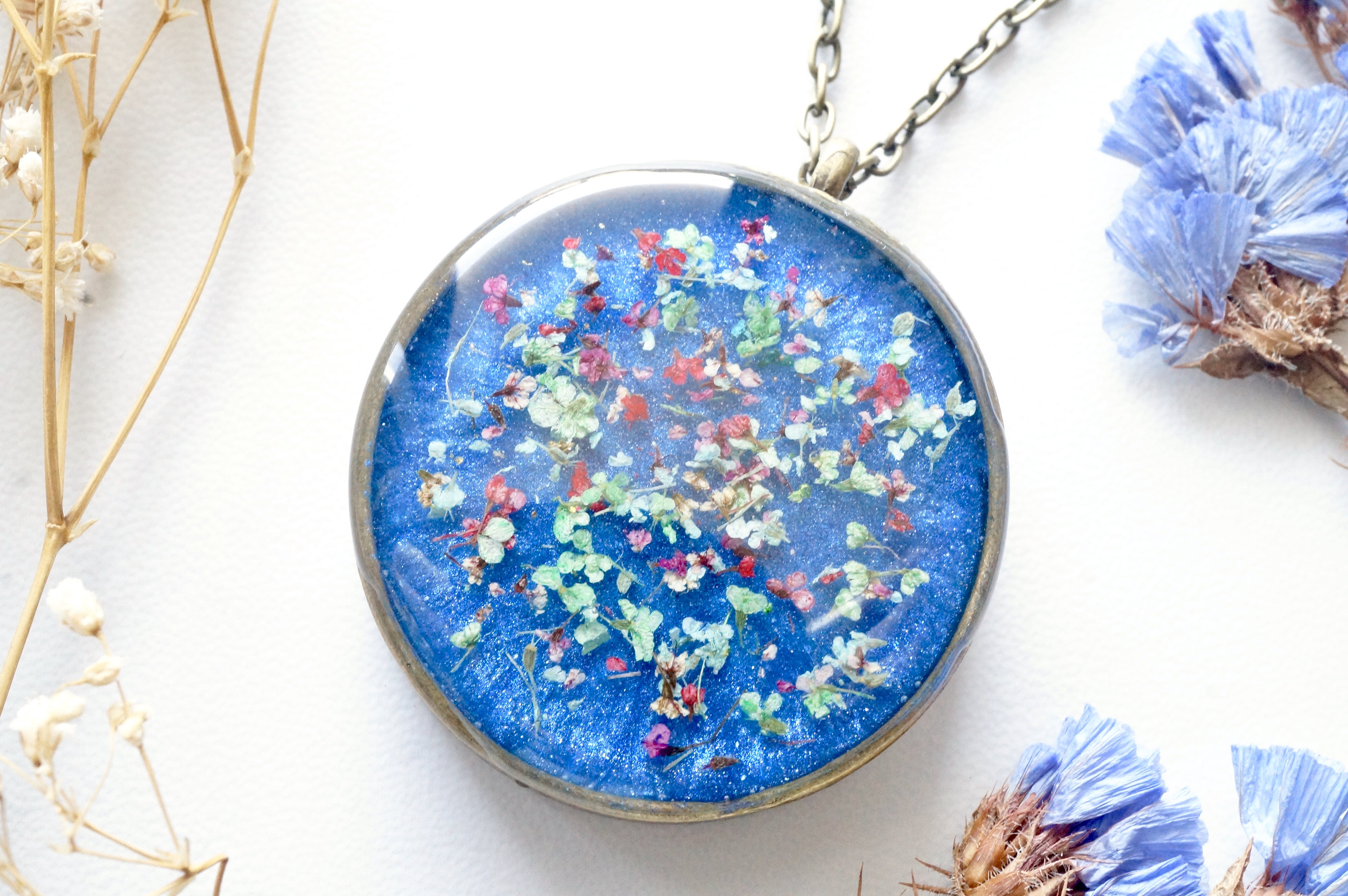 Real Dried Flowers in Resin Necklace, Thick Silver Circle in Blue, Red, Magenta, Green, White