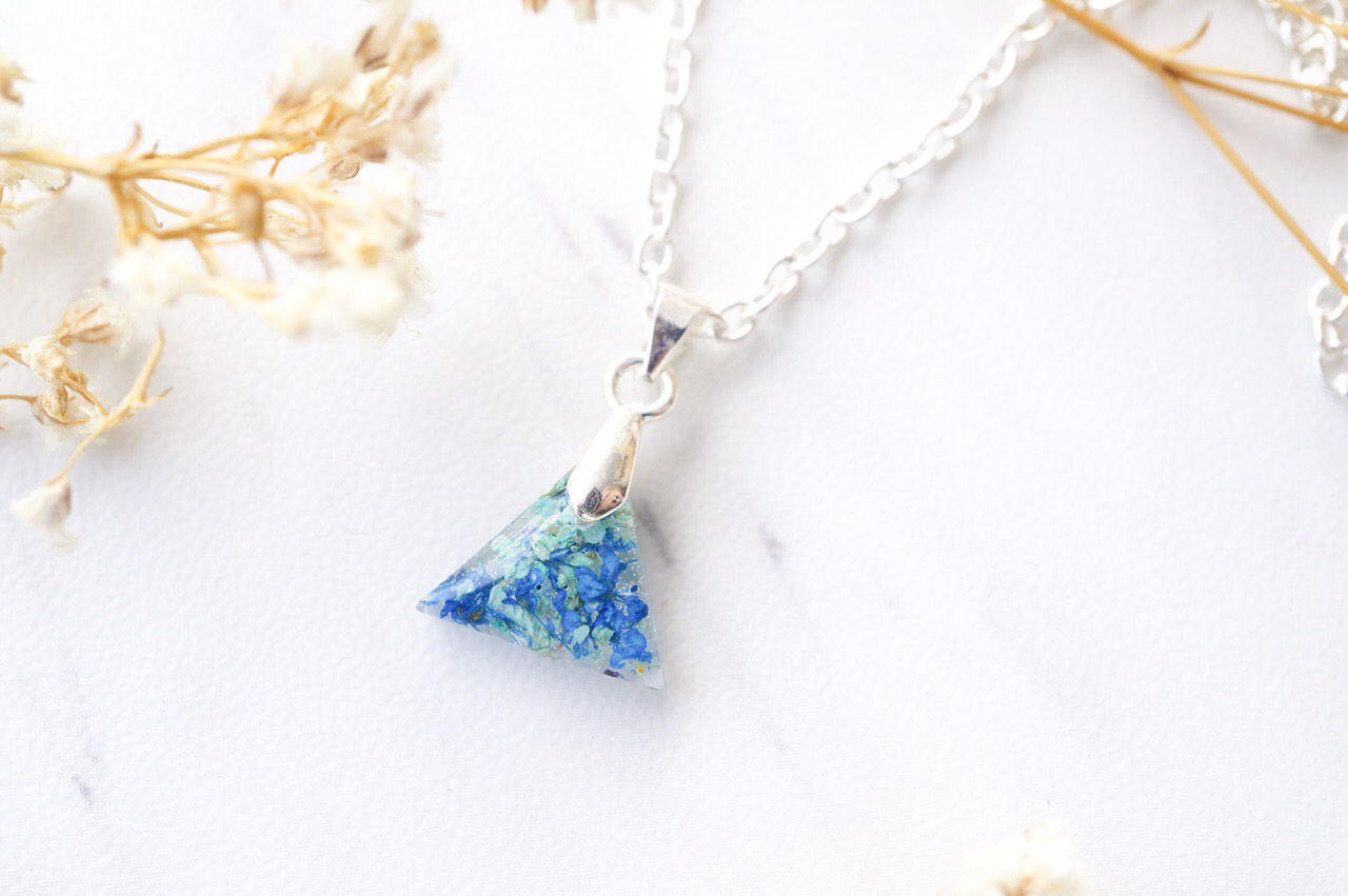 Real Dried Flowers in Triangle Resin Necklace in Blue Mint