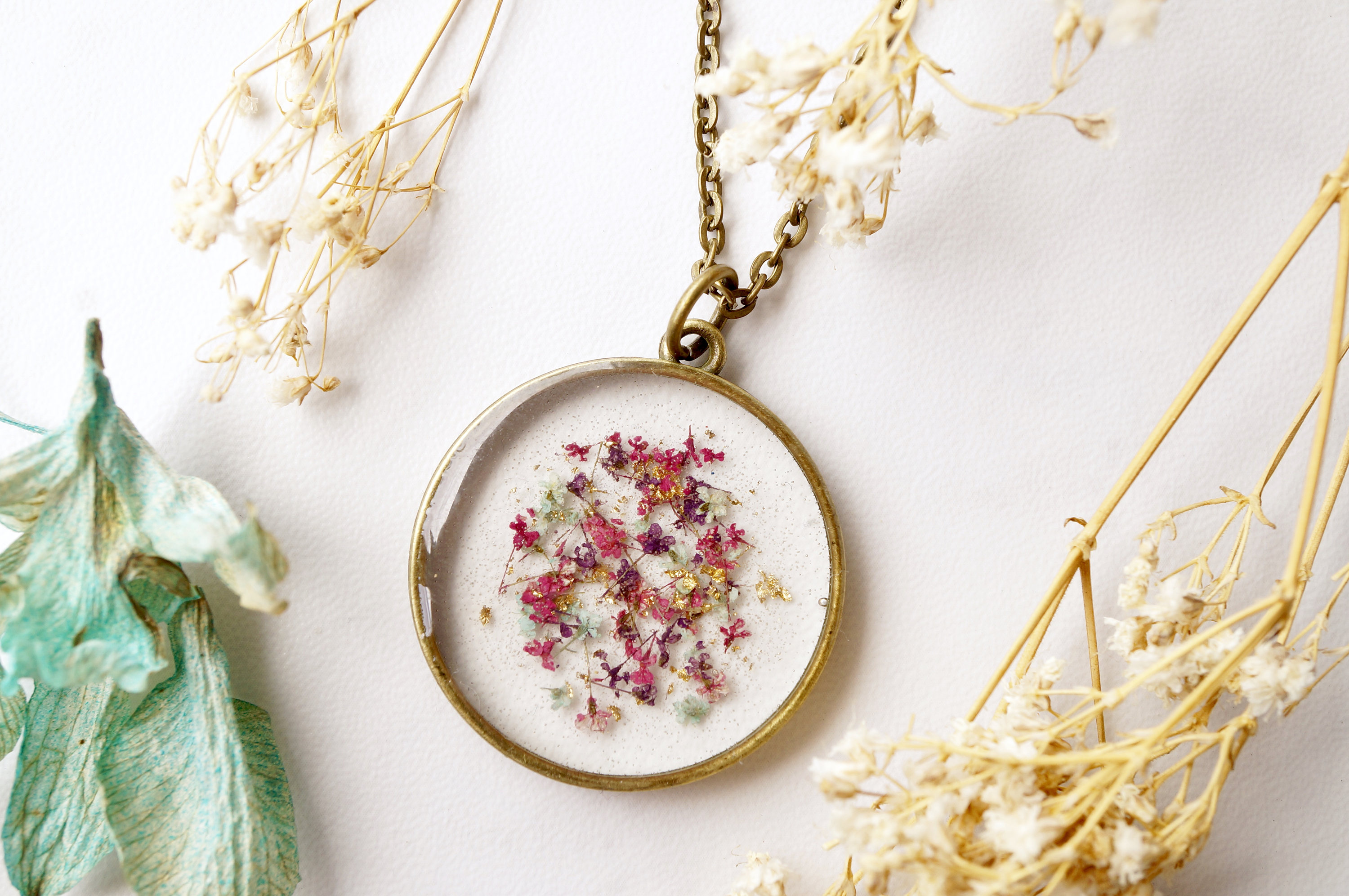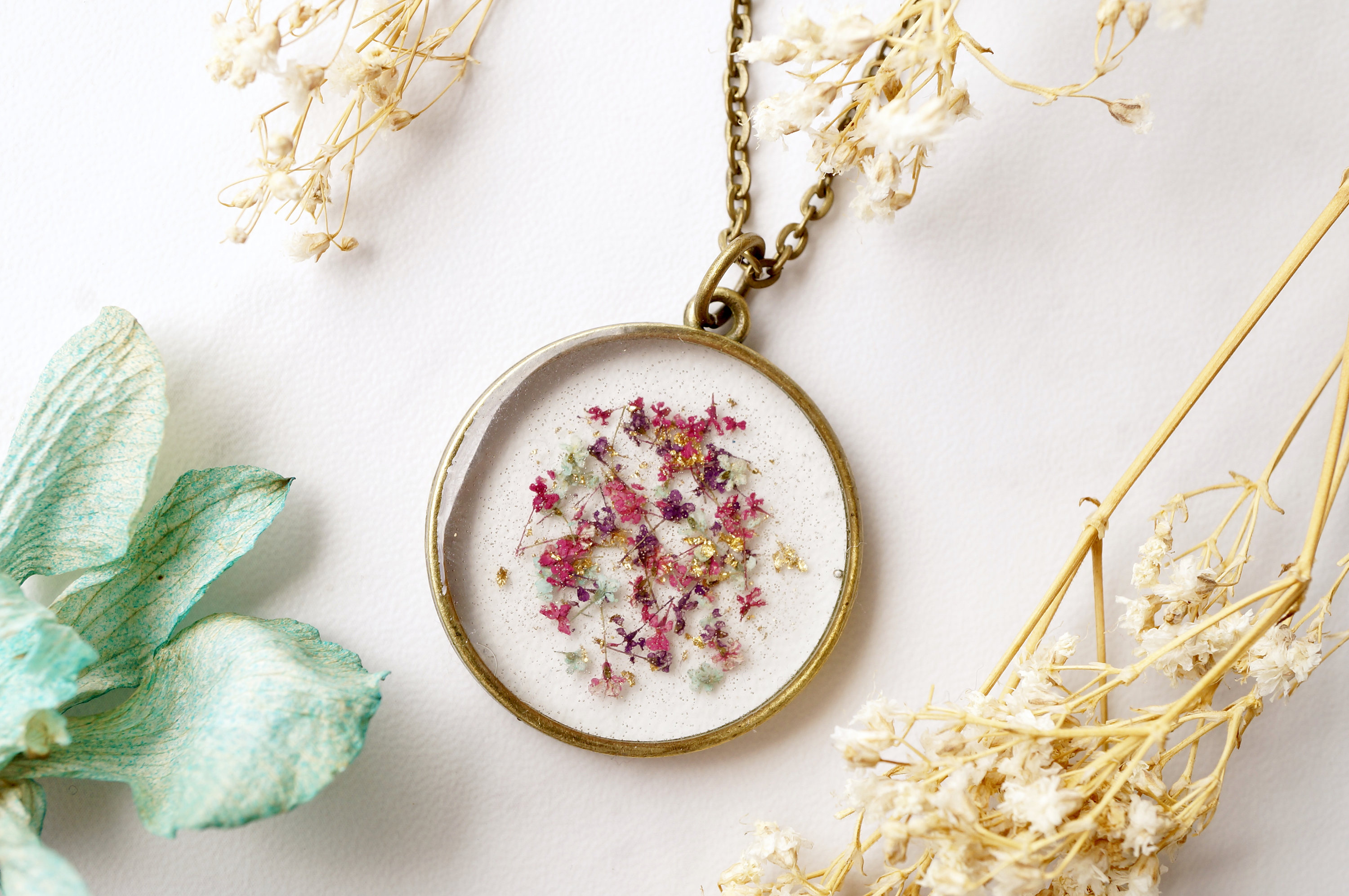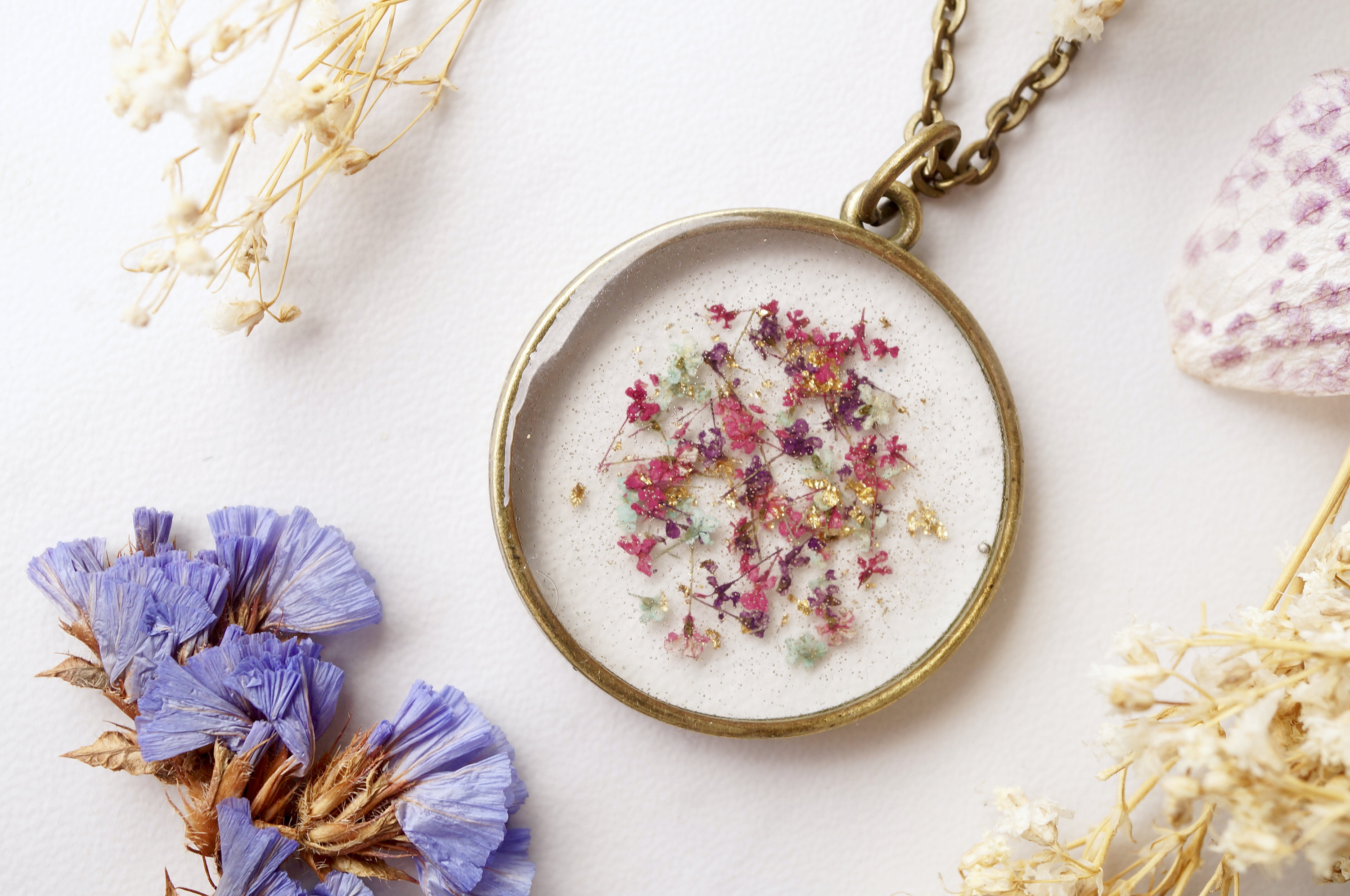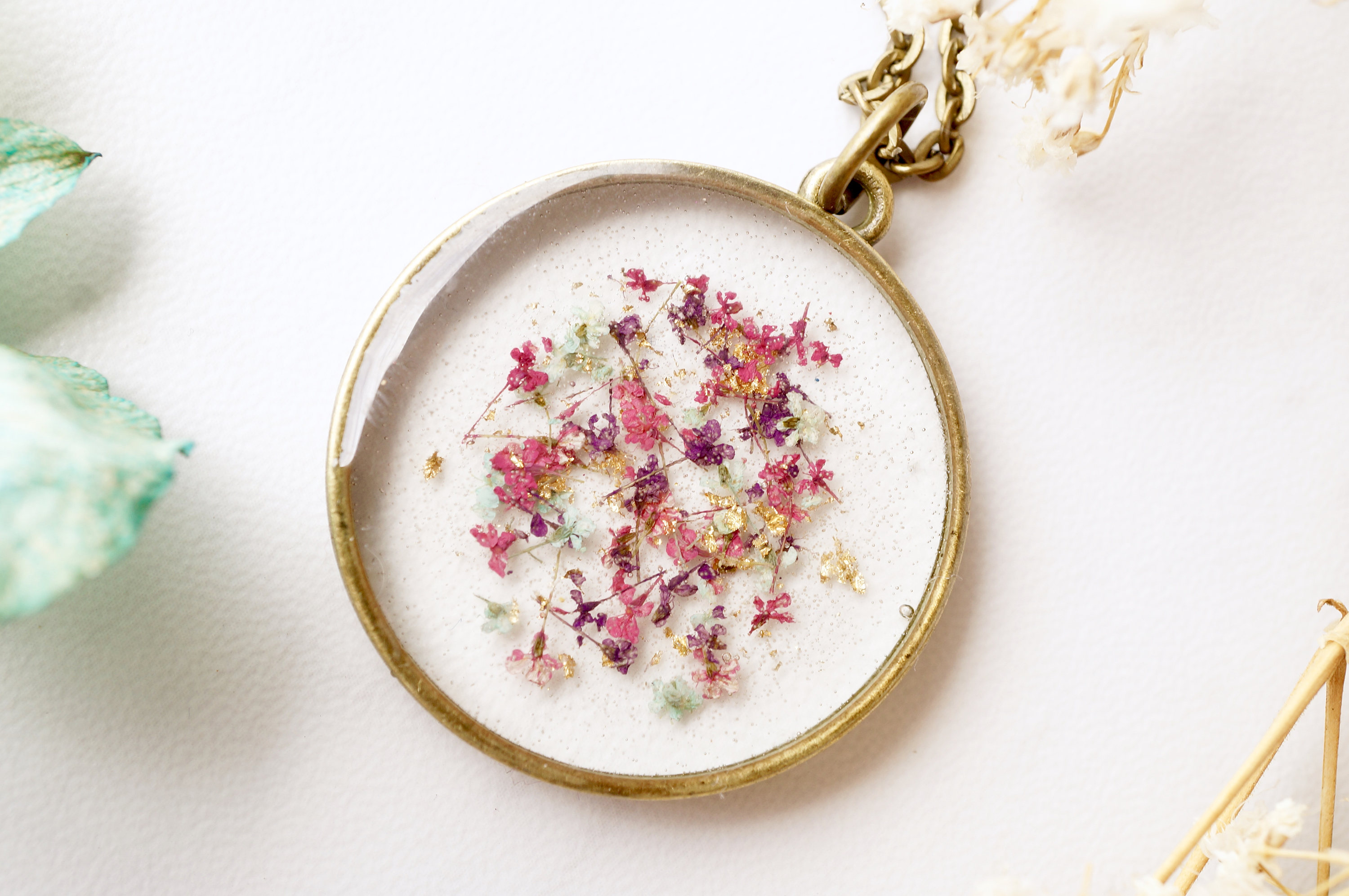 Real Dried Flowers in Resin, Circle Necklace in Pink Purple Mint Gold Flakes
