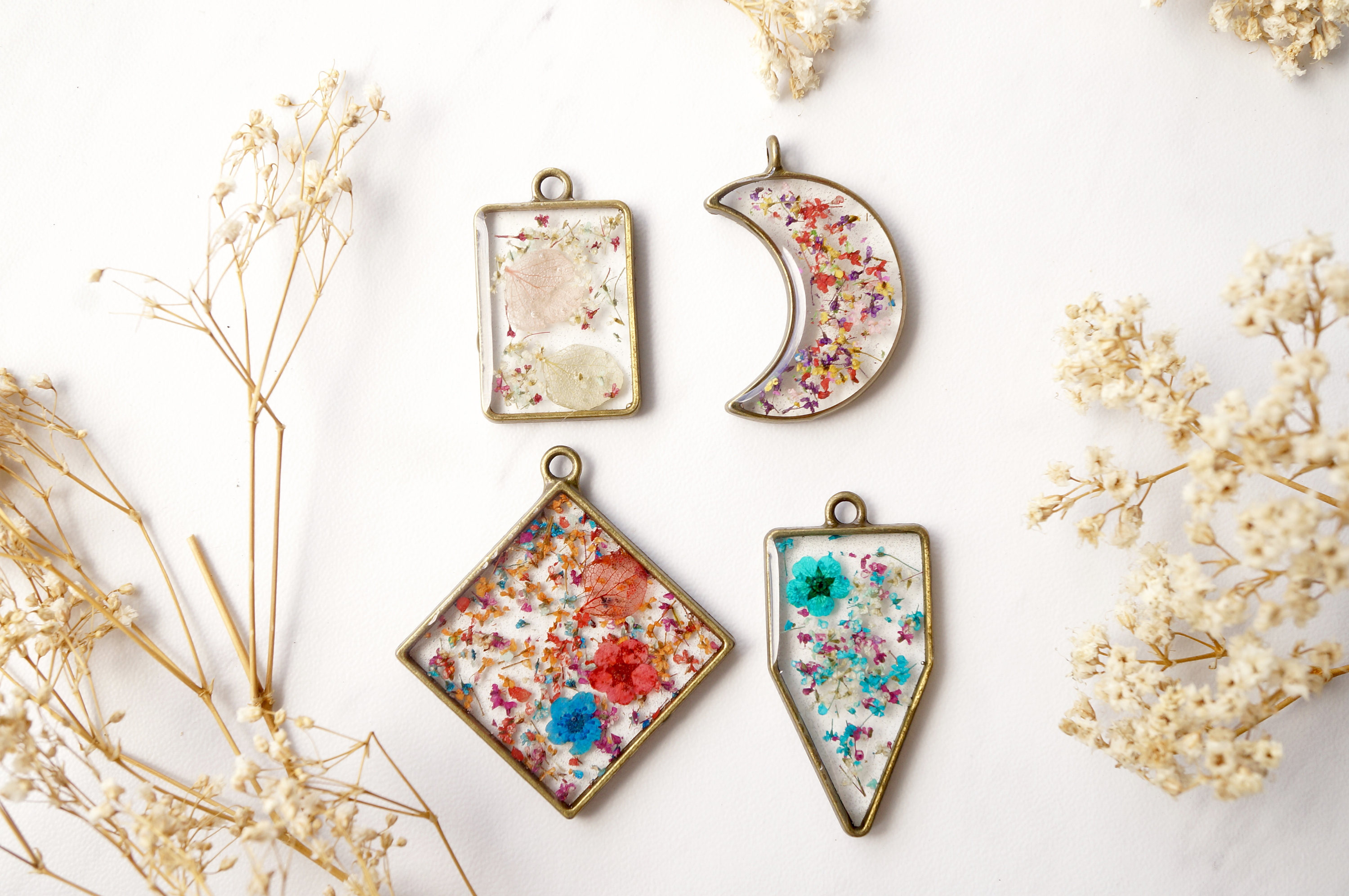 This necklace is handmade with real pressed flowers encased in resin. Surrounded by a beautiful metal bronze frame, this necklace is like wearing a piece of nature. Each piece is one of a kind. Sometimes we will use the same color combination, but no two are exactly alike!
