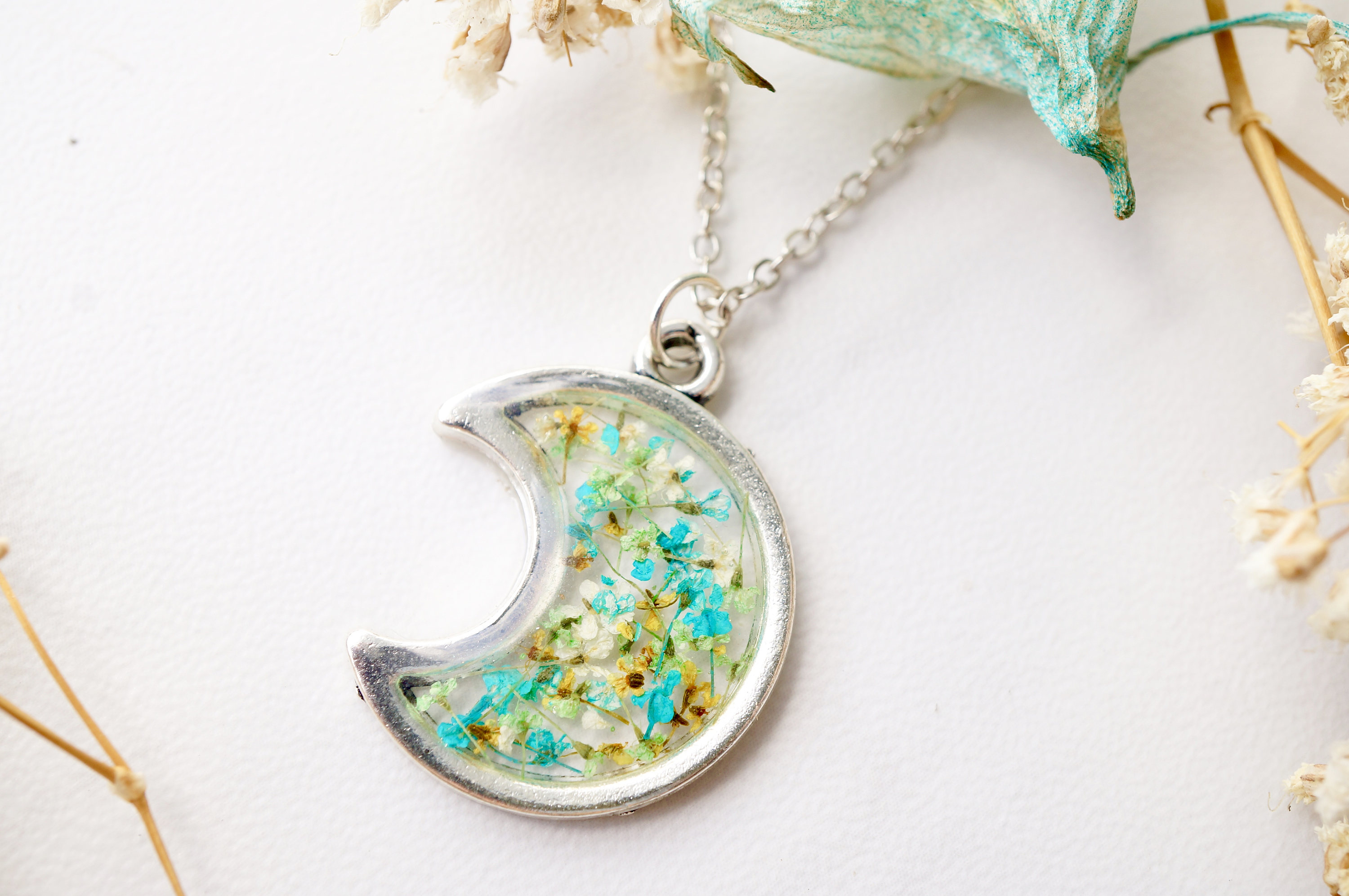 Real Dried Flowers and Resin Necklace, Silver Moon in Teal Green Yellow