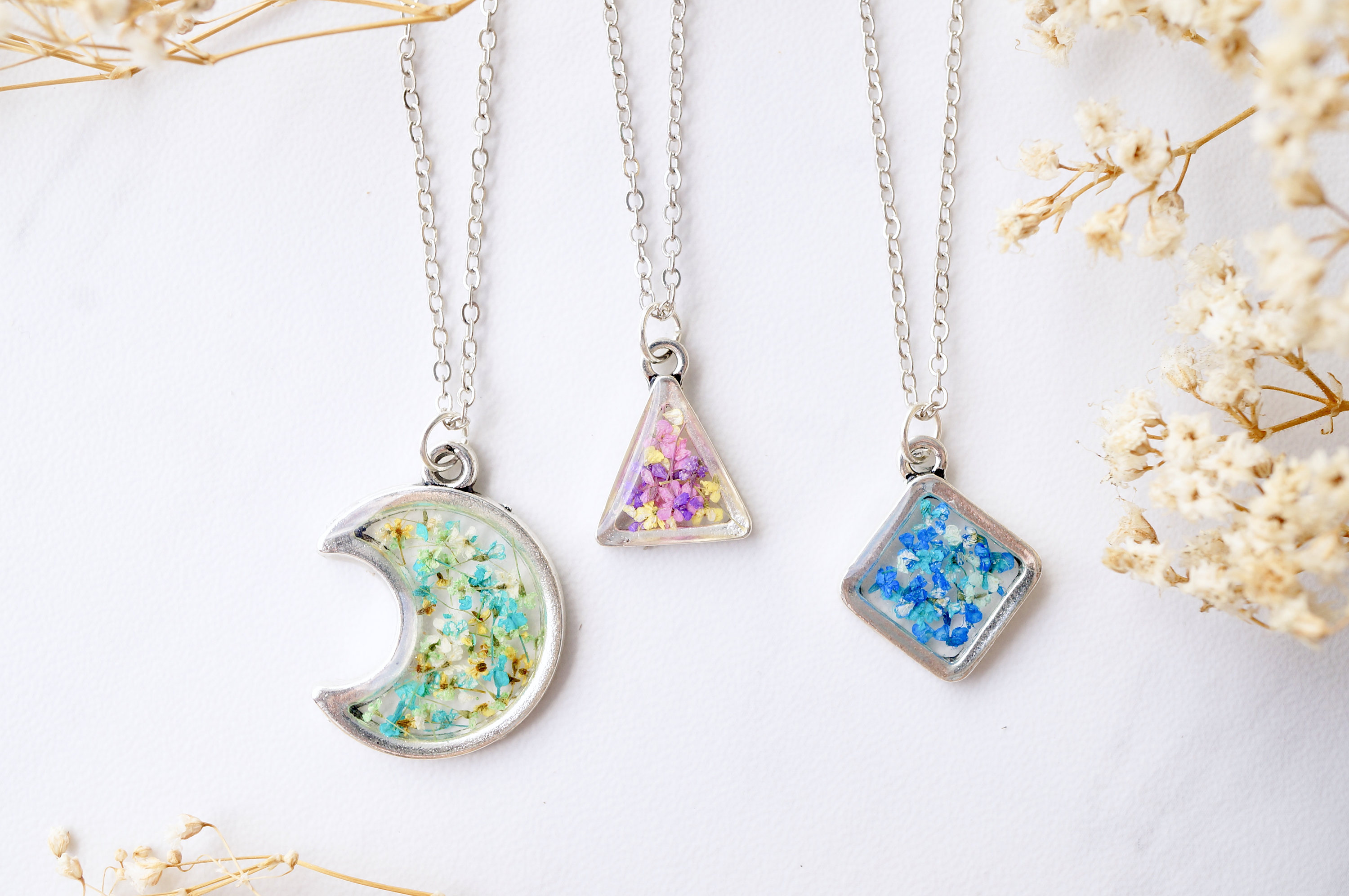 These necklaces are handmade with real pressed flowers encased in resin. Surrounded by a beautiful silver frame, this necklace is like wearing a piece of nature. Each piece is one of a kind. Sometimes we will use the same color combination, but no two are exactly alike!