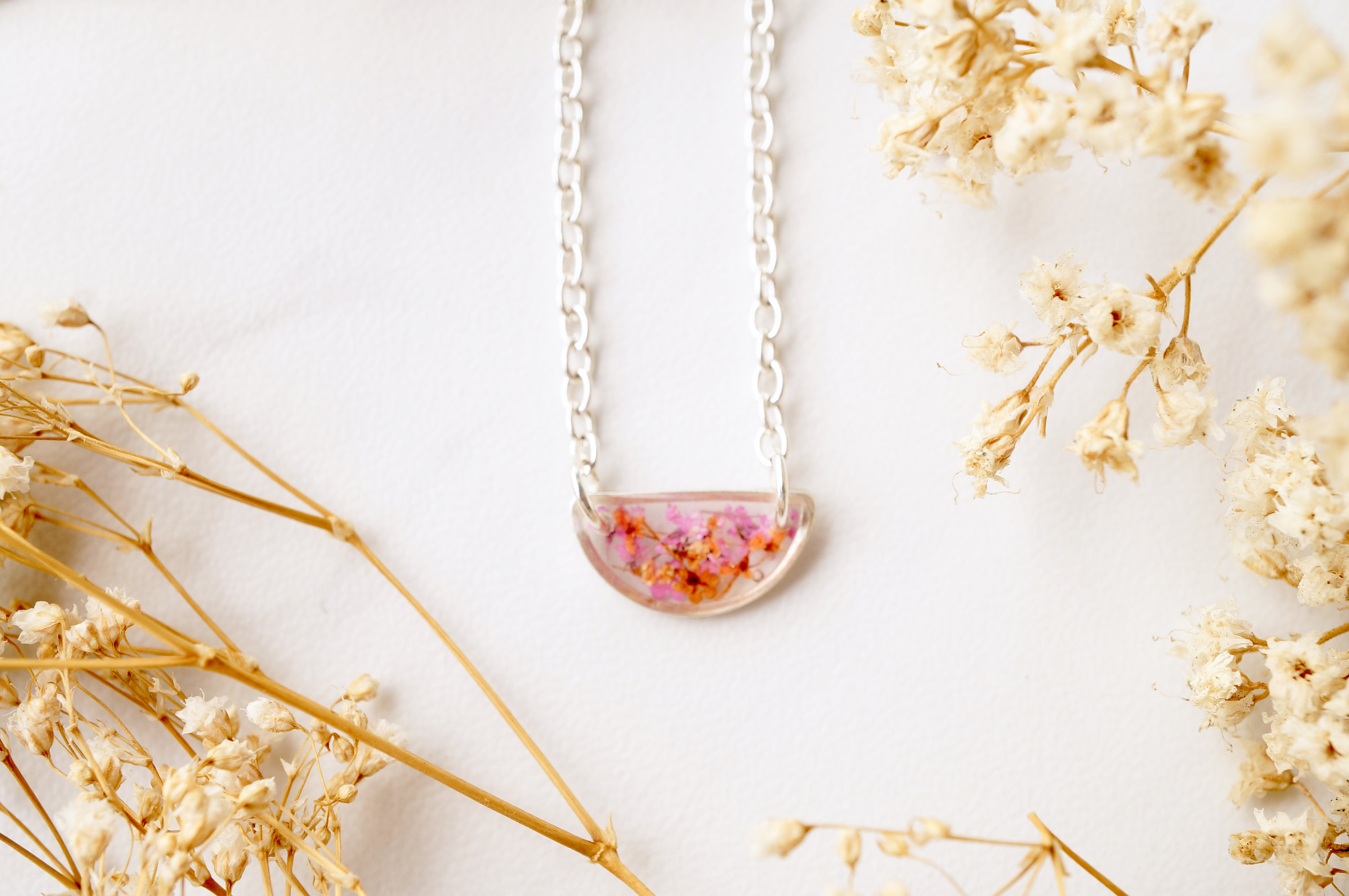 Real Dried Flowers in Resin Necklace, Small Silver Half Circle in Pink Orange Mix