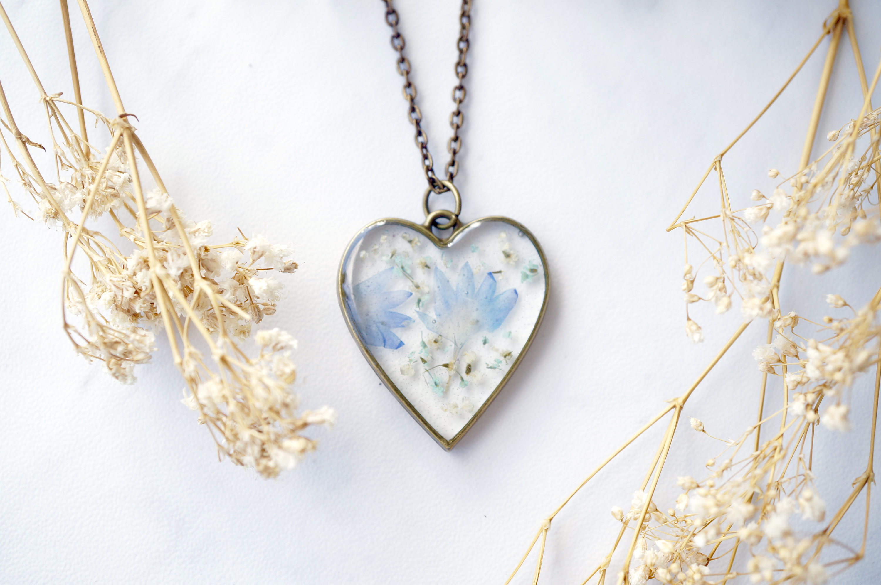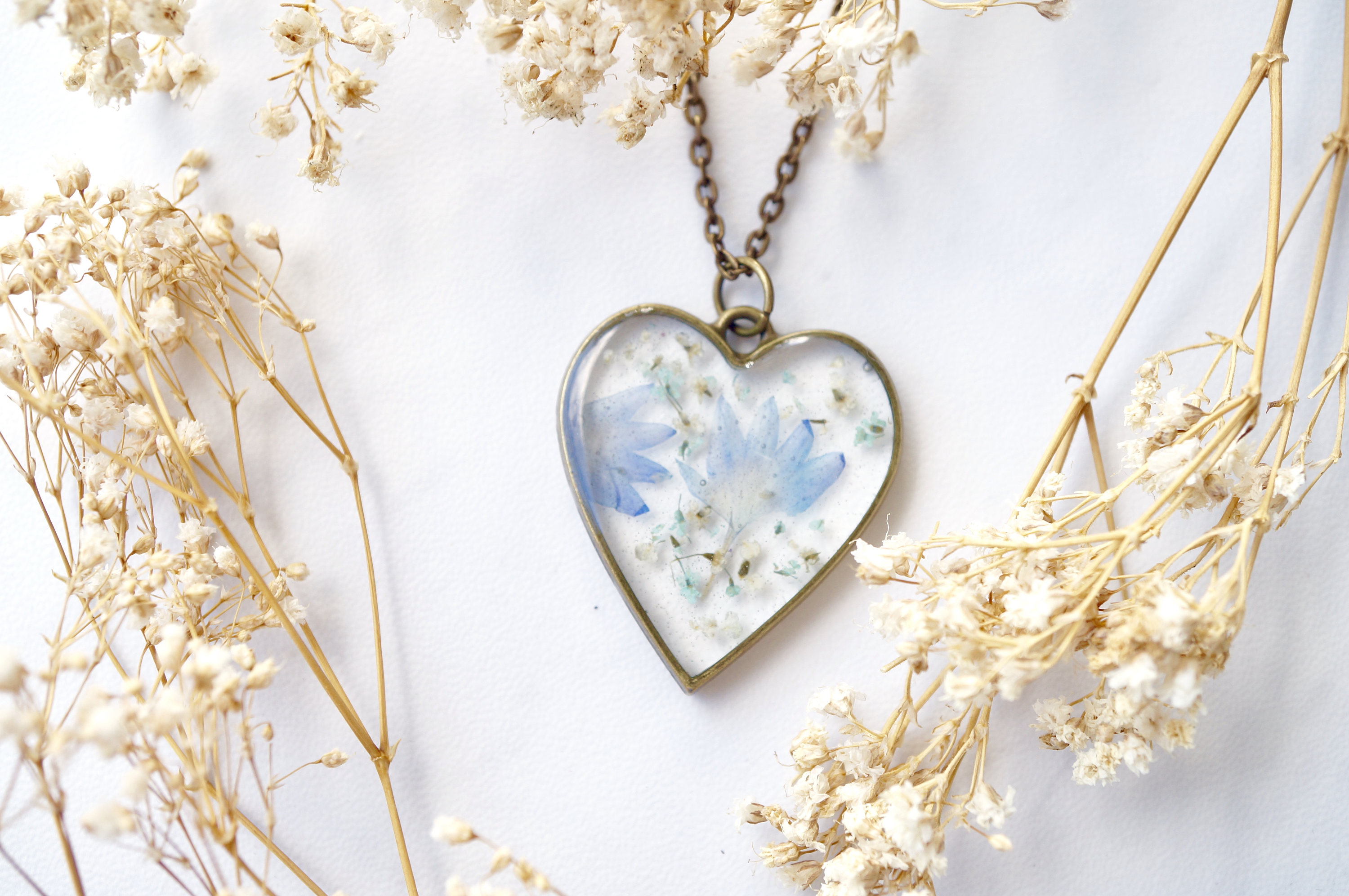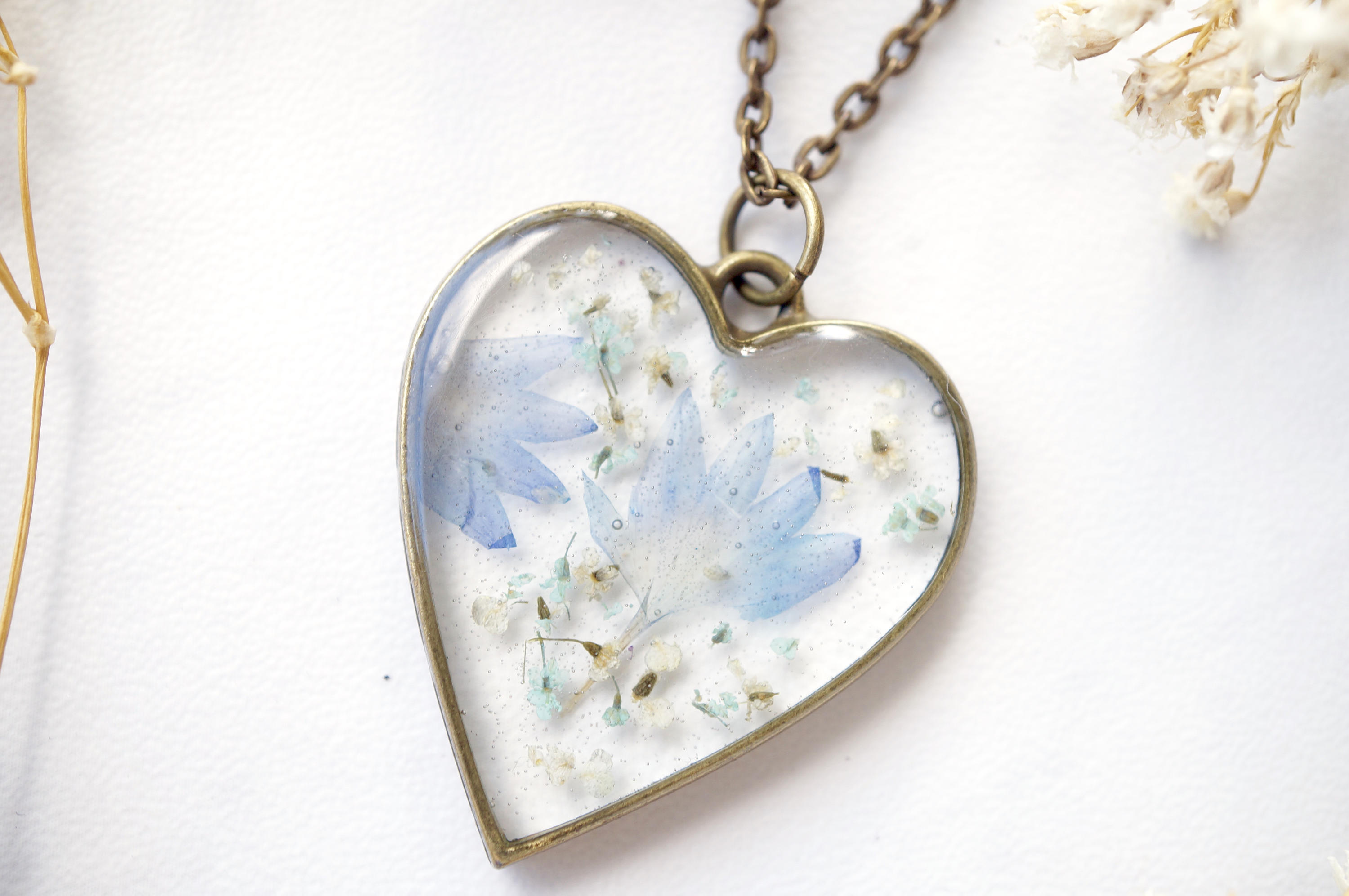 Real Dried Flowers in Resin, Heart Necklace in White Mint Periwinkle