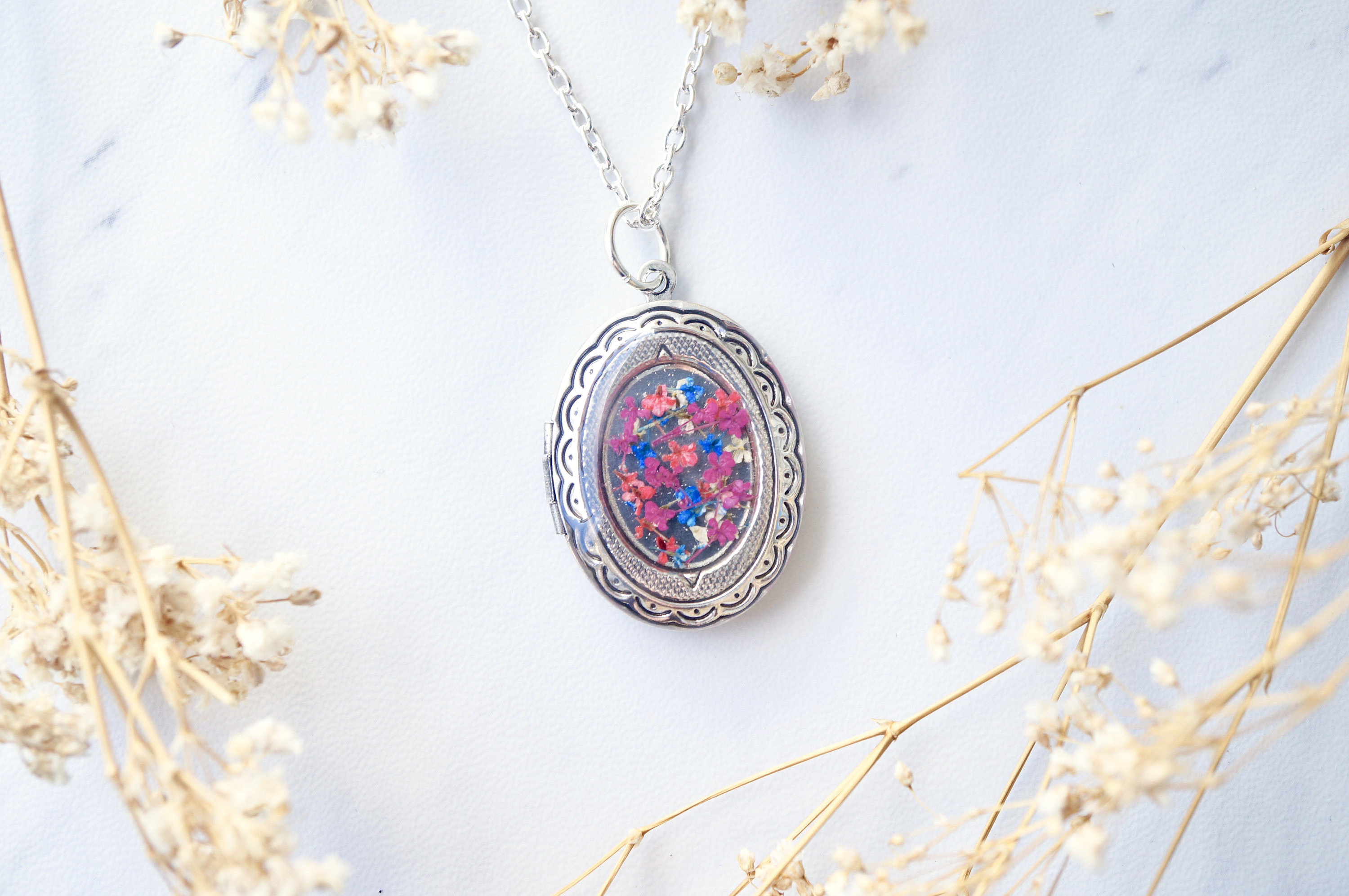 Real Dried Flowers in Resin and Silver Locket Necklace in Pink Blue White