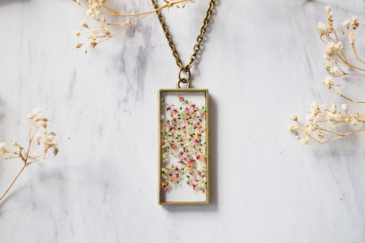 These necklaces are handmade with real pressed flowers encased in resin. Surrounded by a beautiful metal bronze frame, this necklace is like wearing a piece of nature. Each piece is one of a kind. Sometimes we will use the same color combination, but no two are exactly alike!