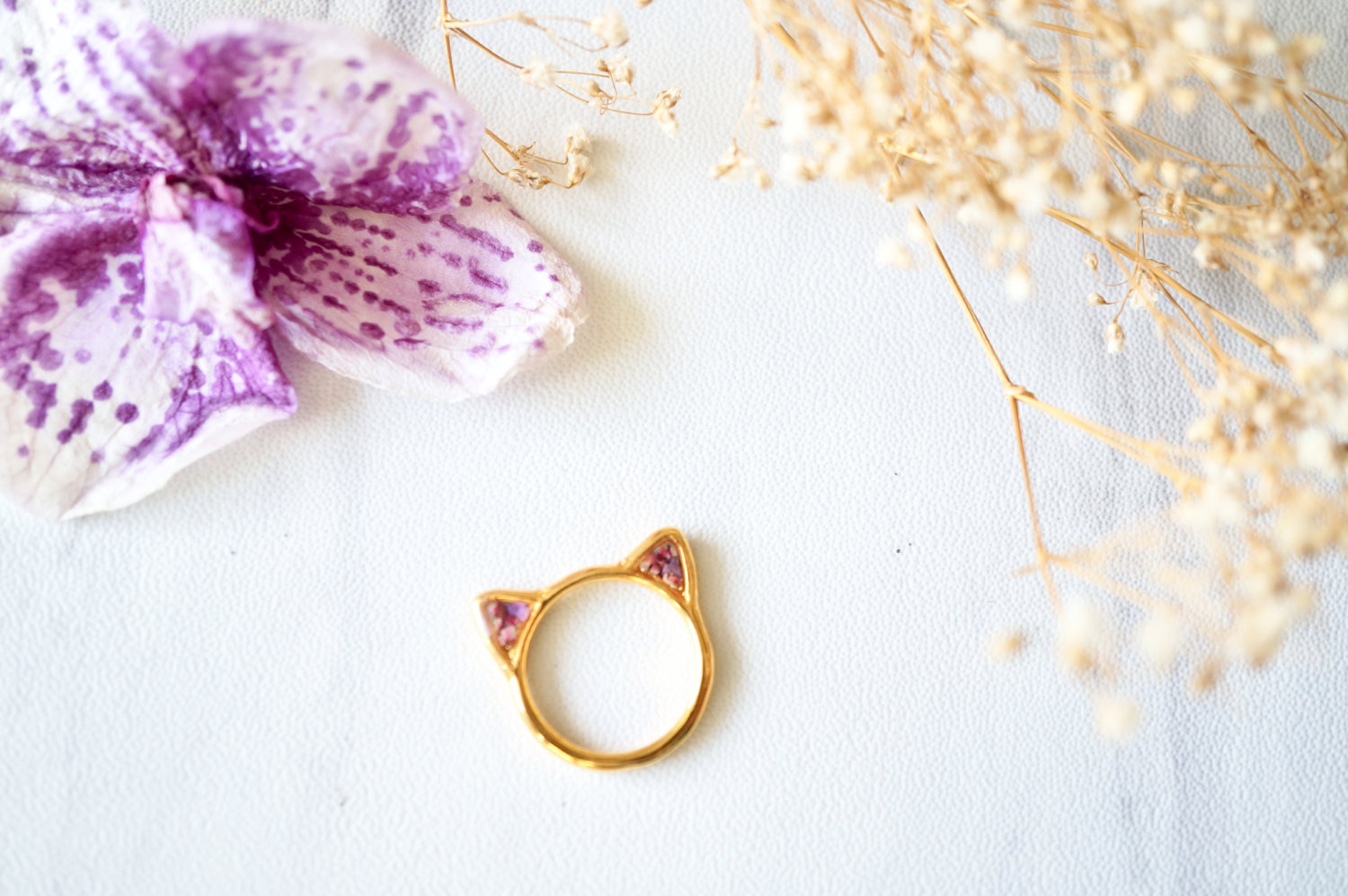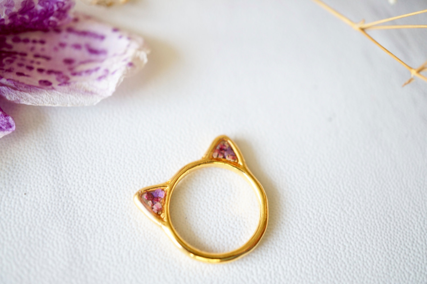 This adorable cat ring is handmade with real pressed flowers encased in resin inside the ears! This beautiful metal gold cat and flower ring is like wearing a piece of nature.