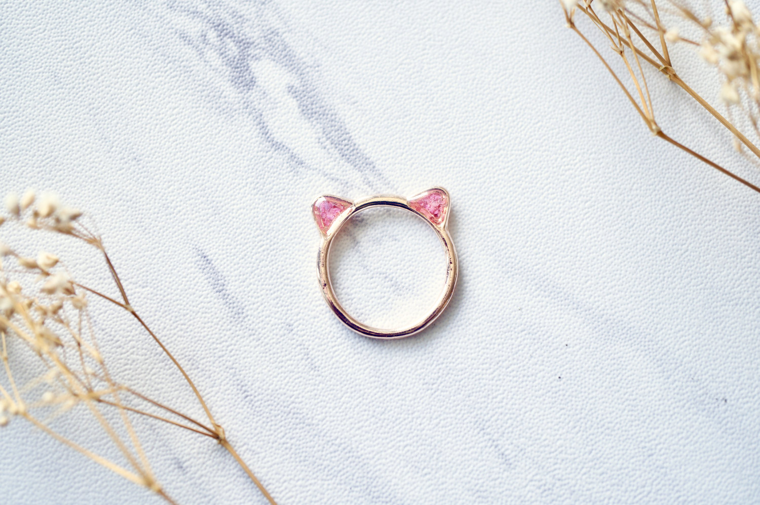This adorable cat ring is handmade with real pressed flowers encased in resin inside the ears! This beautiful metal rose gold cat and flower ring is like wearing a piece of nature.