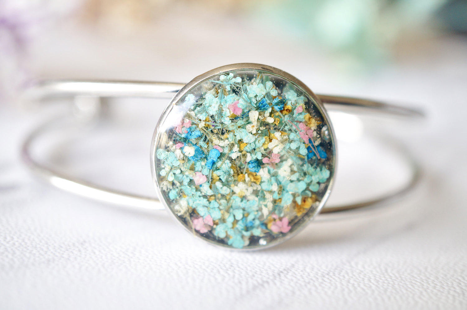 Real Dried Flowers and Resin Bracelet in Mint Blue Yellow Pink Mix