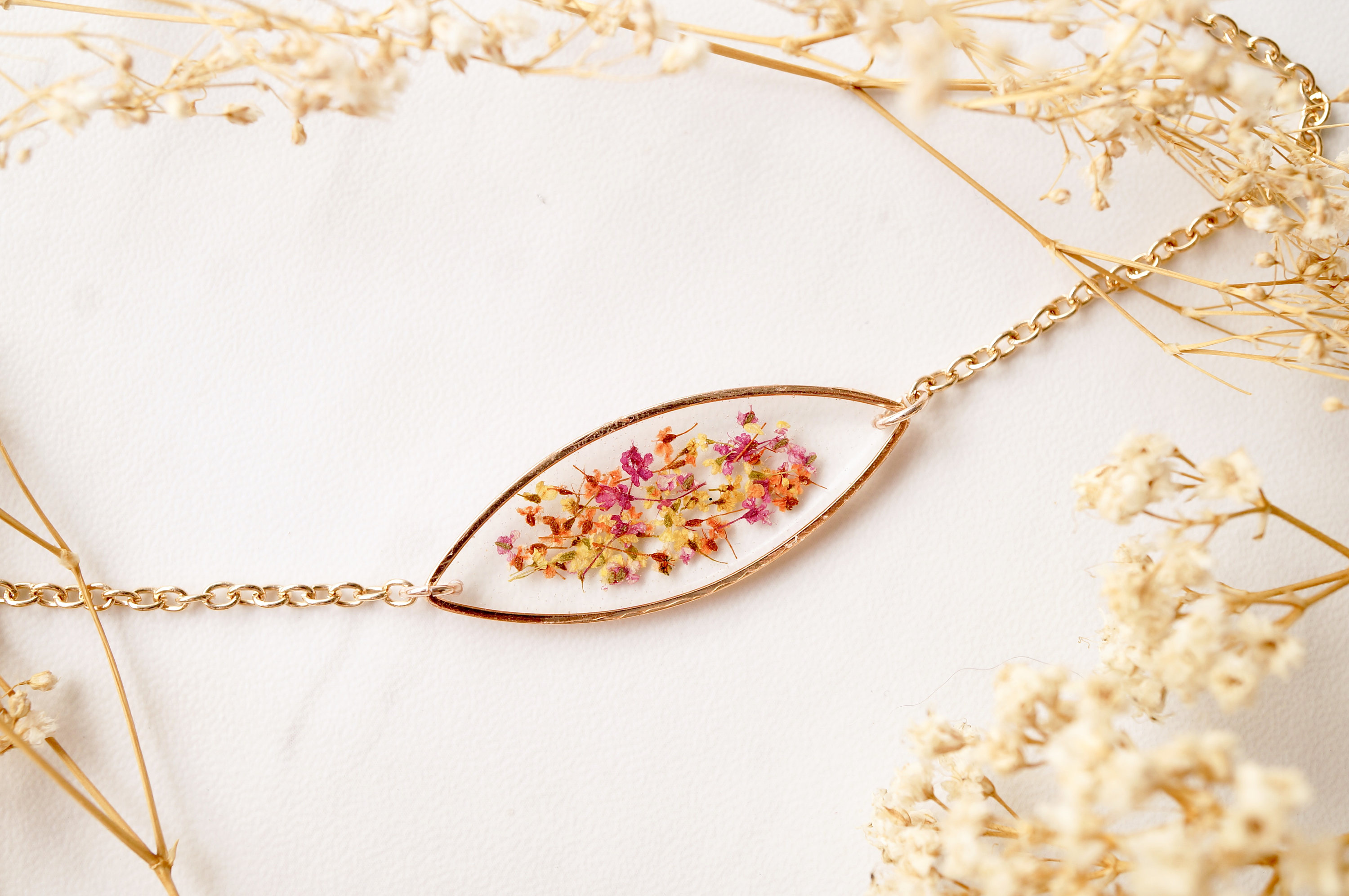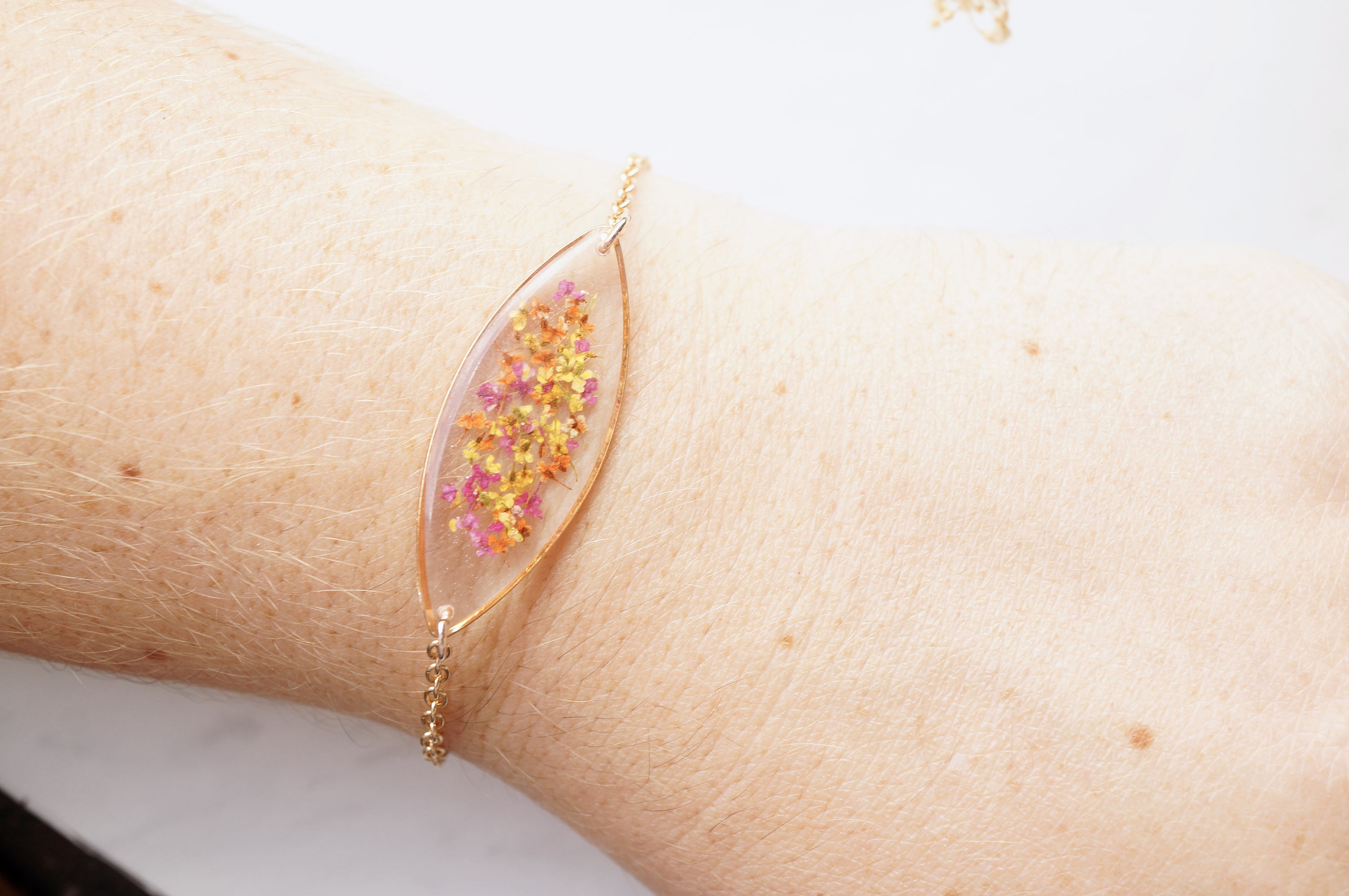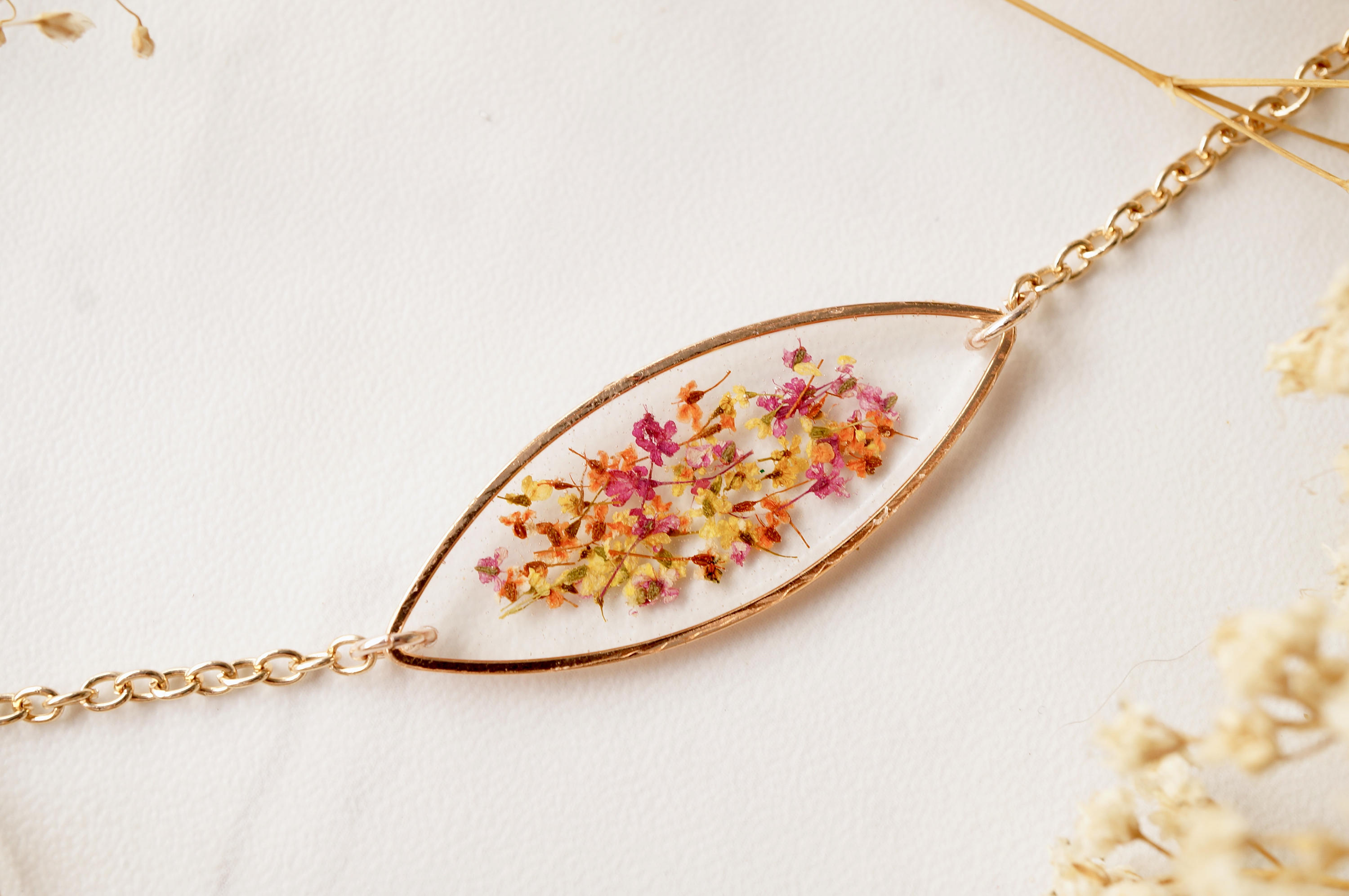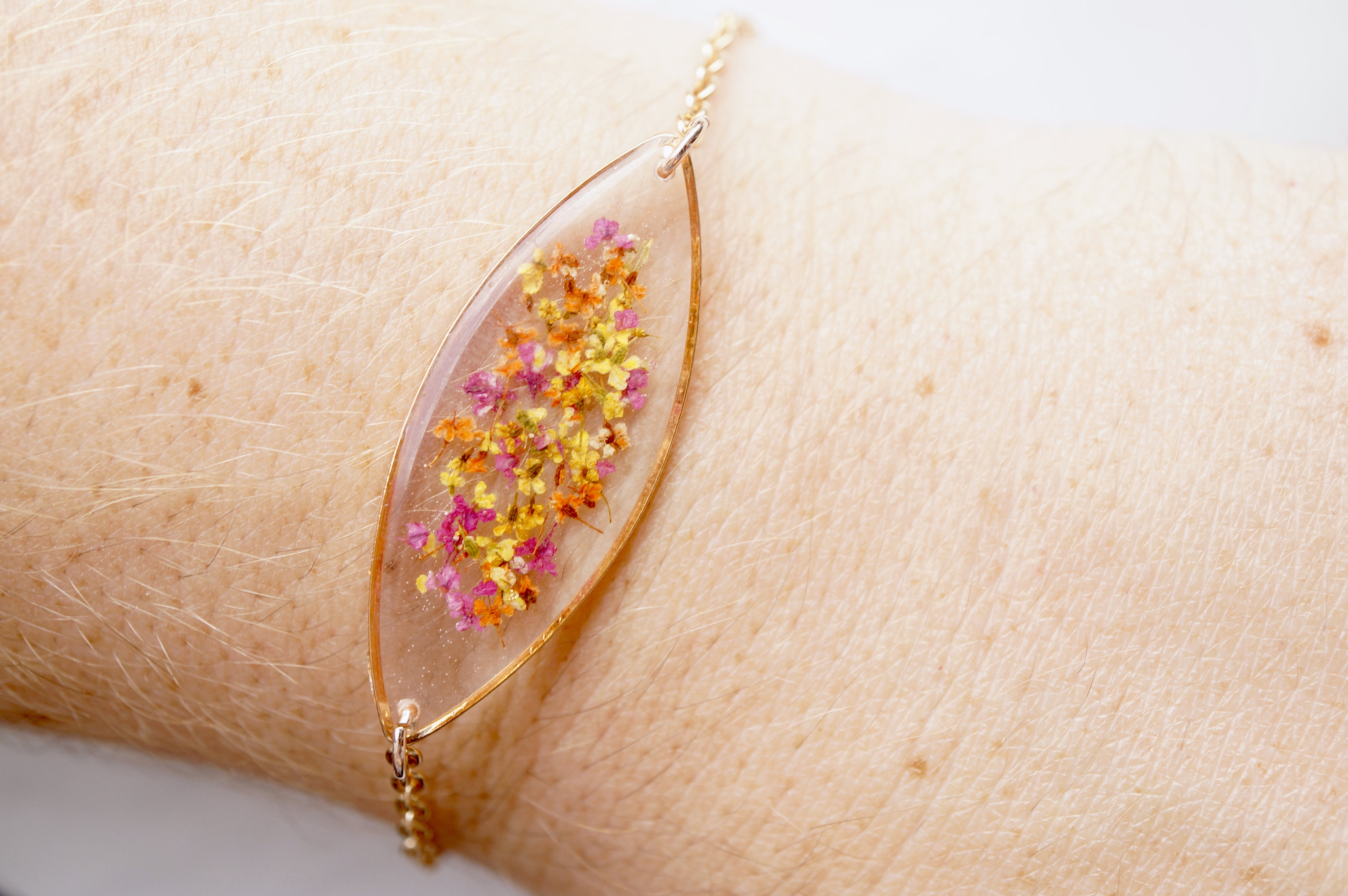 Real Dried Flowers and Resin Bracelet, Rose Gold in Red Orange Yellow Mix