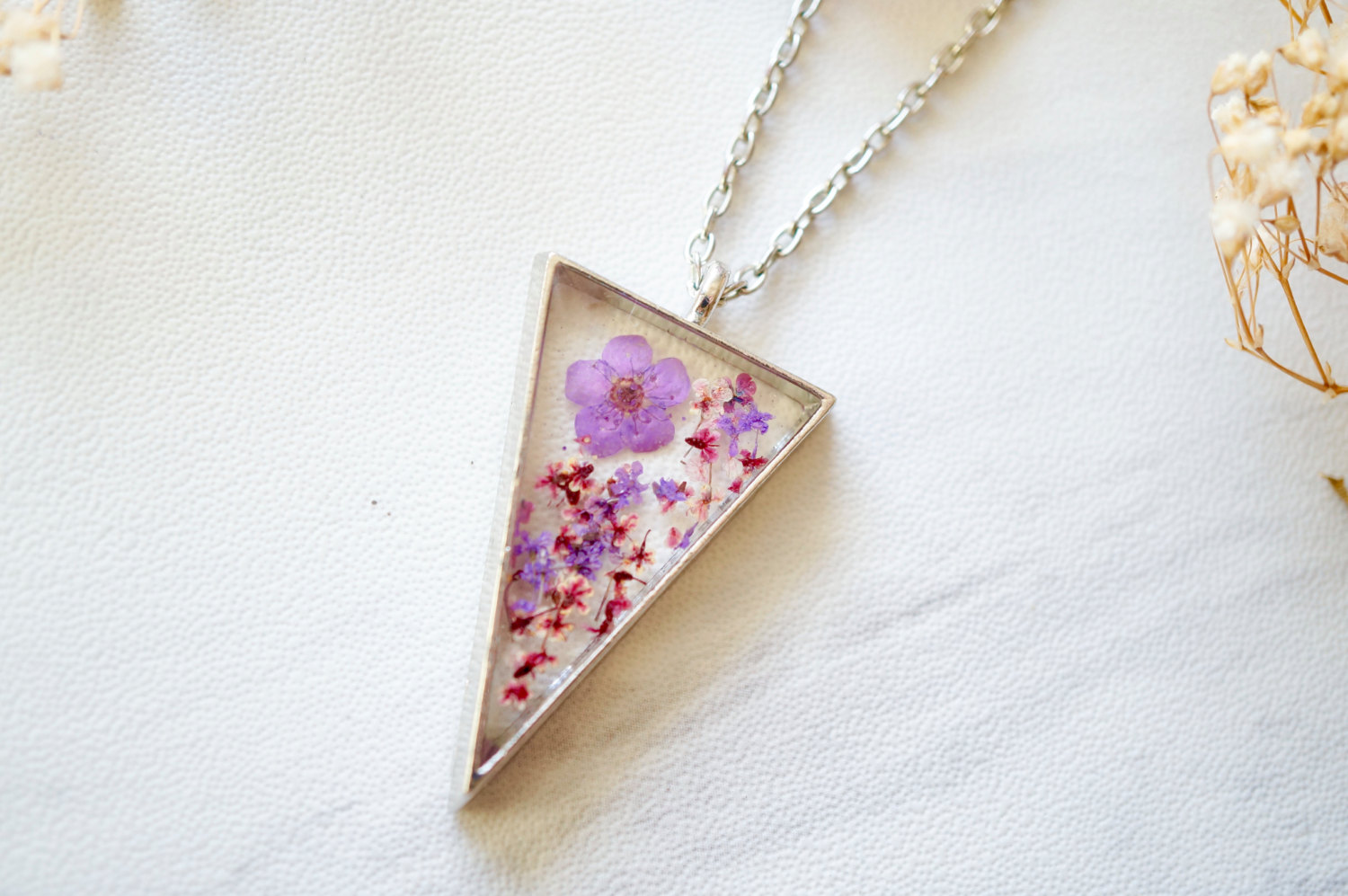 Real Pressed Flower and Resin Necklace Silver Triangle in Purple and Magenta