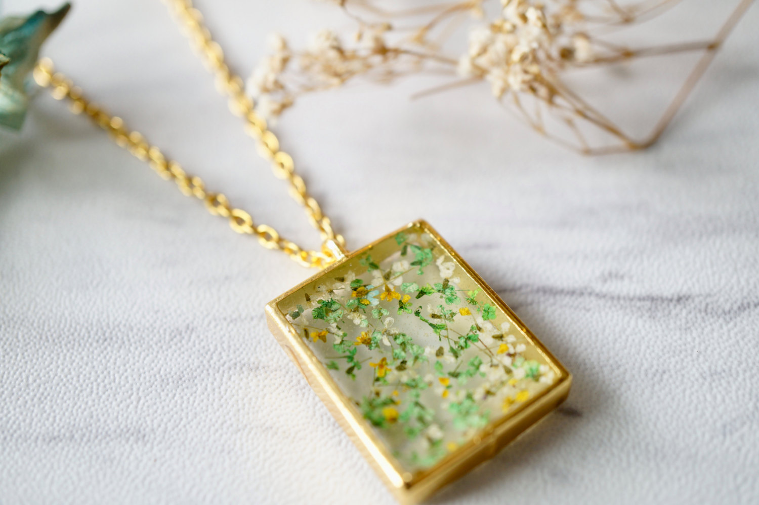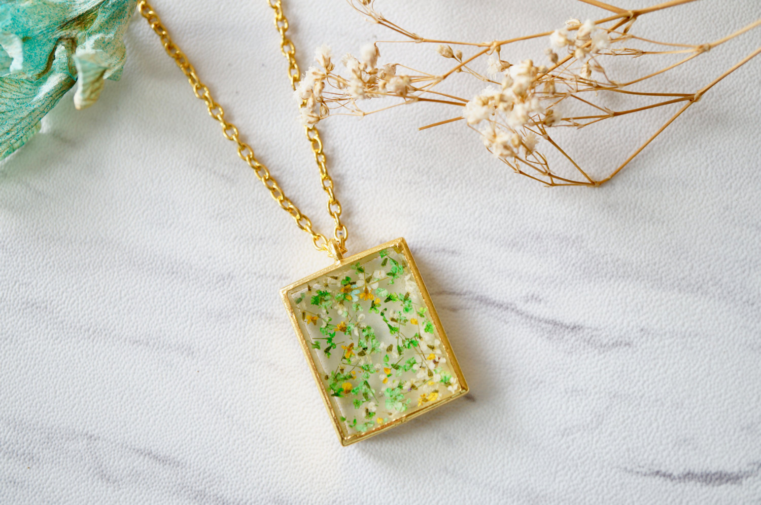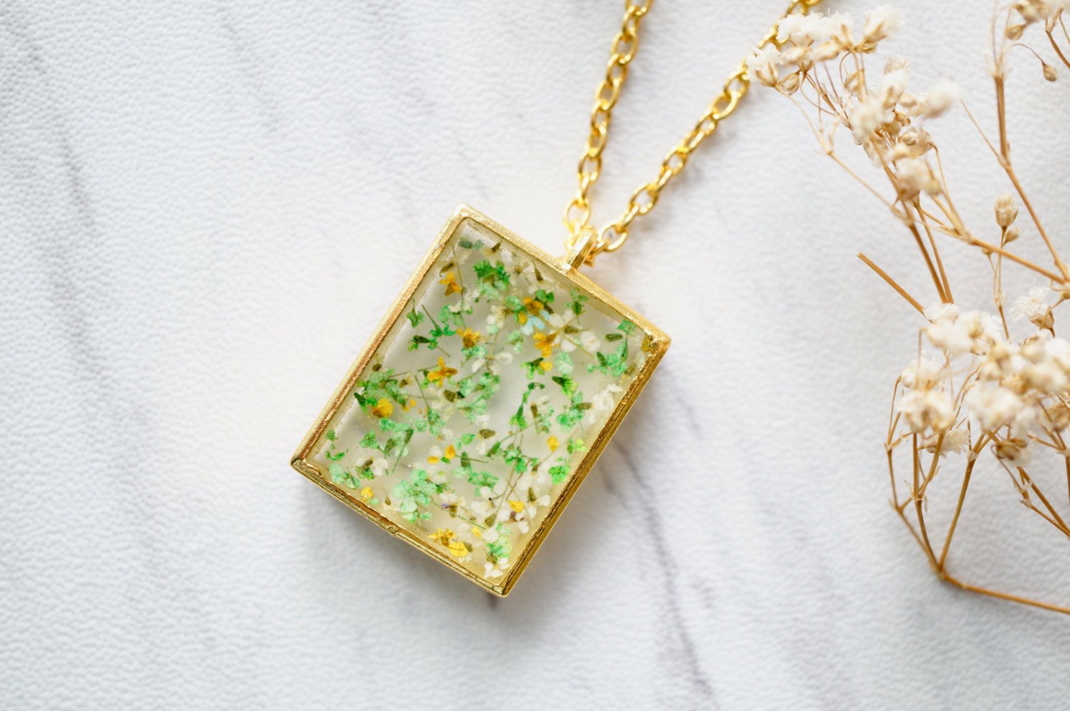 Real Dried Flowers in Resin Square Necklace in Gold Yellow Green White