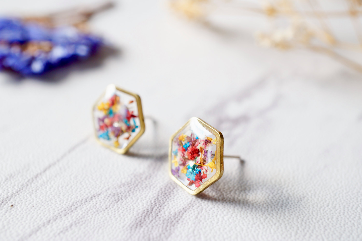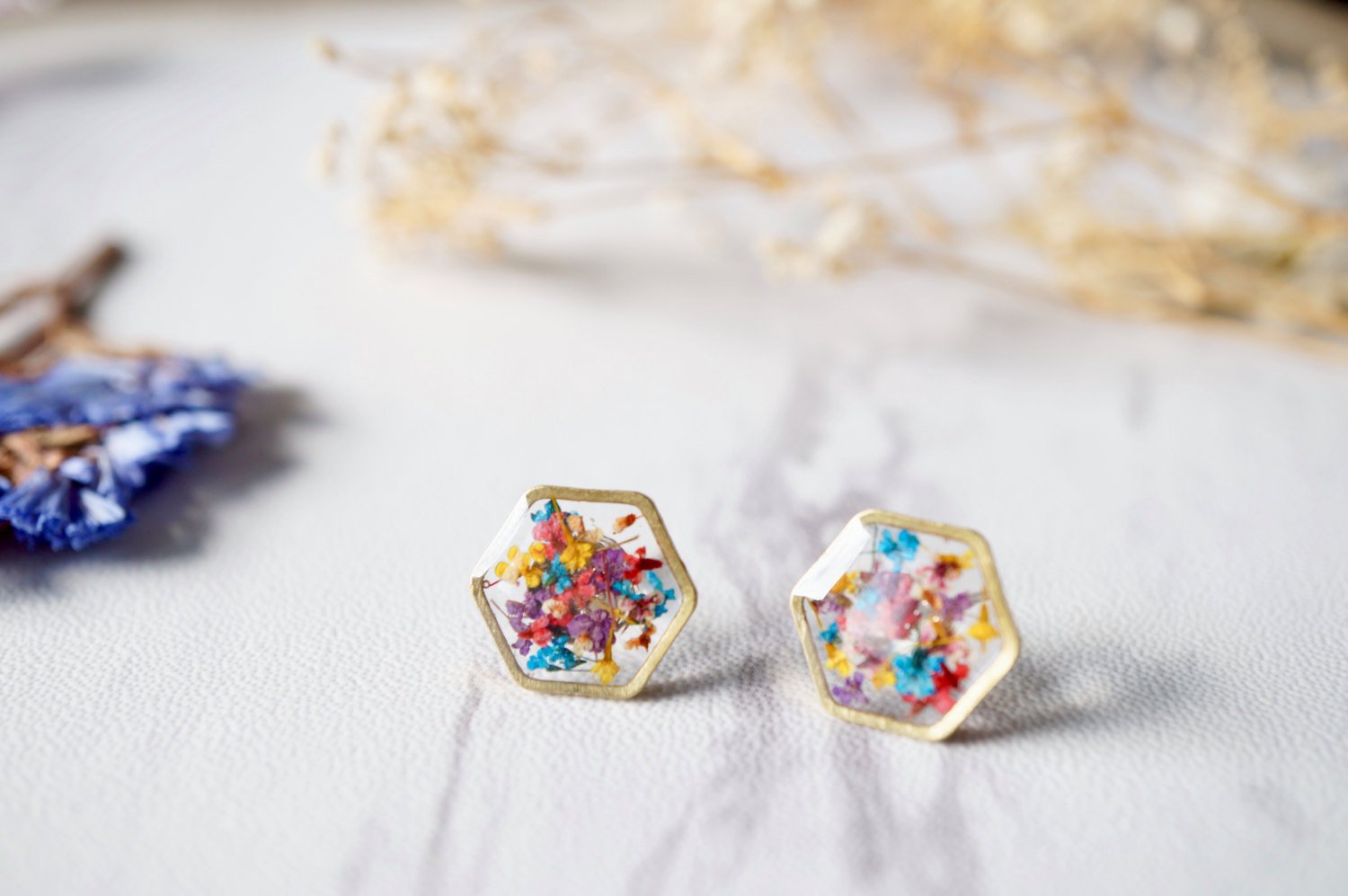 Real Dried Flowers and Resin Hexagon Stud Earrings in Blue Purple Red Yellow