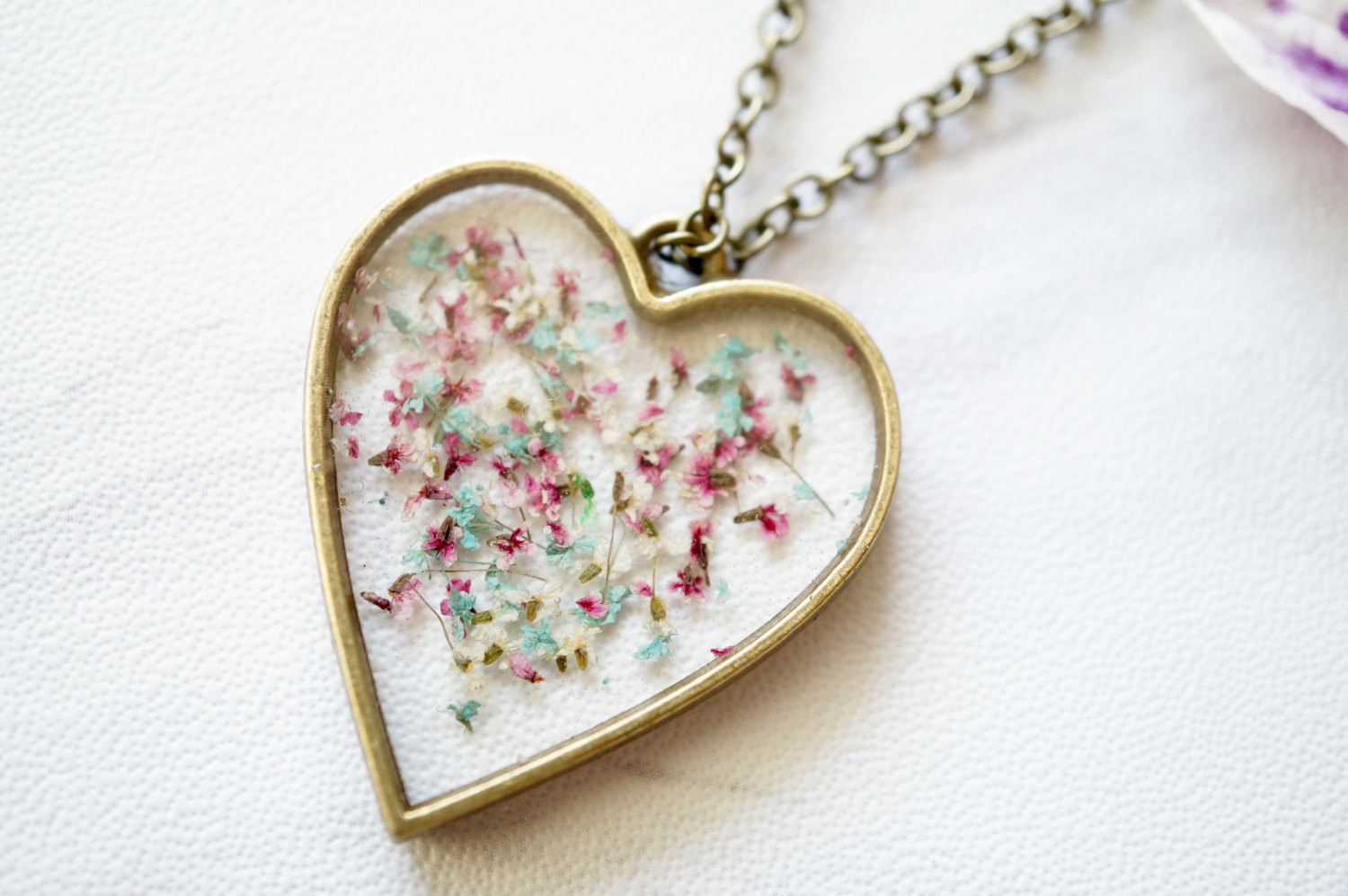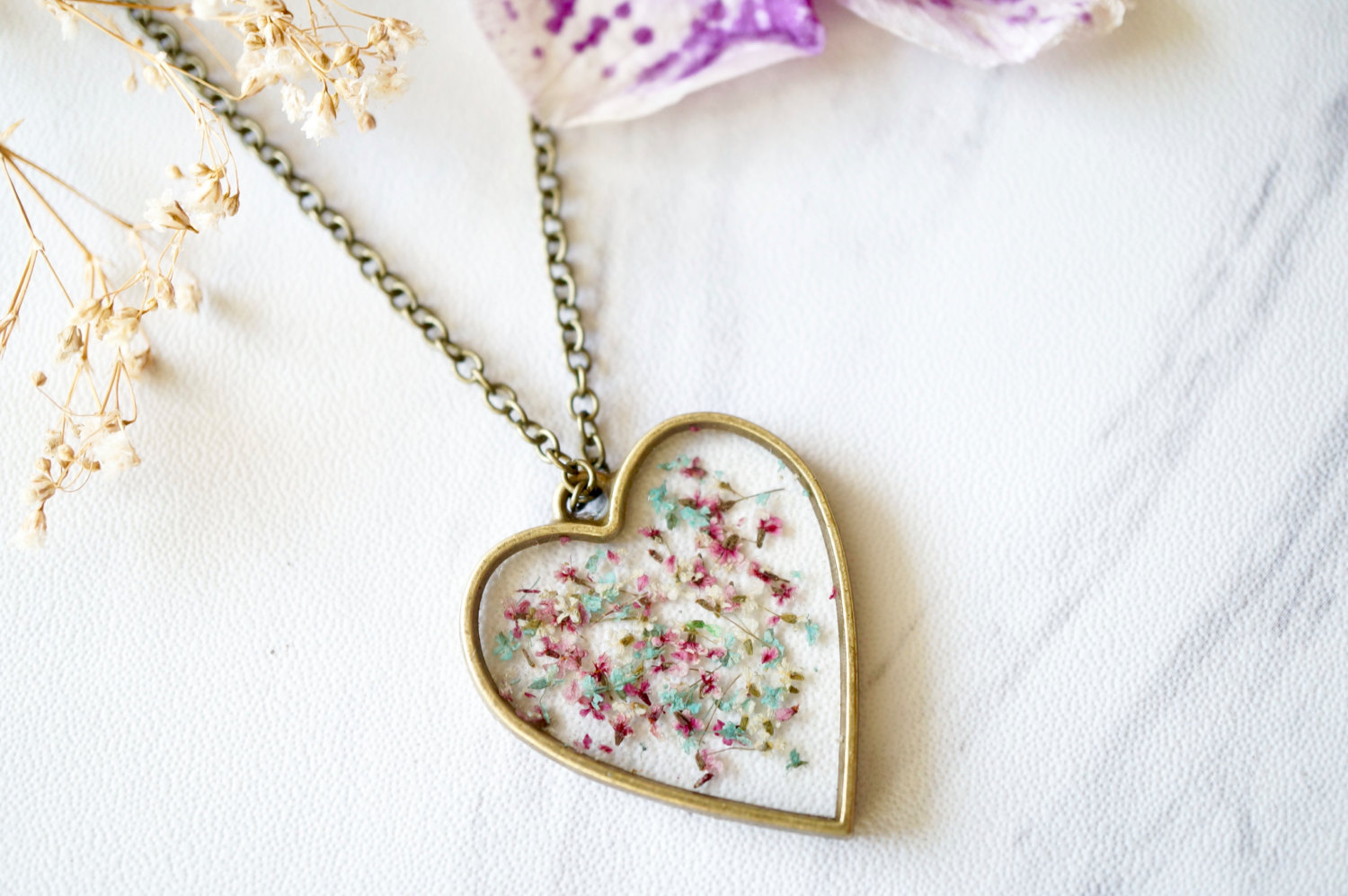 Real Dried Flowers in Resin Heart Necklace in Mint Pink White
