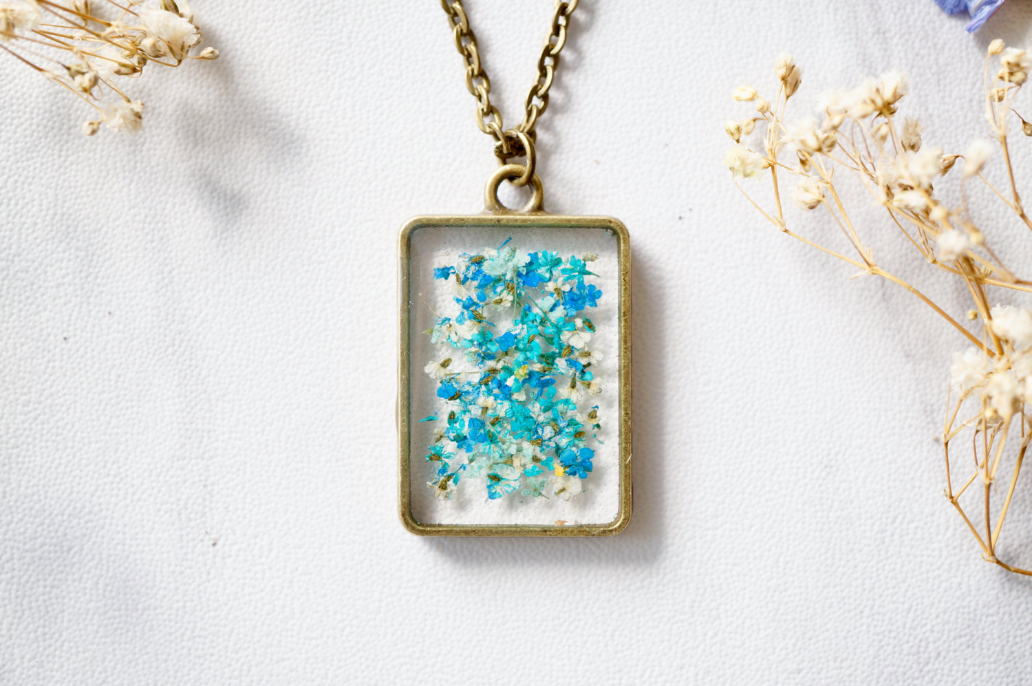 Real Pressed Flower and Resin Necklace in Teal Mint Blue Mix
