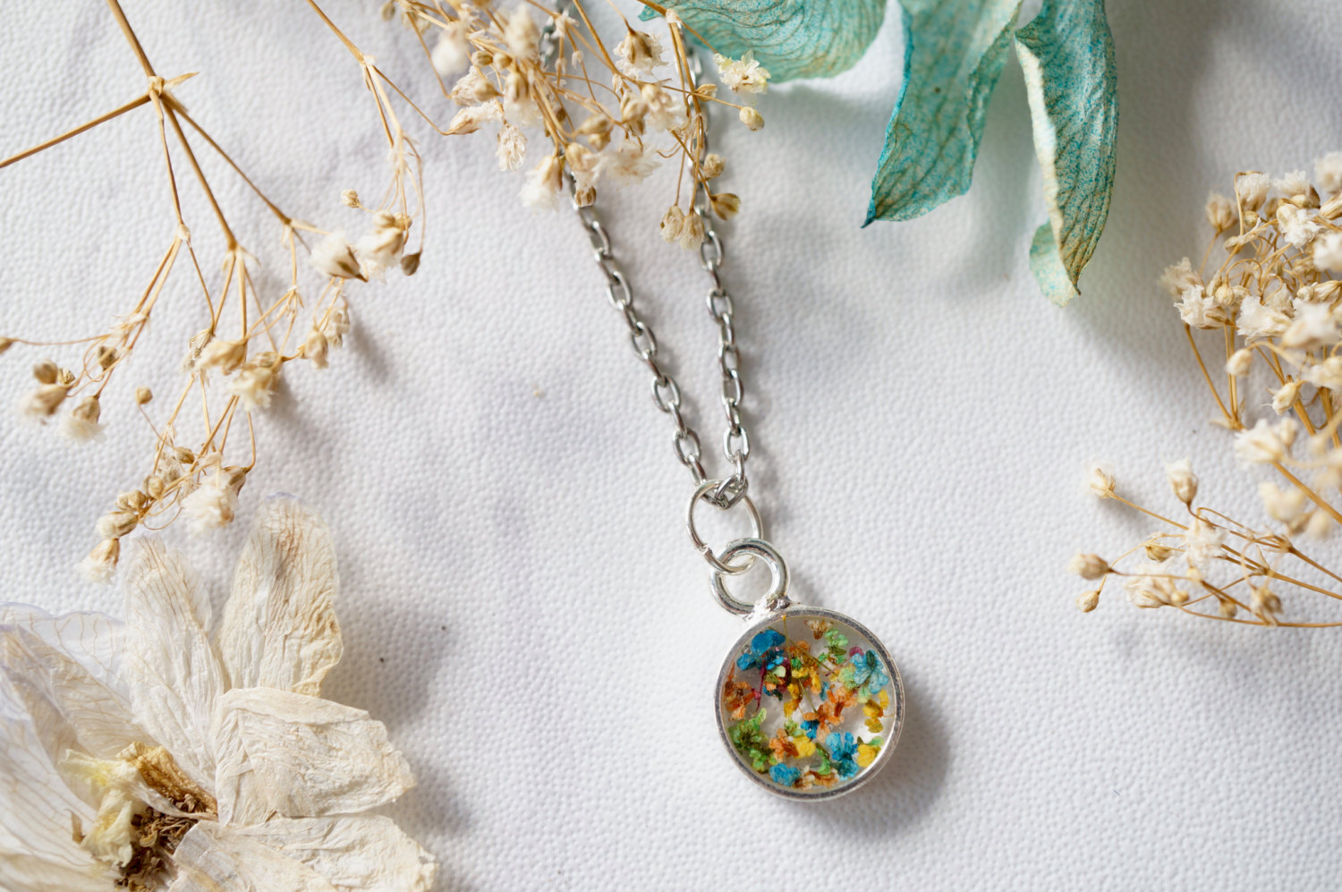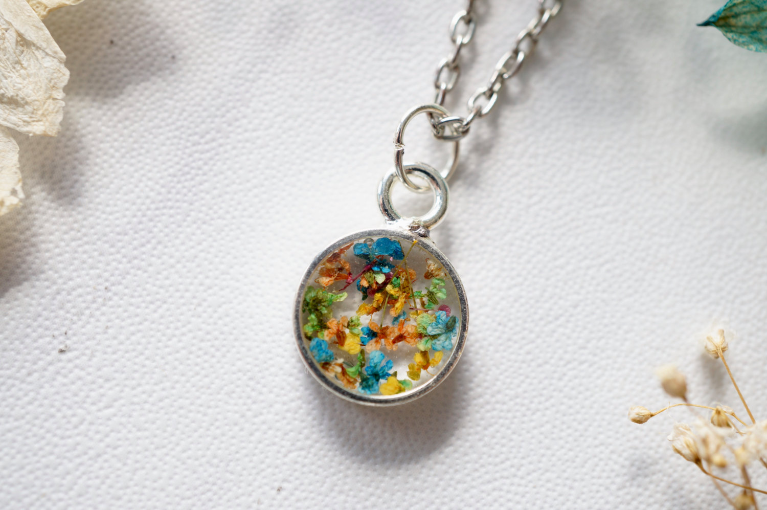 Real Dried Flowers in Resin Necklace in Blue Green Orange Yellow Mix