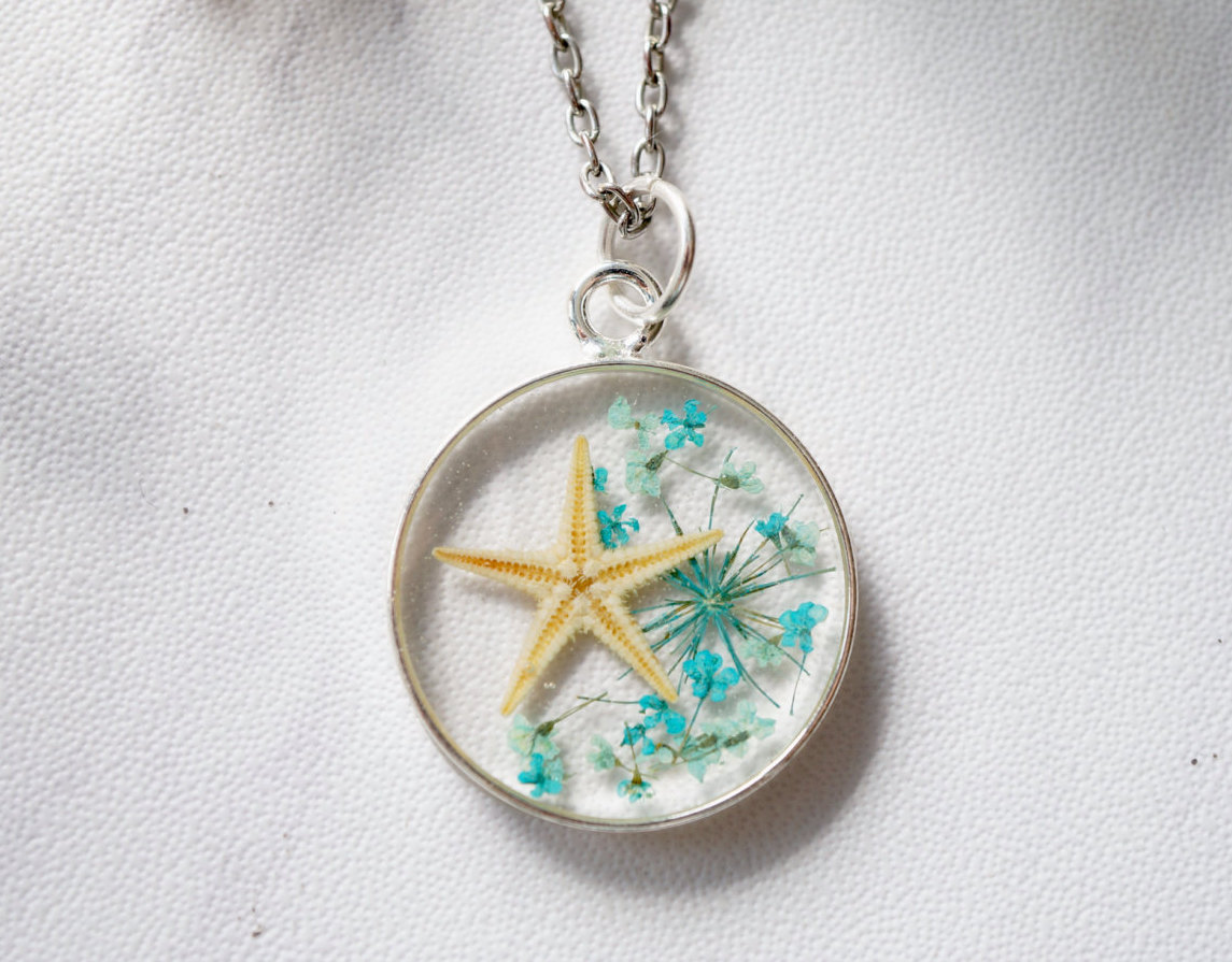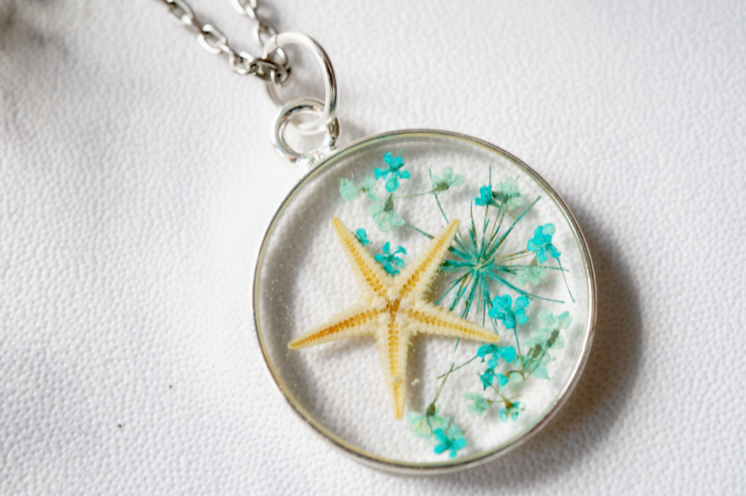 Real Starfish and Pressed Flower in Resin Necklace in Blues Mix