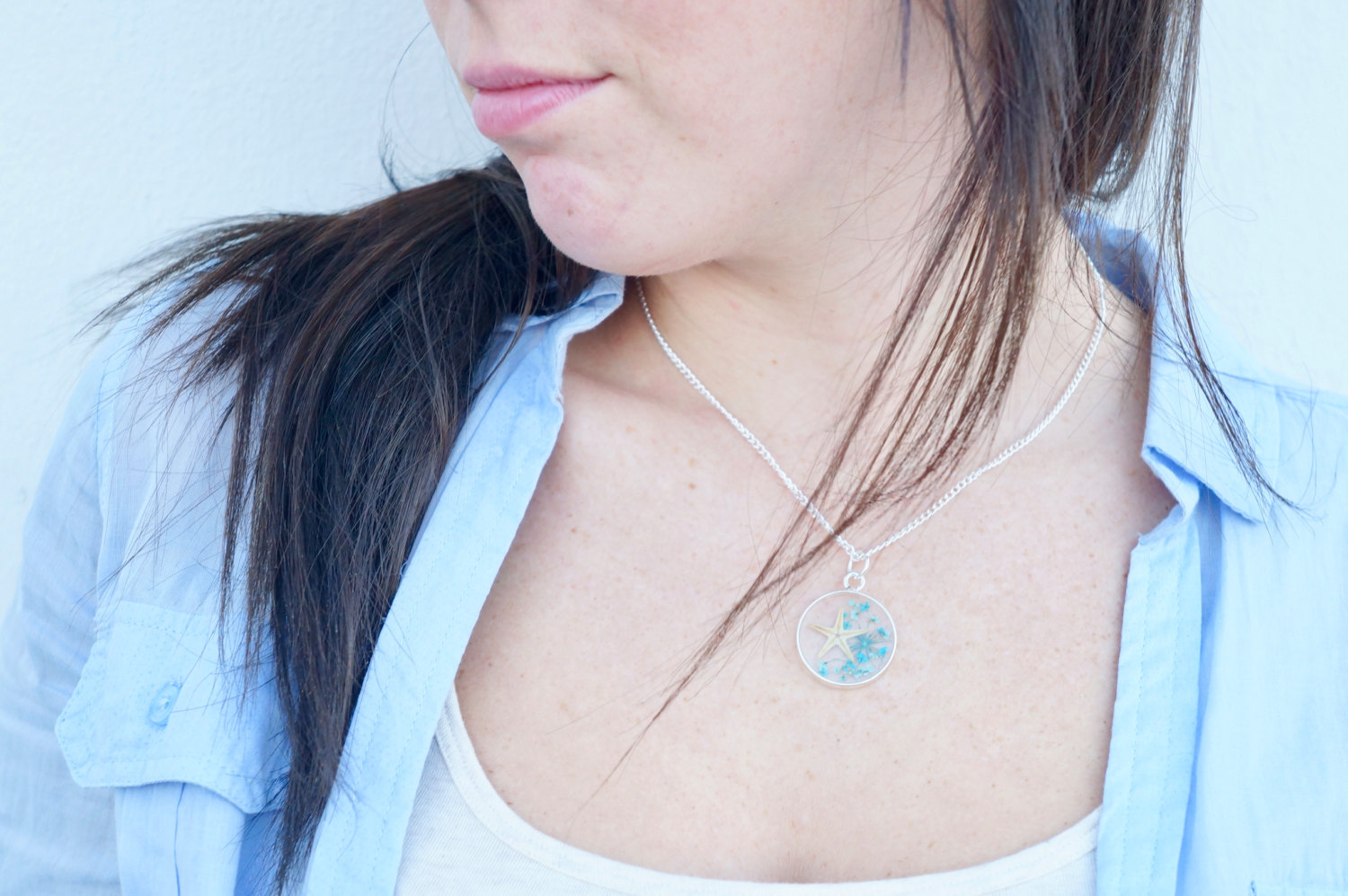 This necklace is handmade with real pressed flowers and a real dried starfish encased in resin. Surrounded by a beautiful metal silver frame, this necklace is like wearing a piece of nature. Each piece is one of a kind. Sometimes we will use the same color combination, but no two are exactly alike!