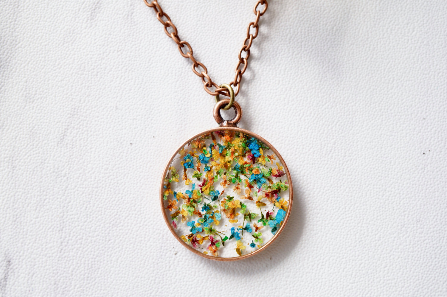 These necklaces are handmade with real pressed flowers encased in resin. Surrounded by a beautiful metal bronze frame, this necklace is like wearing a piece of nature. Each piece is one of a kind. Sometimes we will use the same color combination, but no two are exactly alike!