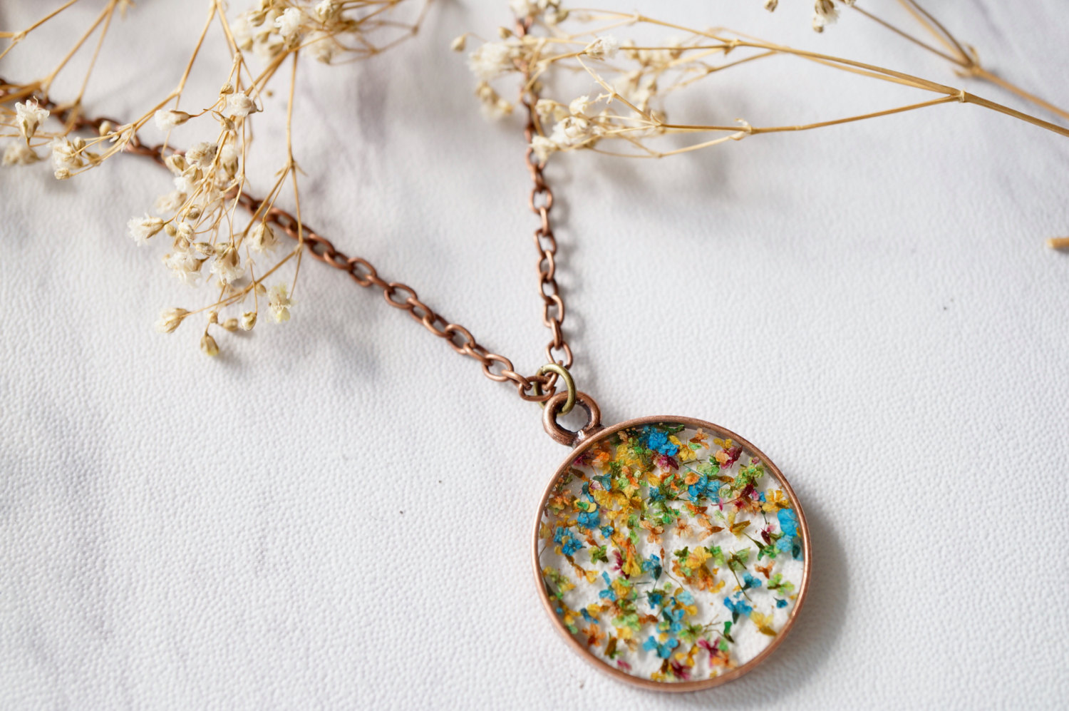 Real Pressed Flower and Resin Necklace in Oranges, Yellows, Greens, Blues, and Pinks