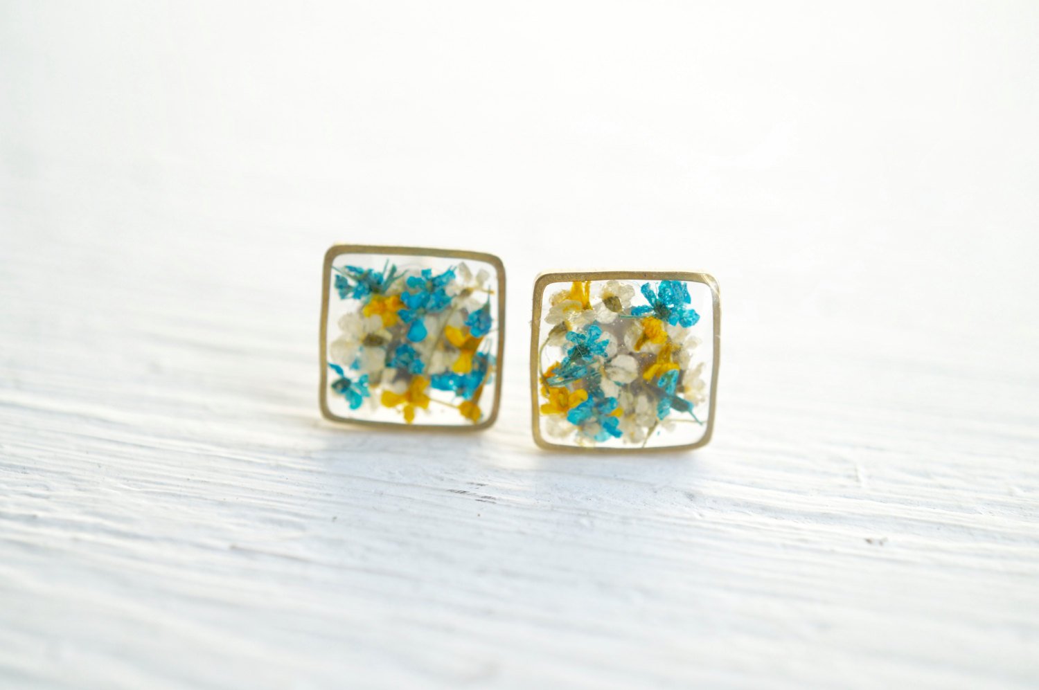 Real Pressed Flower and Resin Stud Earrings in Blues, Yellows, and White mix