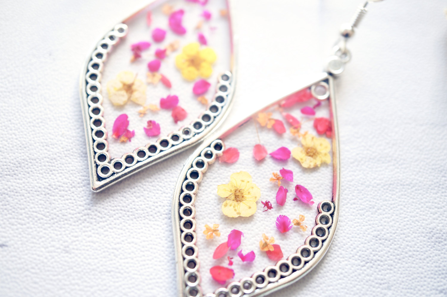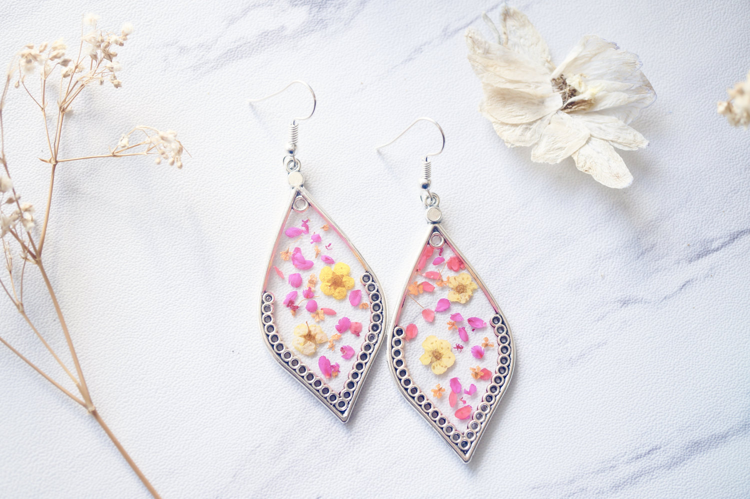 These earrings are handmade with real pressed flowers encased in resin. Surrounded by a beautiful silver frame, these earrings are like wearing a piece of nature. Ear hooks are nickel free zinc alloy, great for sensitive ears.