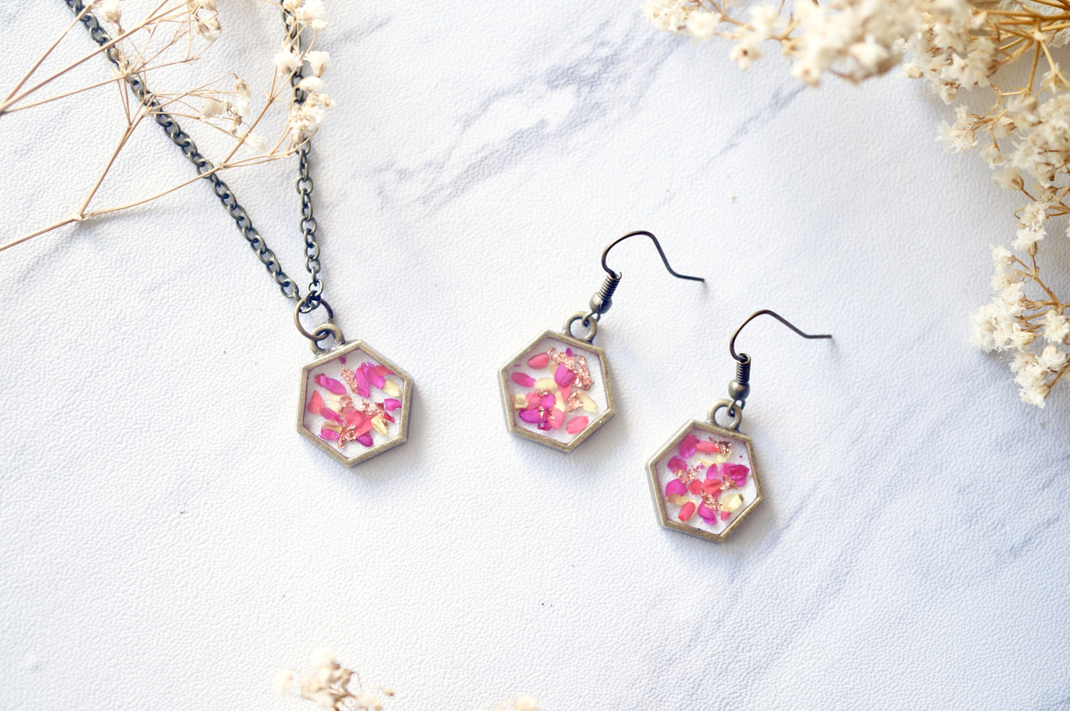 These earrings are handmade with real pressed flowers encased in resin. Surrounded by a beautiful antiqued bronze hexagon shapes metal frame, these earrings are like wearing a piece of nature. Ear hooks are nickel free zinc alloy, great for sensitive ears.