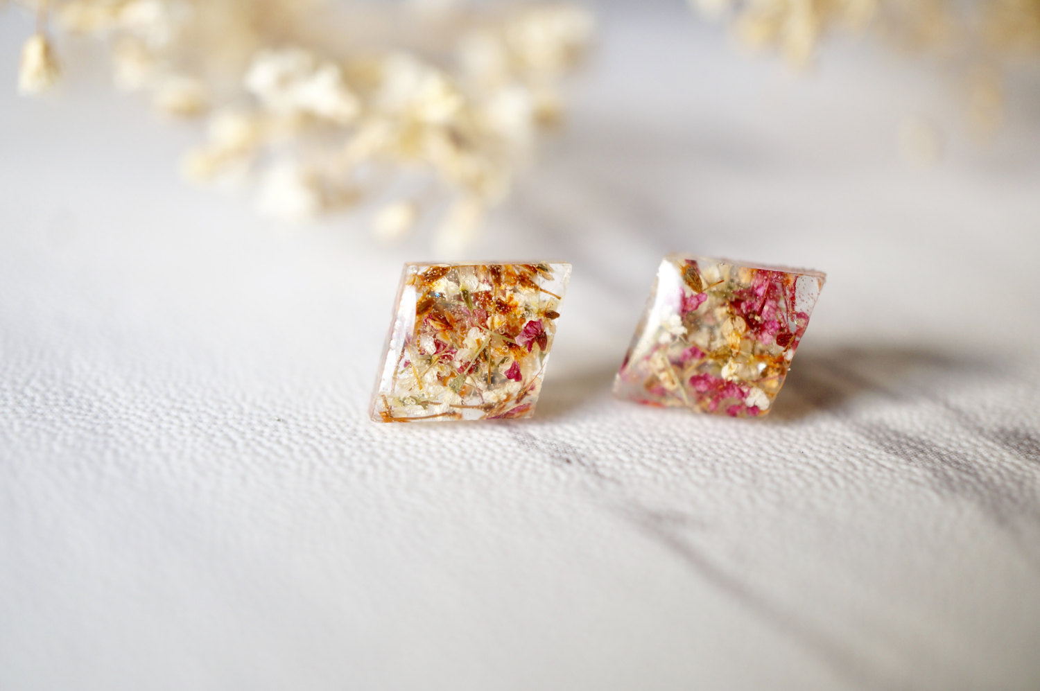 Real Dried Flowers and Resin Diamond Stud Earrings in Orange Rose White