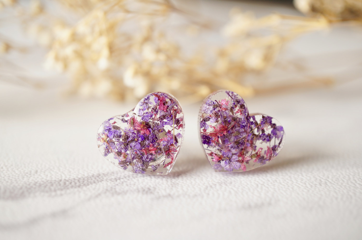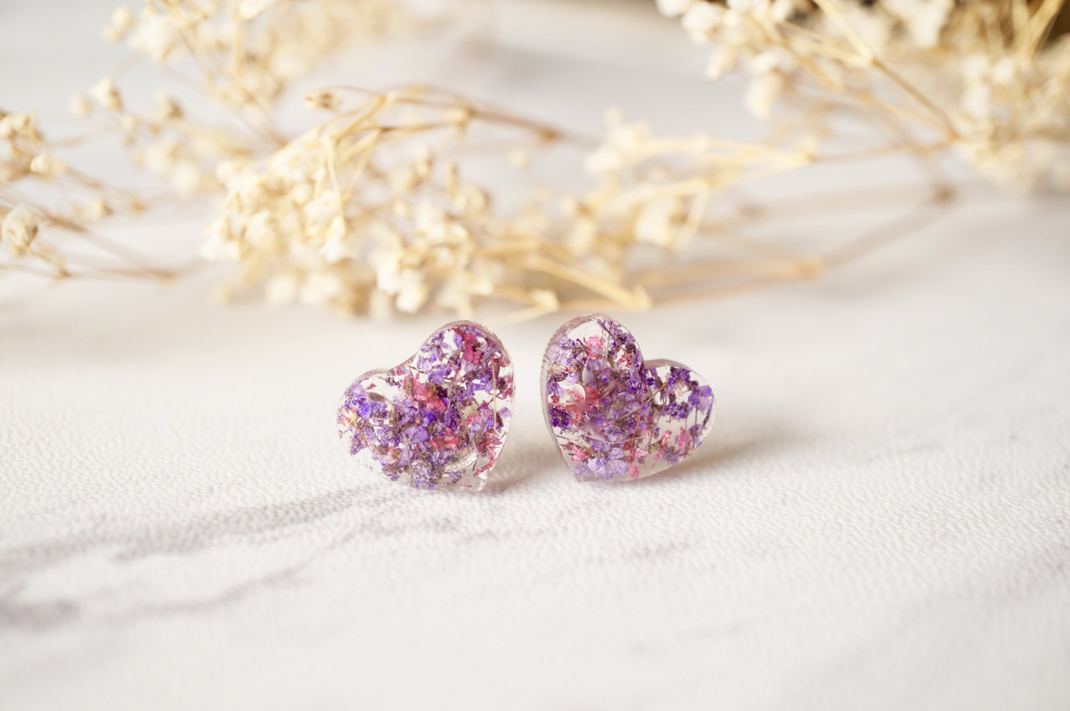 Real Dried Flowers and Resin Heart Stud Earrings in Purple and Rose