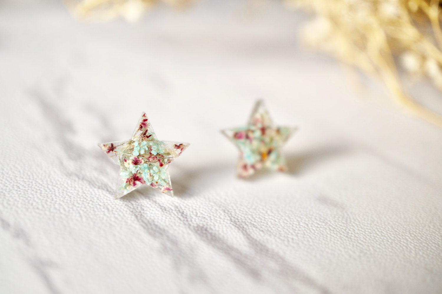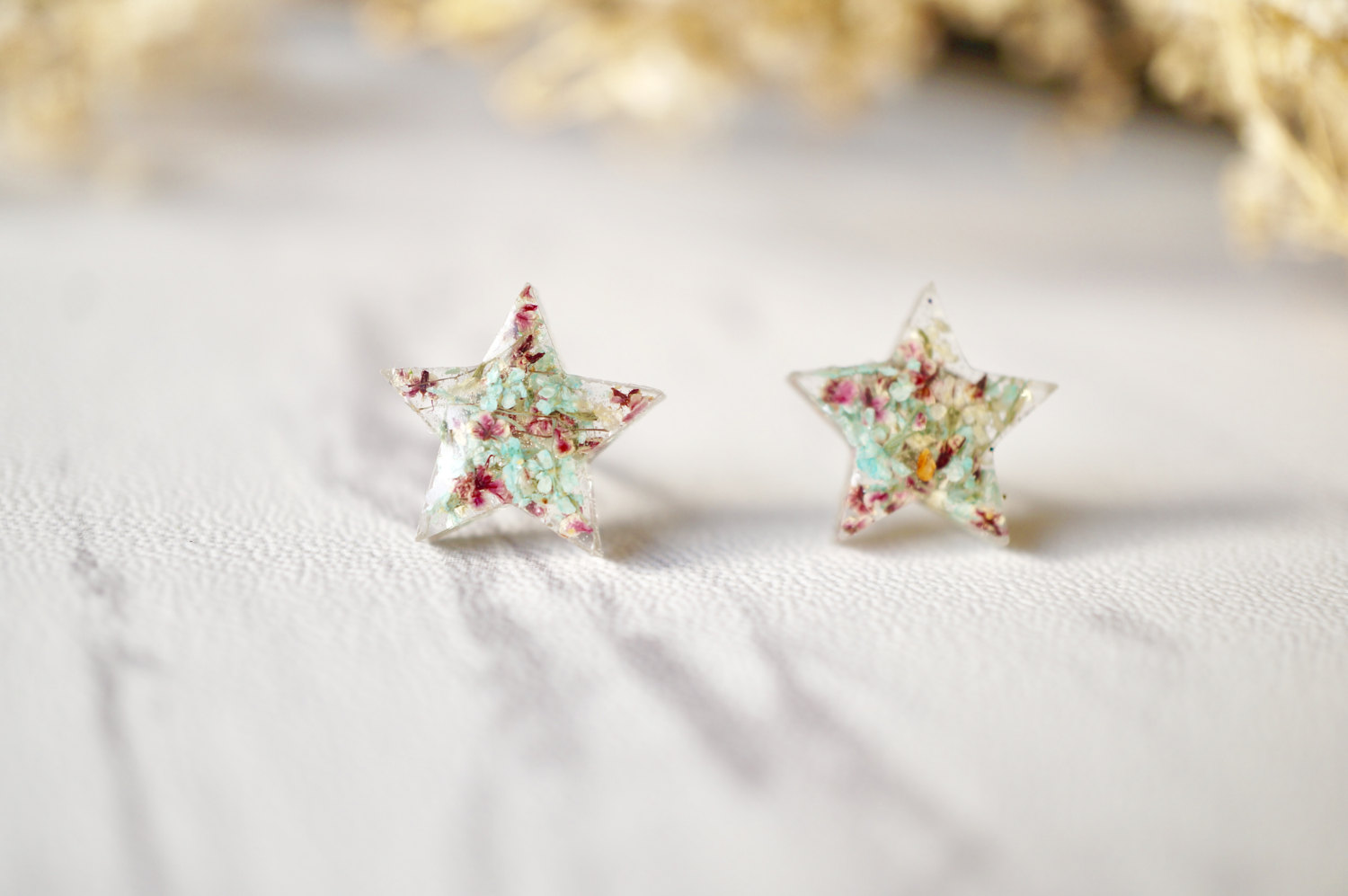 Real Dried Flowers and Resin Star Stud Earrings in Mint and Rose