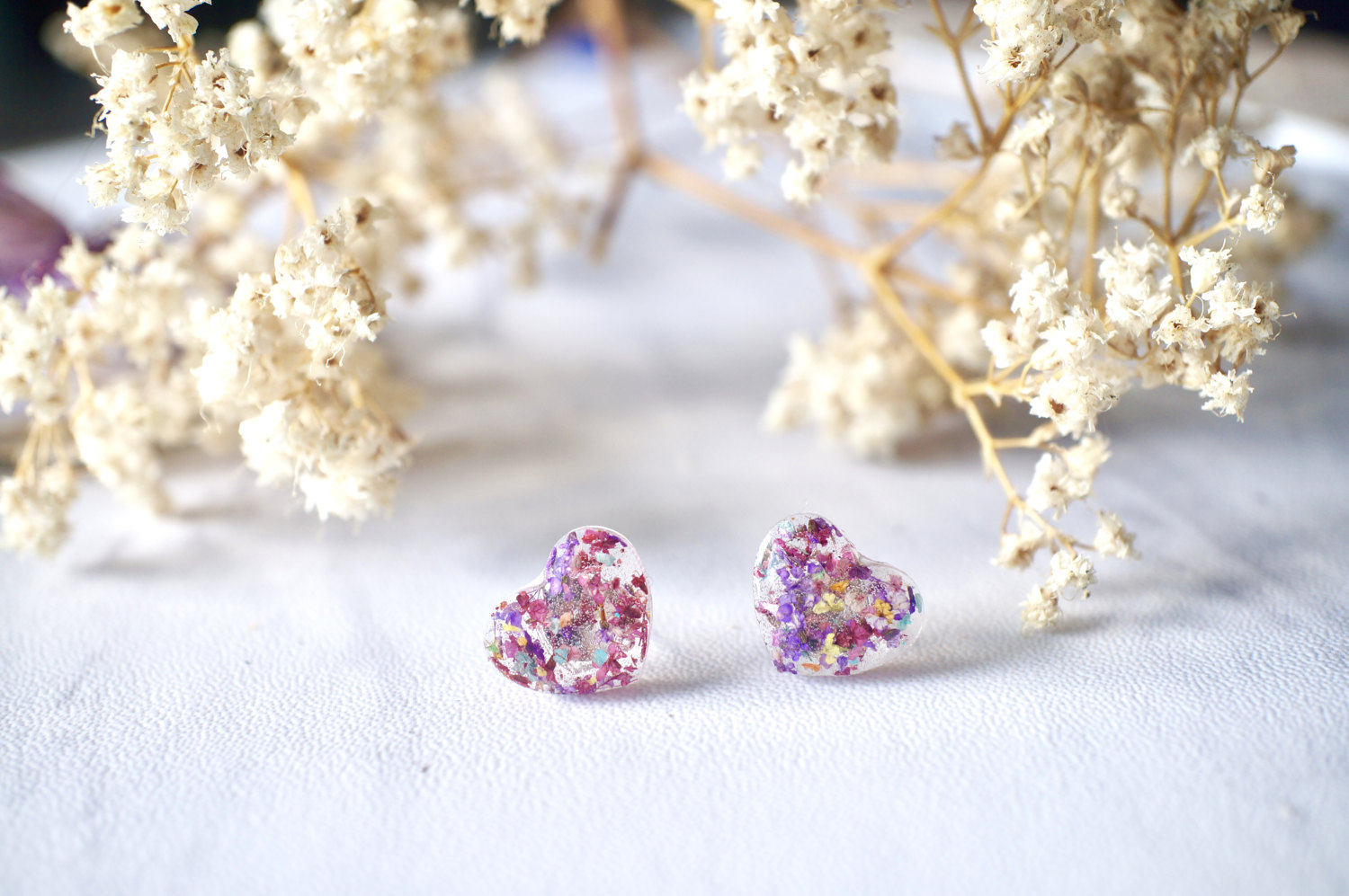 Real Dried Flowers and Resin Heart Stud Earrings in Purple Mix
